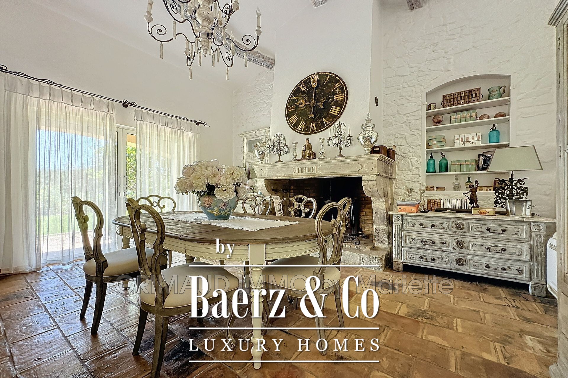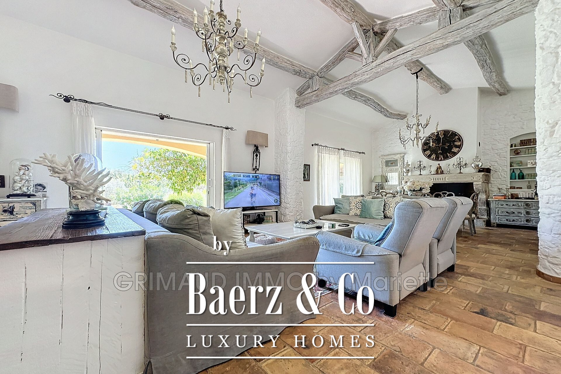 Single-story villa on 2,900m² of fenced garden with heated pool, overlooking the vineyards and within walking distance of the village of Grimaud, two detached garages and two garages attached to the house, a large carport comprising: entrance, guest toilet, a spacious living room with exposed beams and a large fireplace,