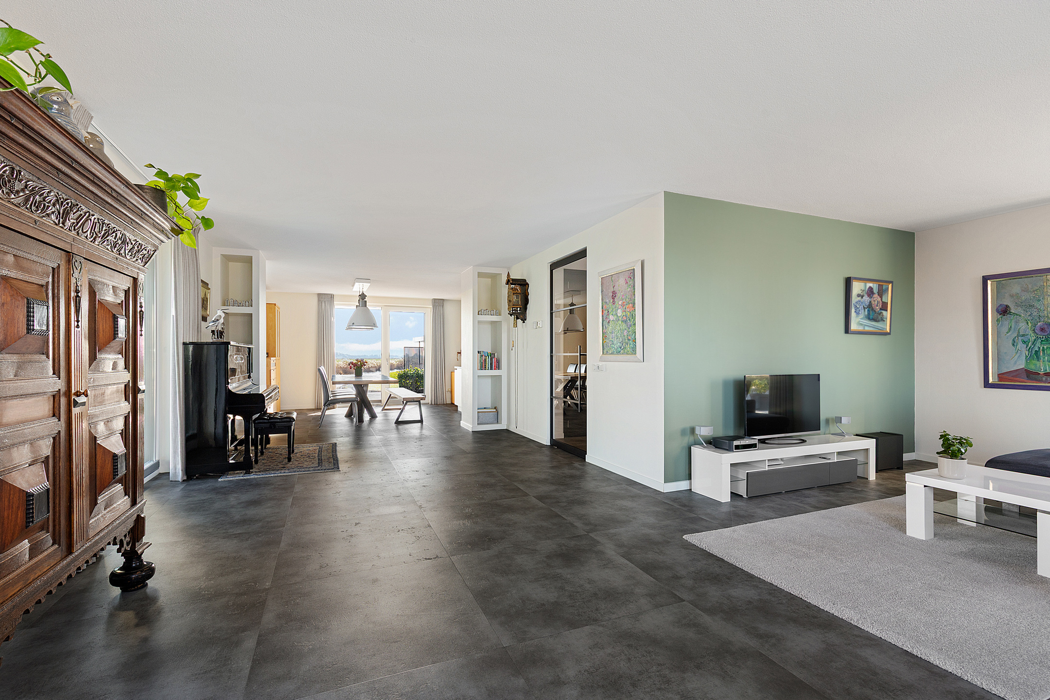 The living room is expansive and bright, with large windows all around, maximizing the breathtaking views. Whether relaxing on the sofa, sitting in the armchair, enjoying the long dining table, or cooking in the kitchen, you feel immersed in nature.