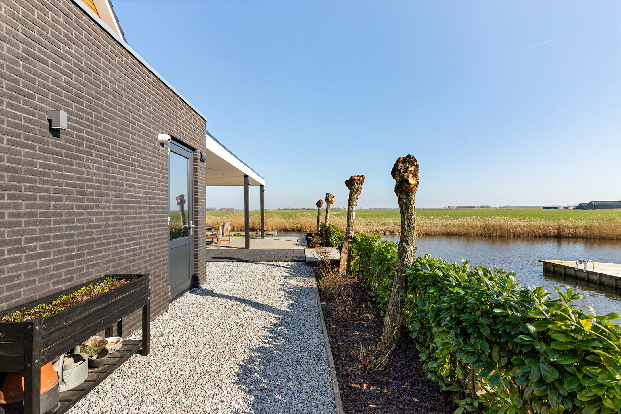 Thanks to the corner location on the water, the property enjoys a generous sun deck flanked by two luxury mooring docks, one with a swimming ladder. The enclosed stylish outdoor shower is a welcome addition for swimmers. The water in front of the property is calm, partly private, and connects directly to the Bolswardervaart.