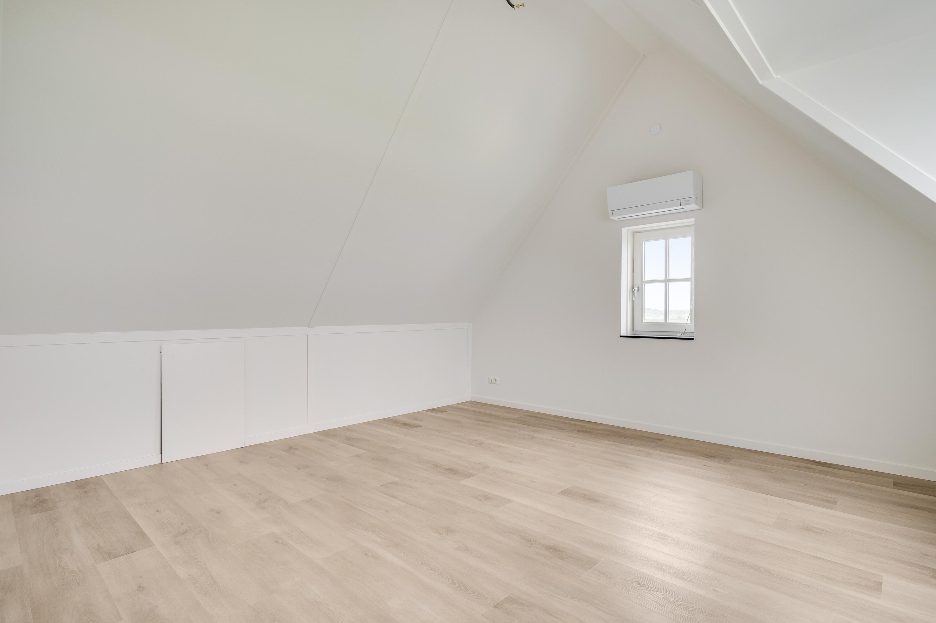 On the L-shaped second floor with high ceilings and a dormer window you will find bedroom 3 and 4. Both rooms are spacious and overlook the water. The third bathroom is also located here, which has a walk-in shower, sink and toilet. Finally, you will find the technical room here, where you will also find white goods connections.