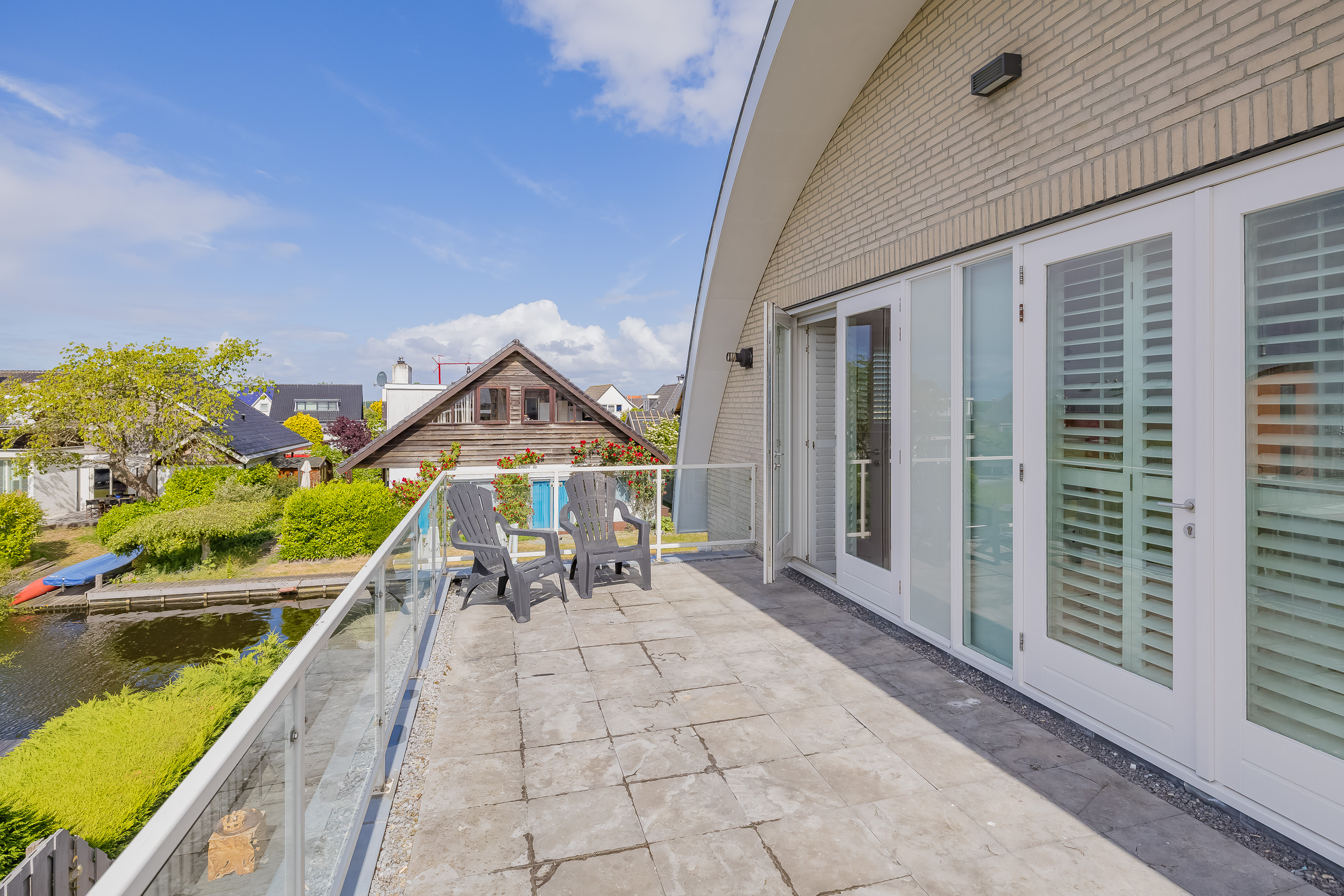 The plastic deck terrace at the rear has several seating areas and a jetty for direct access to the water of the Kagerplassen. Here you can enjoy the view, the evening sun and sail to the open water in no time.
