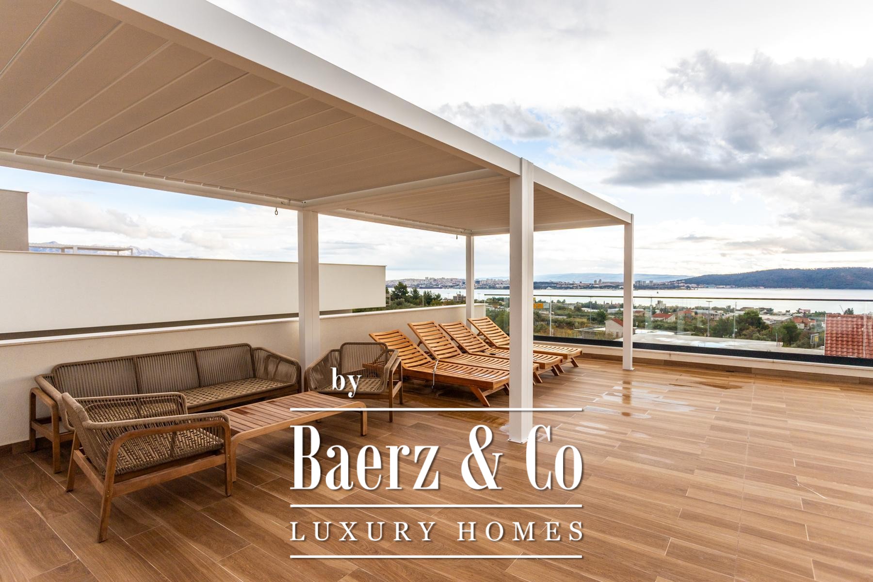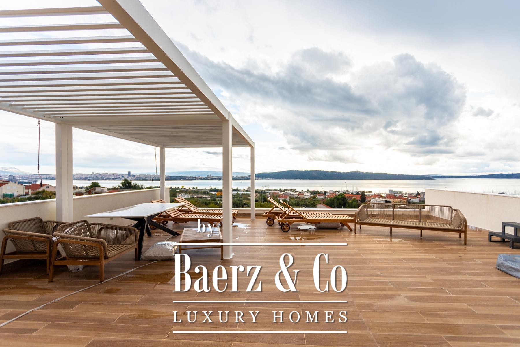 Villa Kaštela stands between Split and the airport, part of a newer enclave of exclusive residences. This villa, with a living area of 300 m² on a 550 m² plot, offers a quiet yet connected retreat in coastal Croatia. The home extends over three levels. The ground floor is designed for open living with a fully equipped kitchen, seamlessly connecting to the terrace and garden. Practical needs are met through a shared toilet, laundry, storage and a sauna at the rear. Upstairs, four bedrooms each enjoy the privacy of an en-suite bathroom. On the top floor, a generous roof terrace features a jacuzzi, barbecue and sheltered lounge, capturing afternoon sun and soft breezes. Every room benefits from underfloor heating and individual air conditioning. The setting balances the privacy of a secure villa complex with swift access to city culture and international travel. Villa Kaštela for sale is an invitation to a lifestyle shaped by light, thoughtful design and ease.