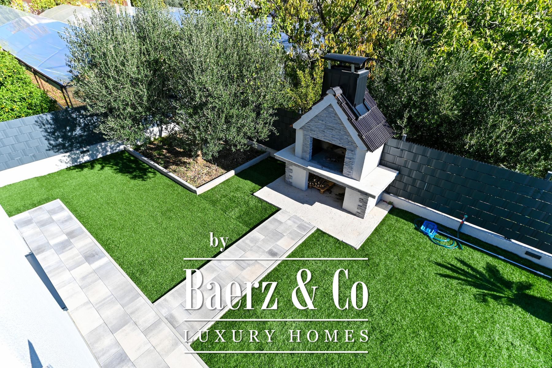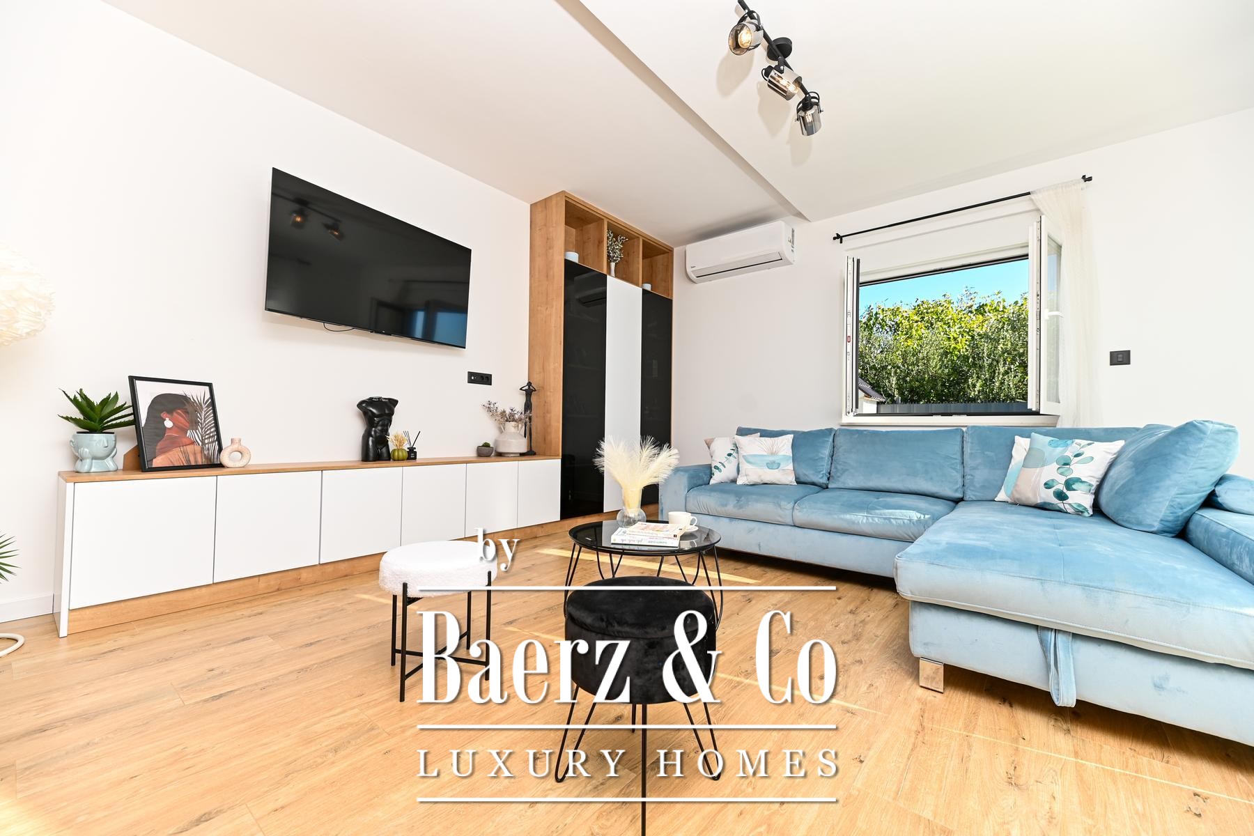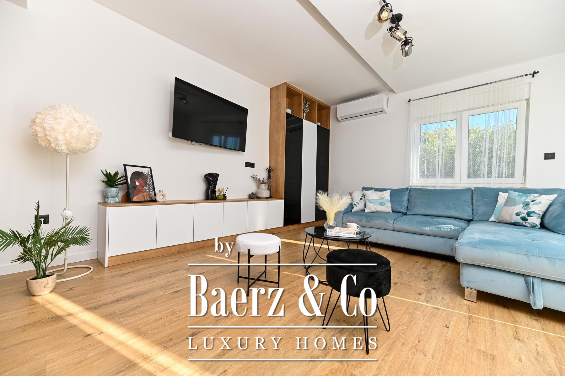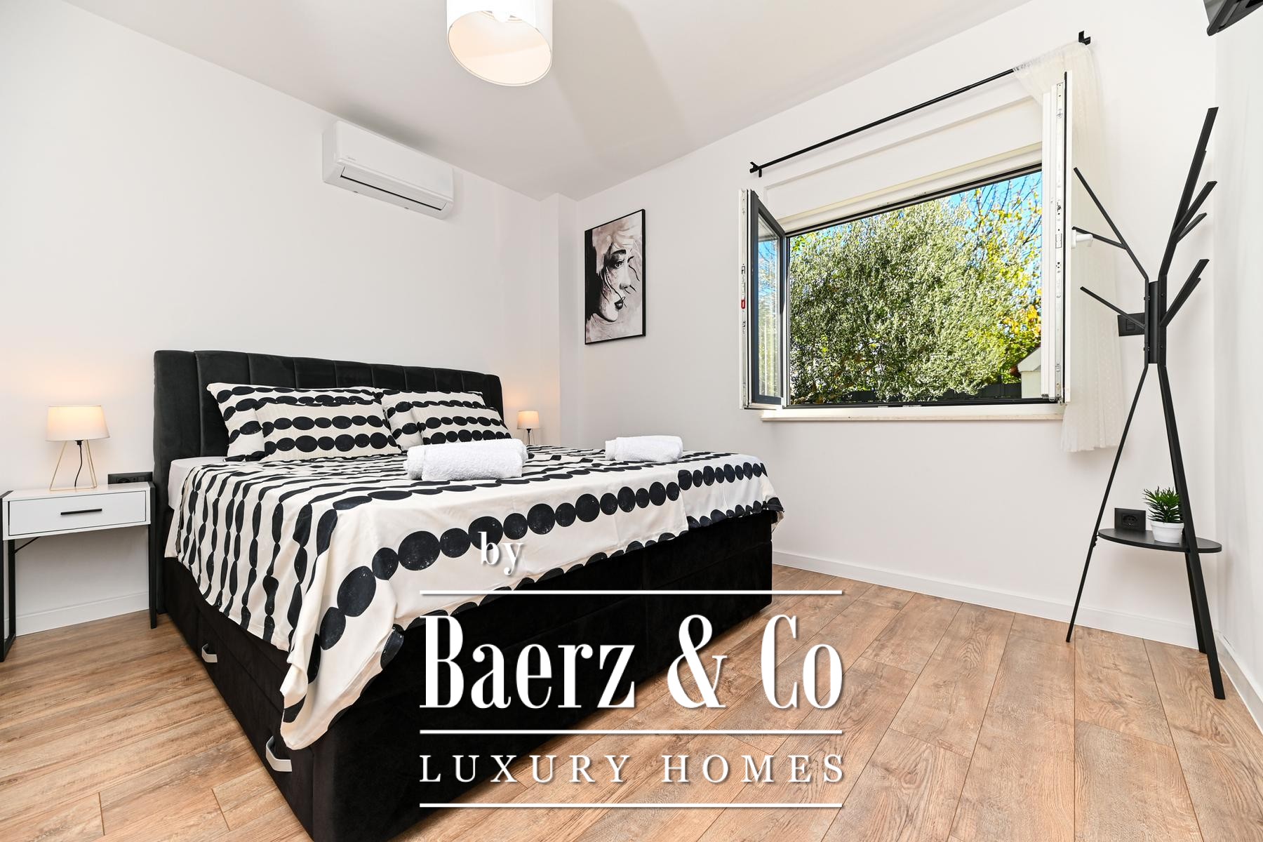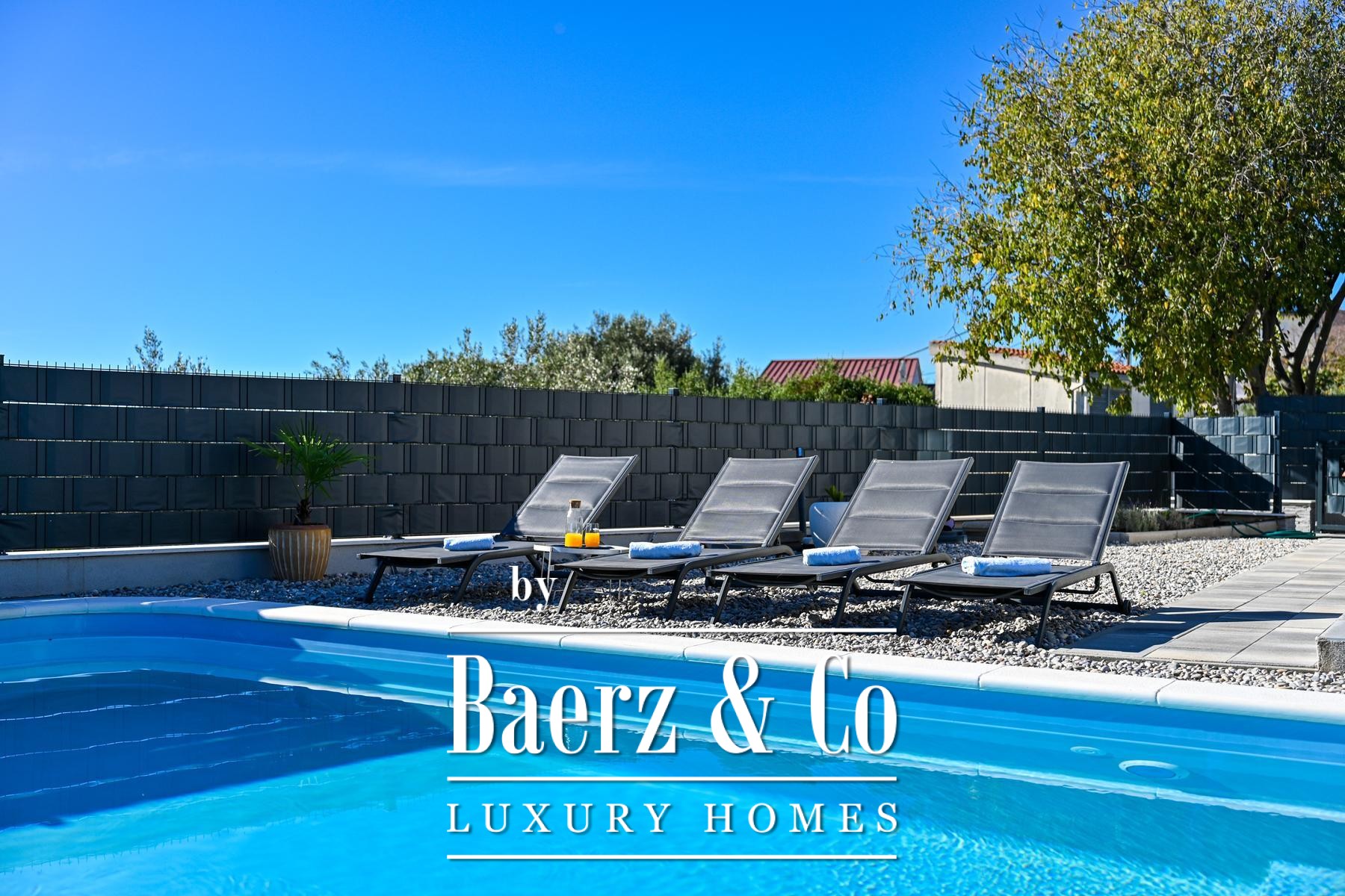 Outdoors, the fully fenced and landscaped garden features a serene swimming pool, sunbathing area, social space, and a barbecue, all designed for both privacy and convivial gatherings. The residence is situated in a desirable, accessible setting, with all necessary amenities conveniently nearby. This modern house Kaštela balances thoughtful architecture and refined outdoor living, enhancing everyday life by the Adriatic.