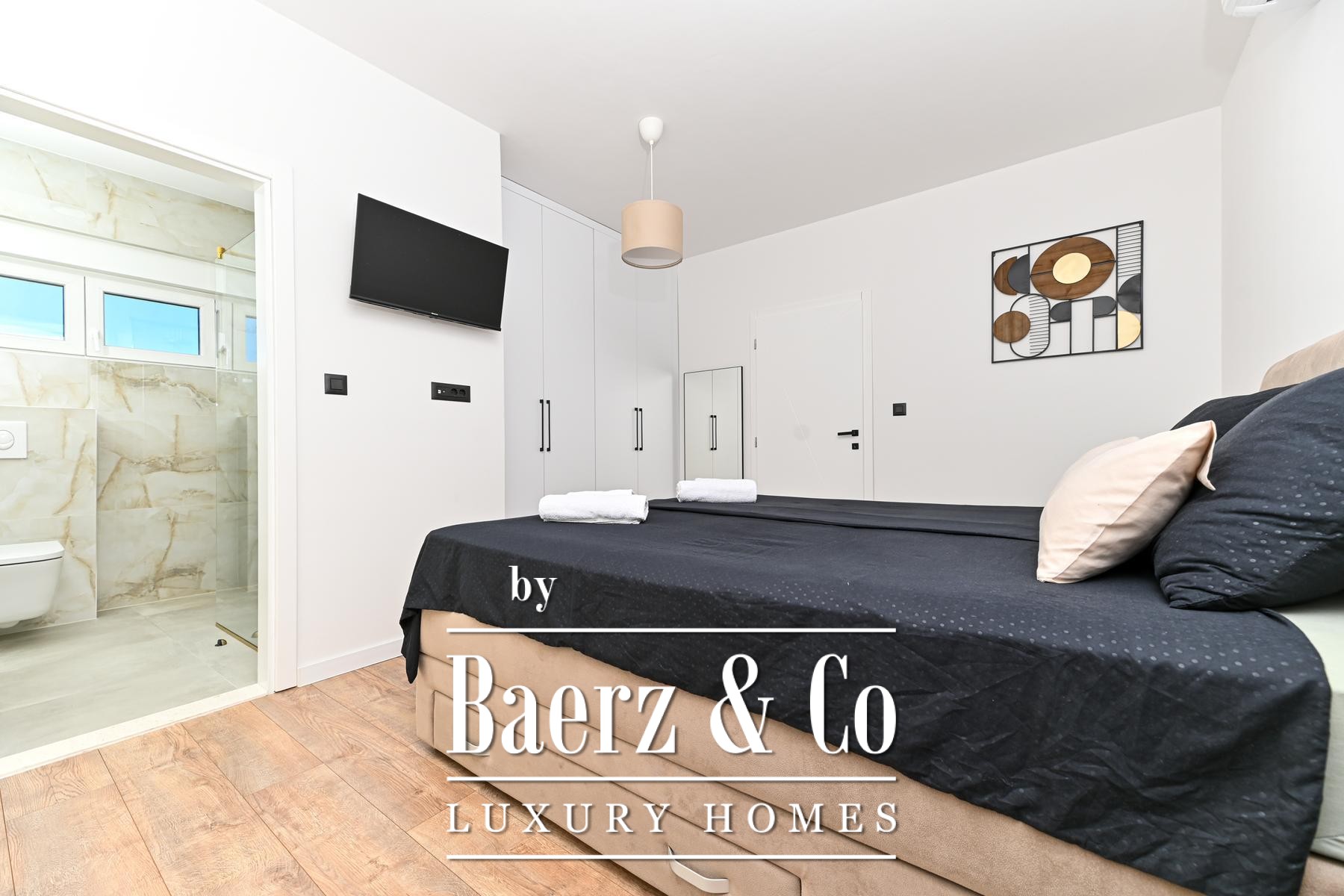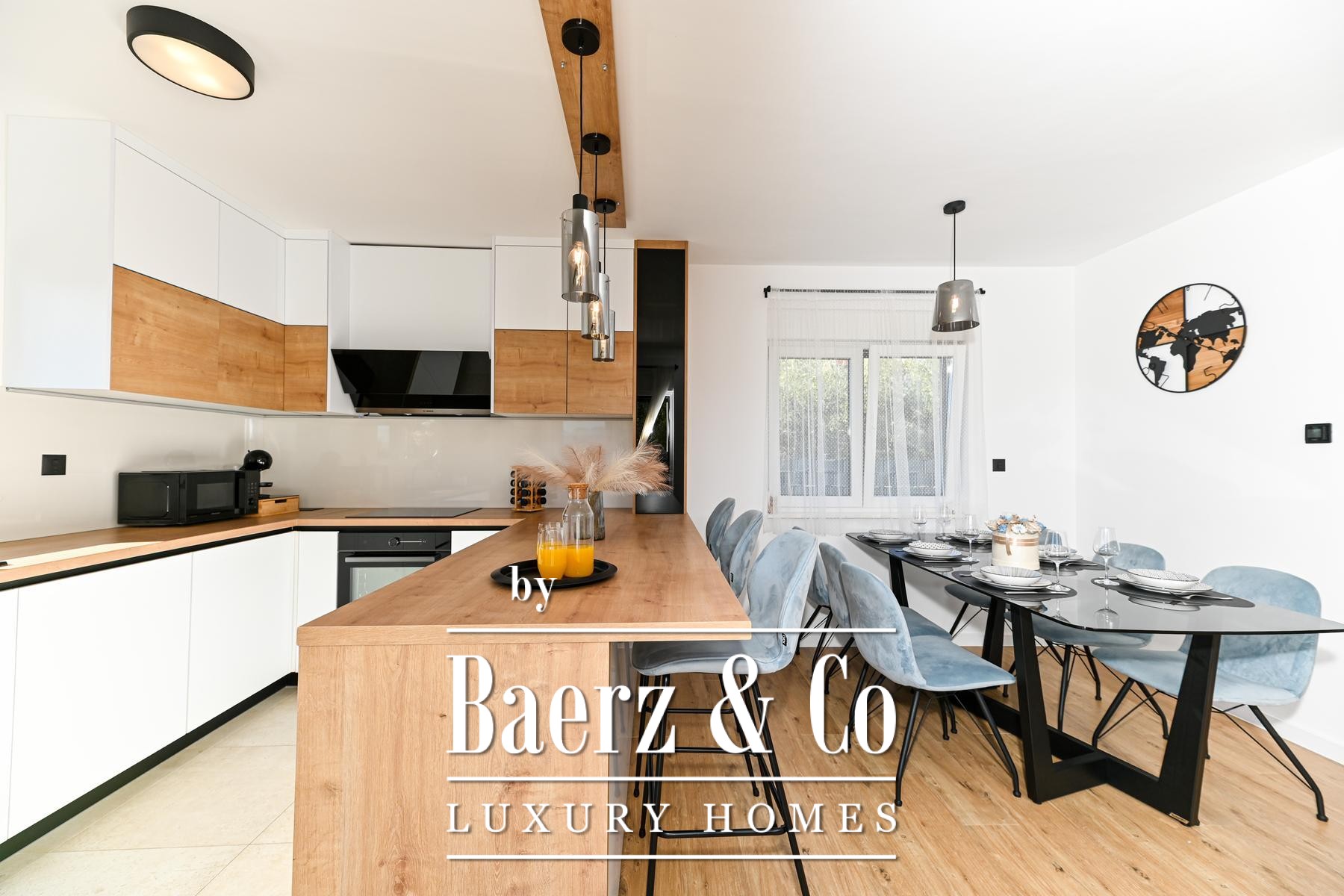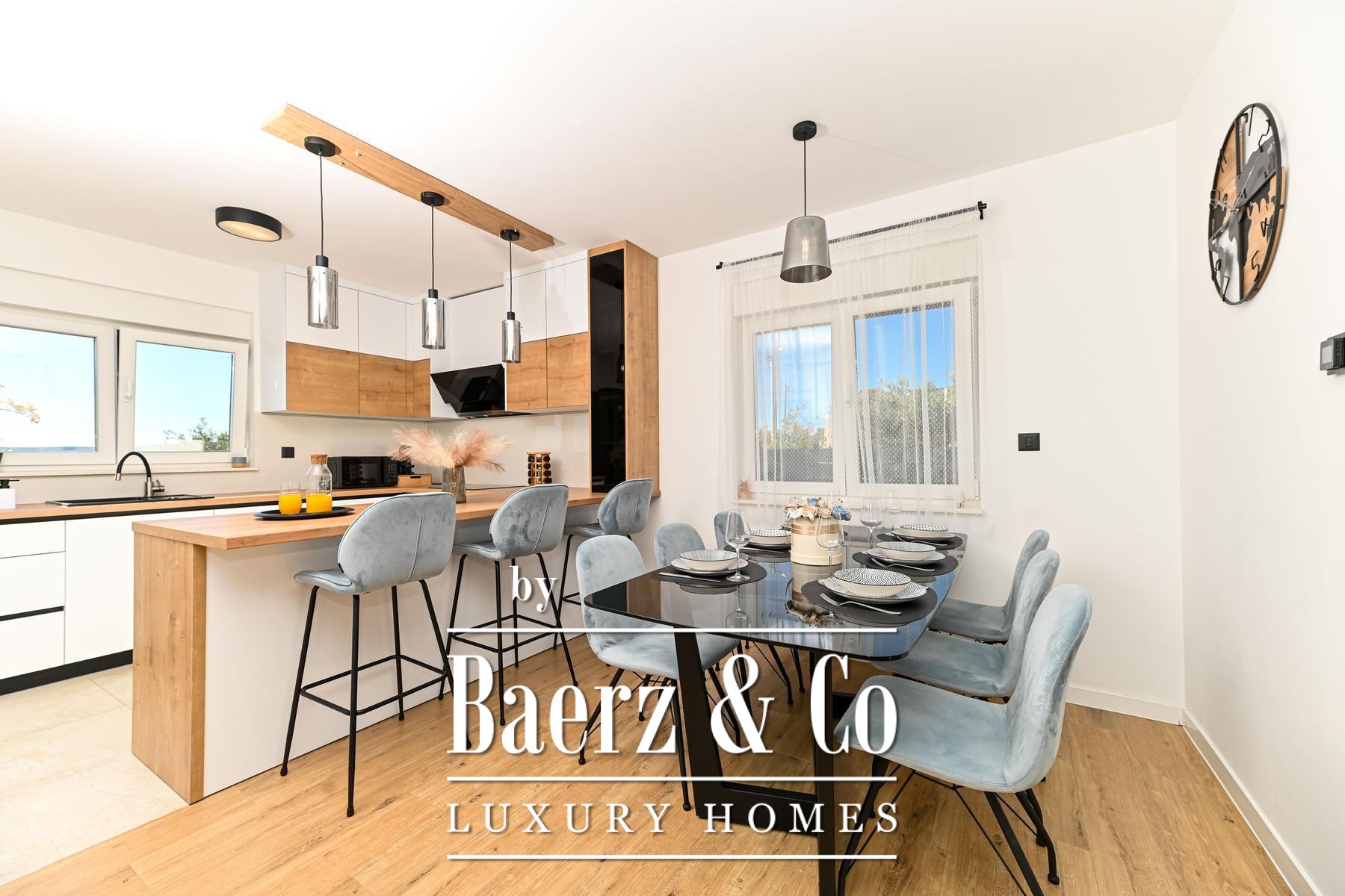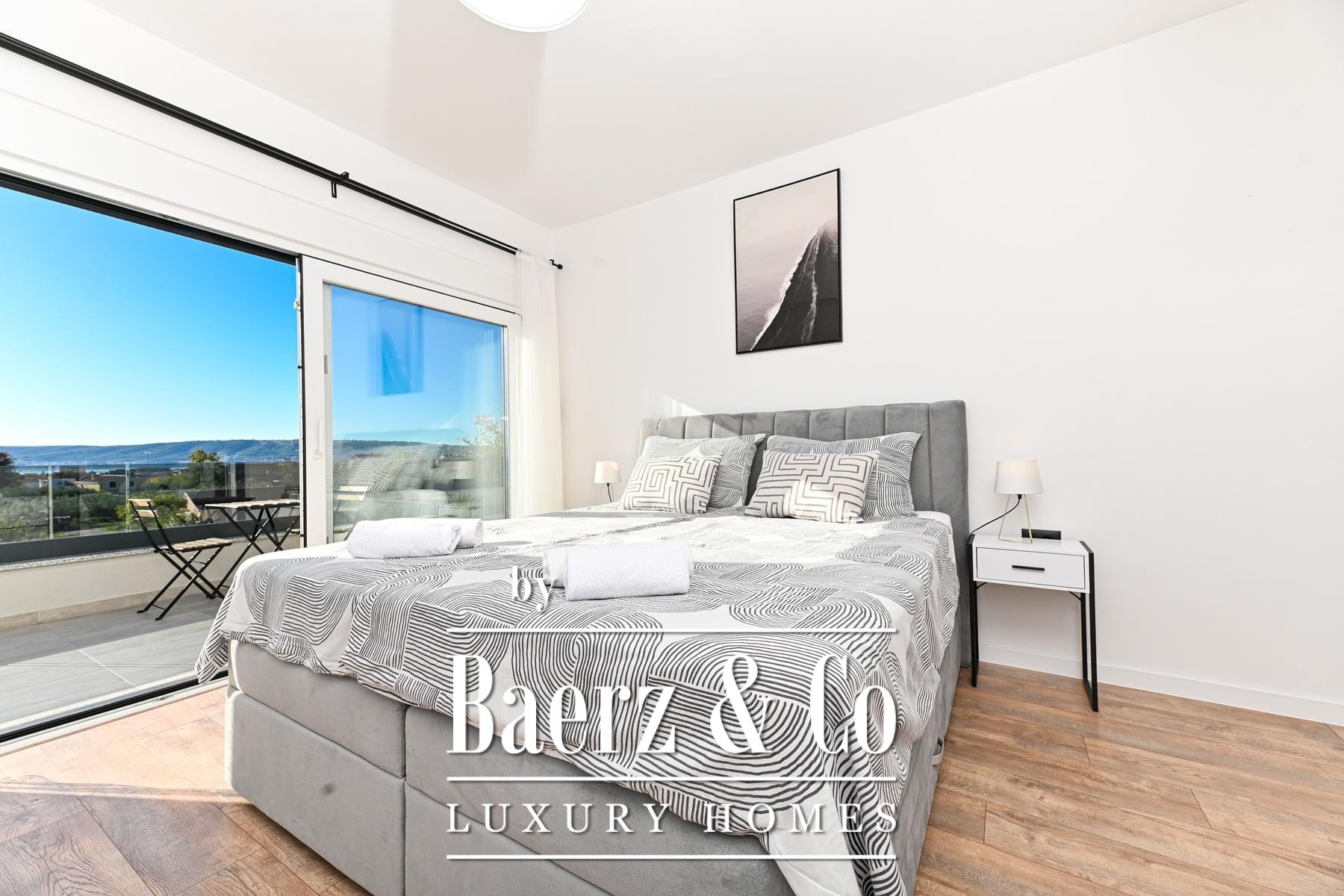 Modern house Kaštela offers an elevated standard of living in Croatia. Set on a 490 m² plot and crafted in 2025, this contemporary home encompasses 160 m² distributed elegantly across two floors. The ground level reveals a fully equipped kitchen with dining area, an open living room, laundry room, guest toilet, and a bedroom with private bathroom. Ascend to the first floor and find two additional bedrooms, each with an en suite bathroom, and access to a spacious terrace with a panoramic sea view—an ideal escape at any time of day.