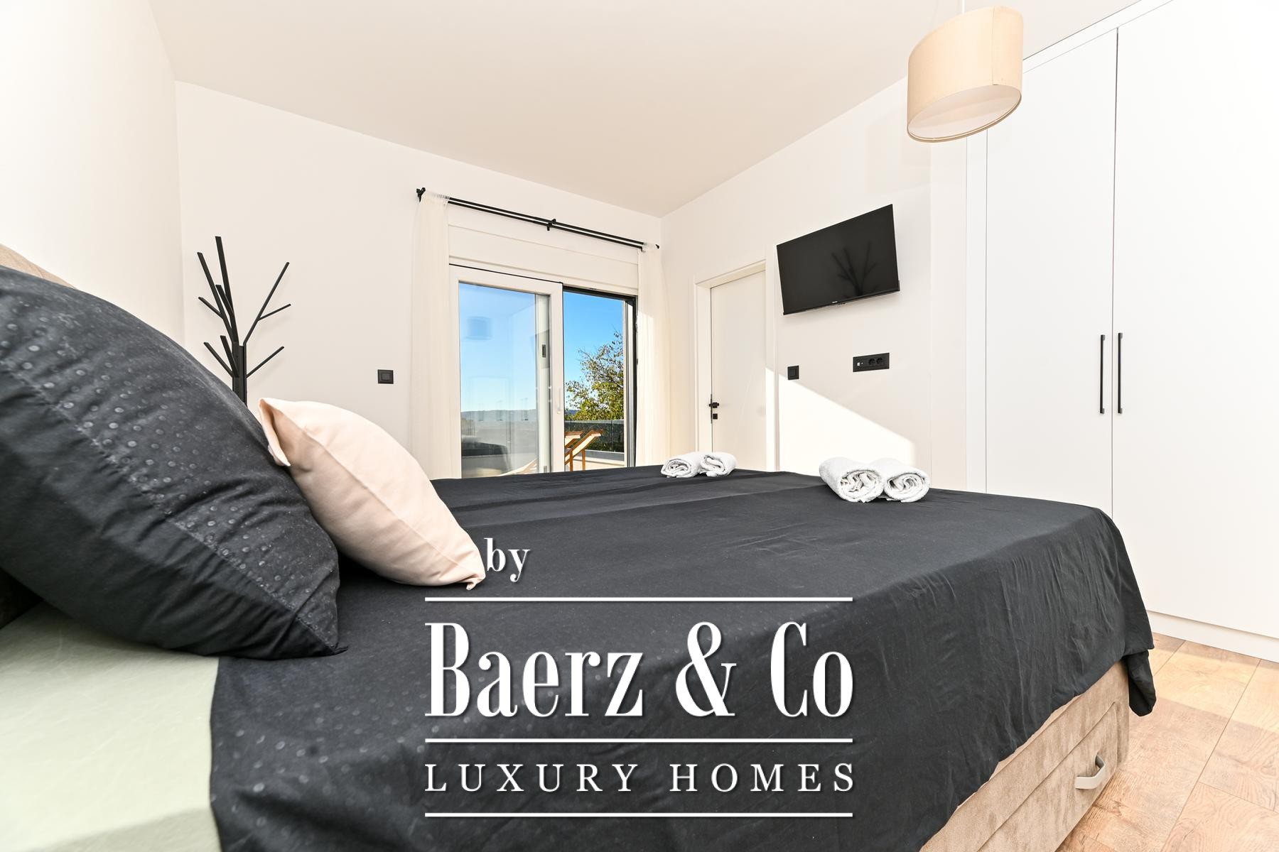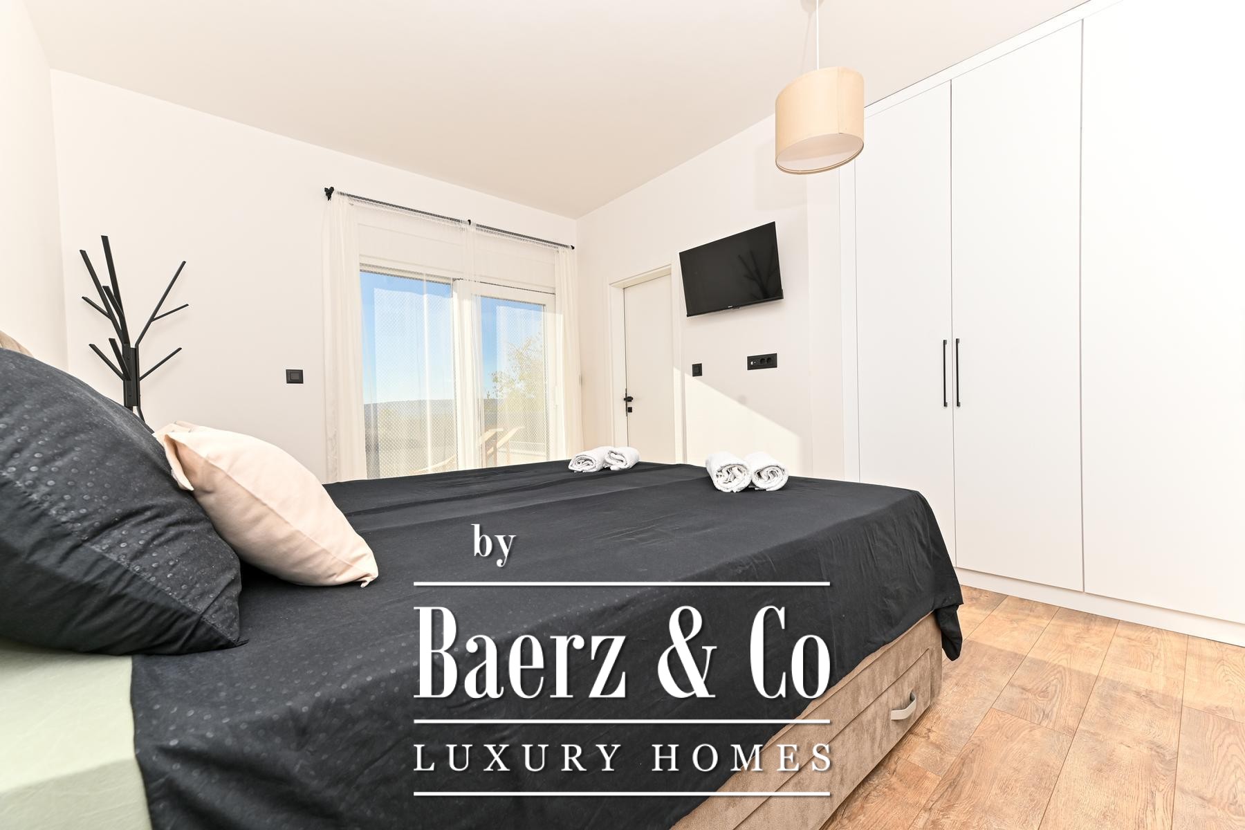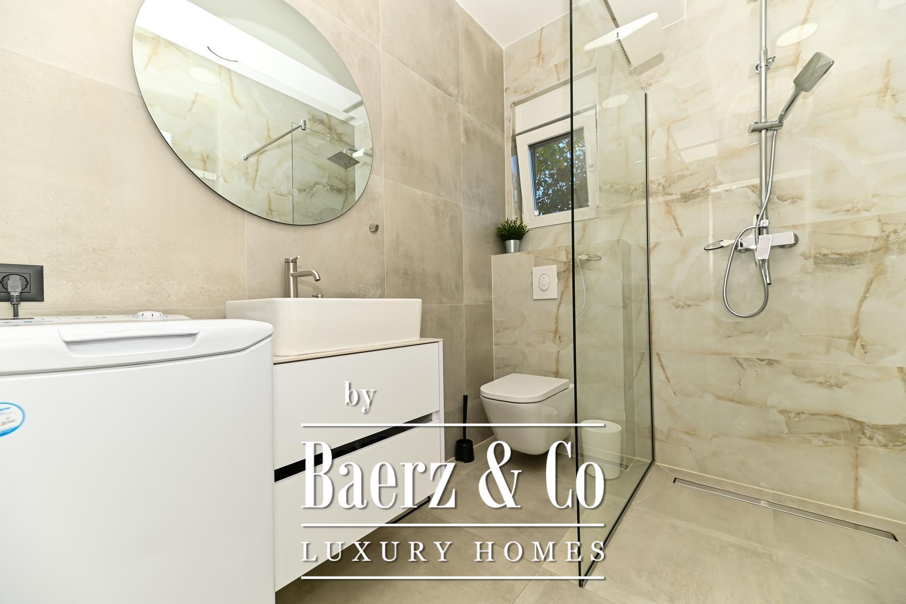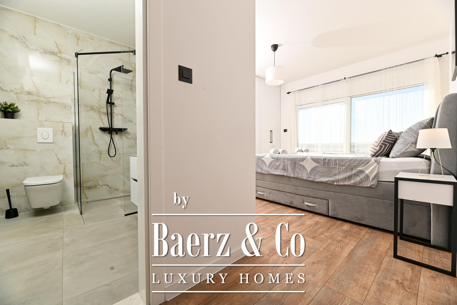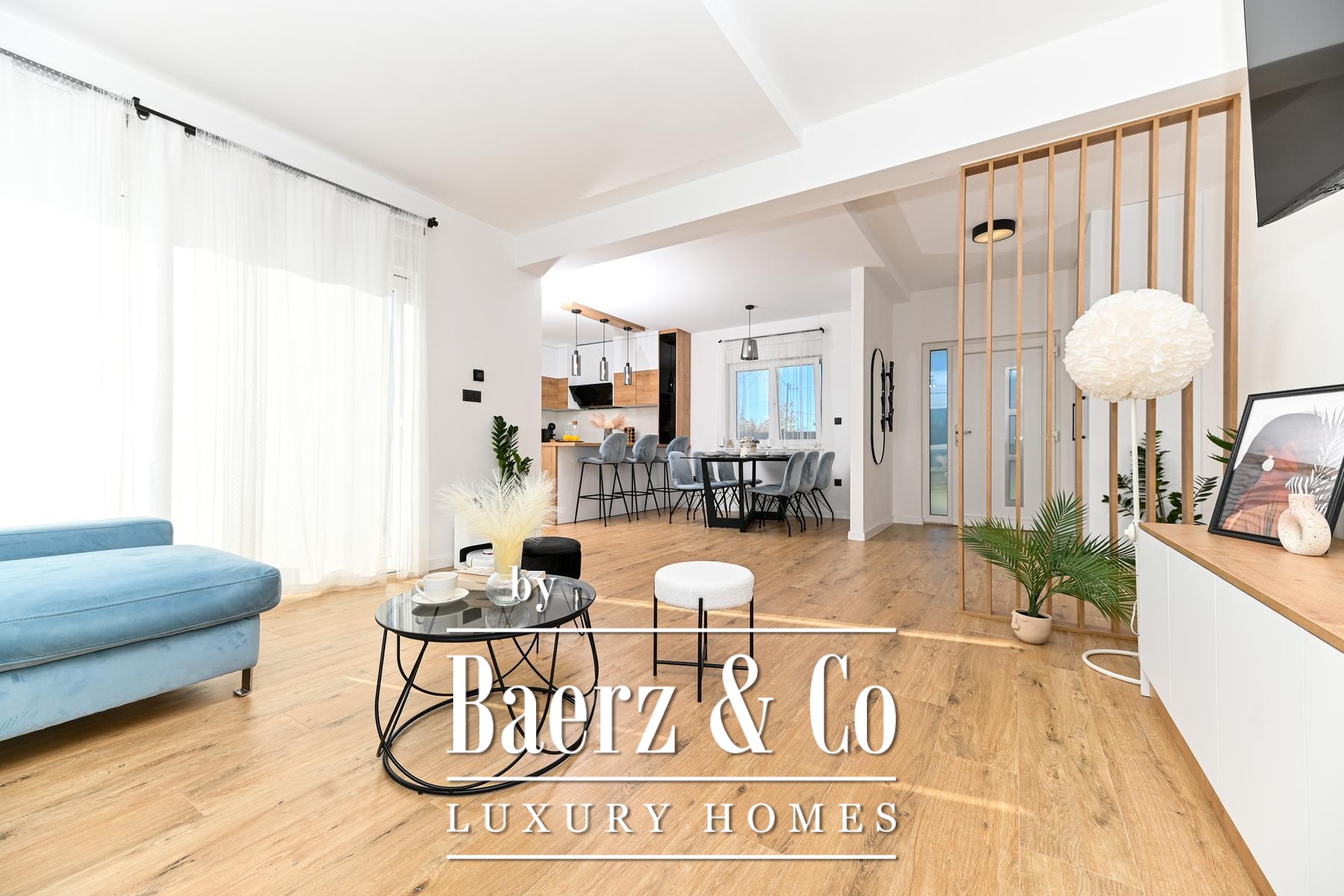 Modern house Kaštela offers an elevated standard of living in Croatia. Set on a 490 m² plot and crafted in 2025, this contemporary home encompasses 160 m² distributed elegantly across two floors. The ground level reveals a fully equipped kitchen with dining area, an open living room, laundry room, guest toilet, and a bedroom with private bathroom. Ascend to the first floor and find two additional bedrooms, each with an en suite bathroom, and access to a spacious terrace with a panoramic sea view—an ideal escape at any time of day.
