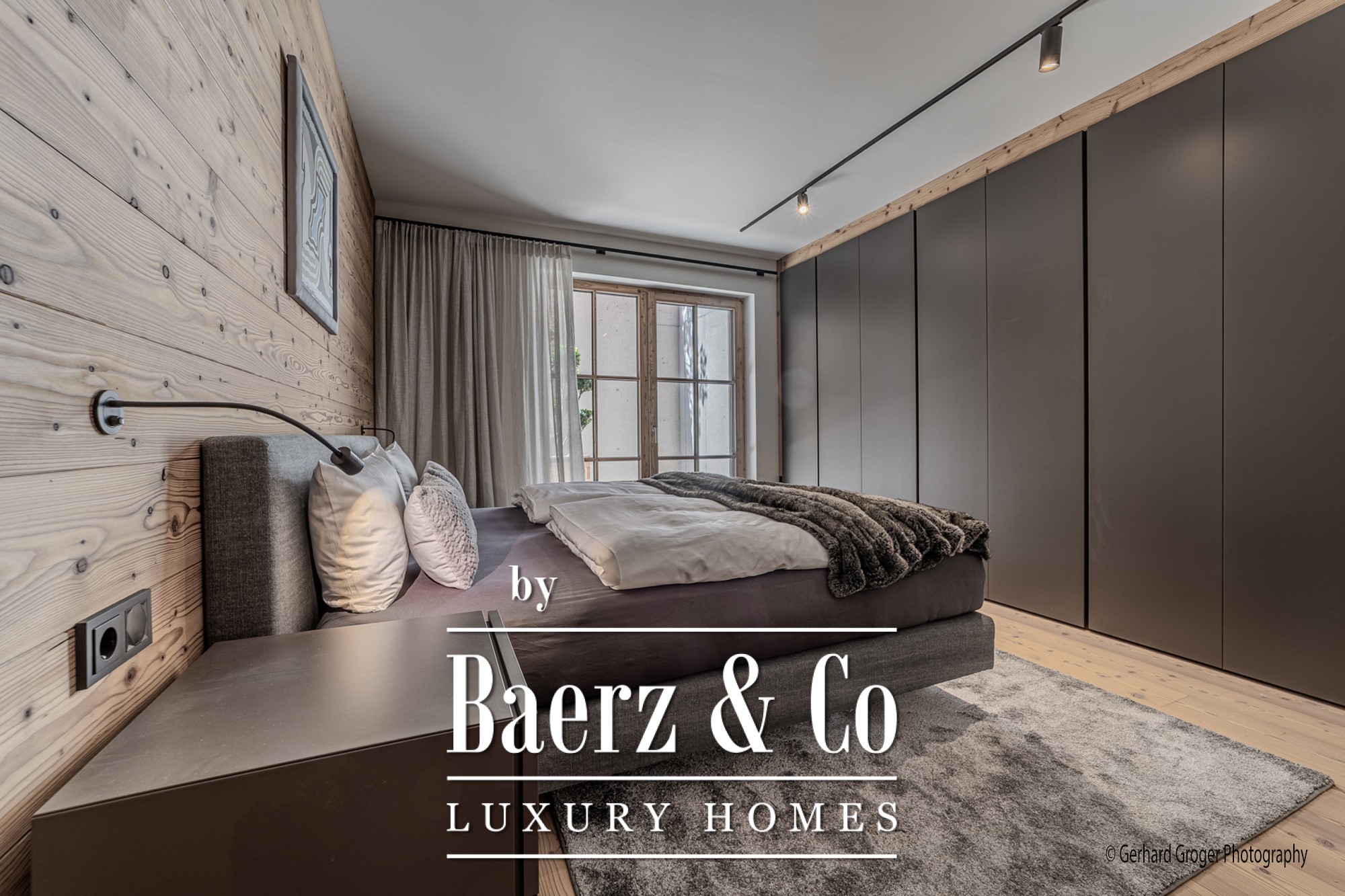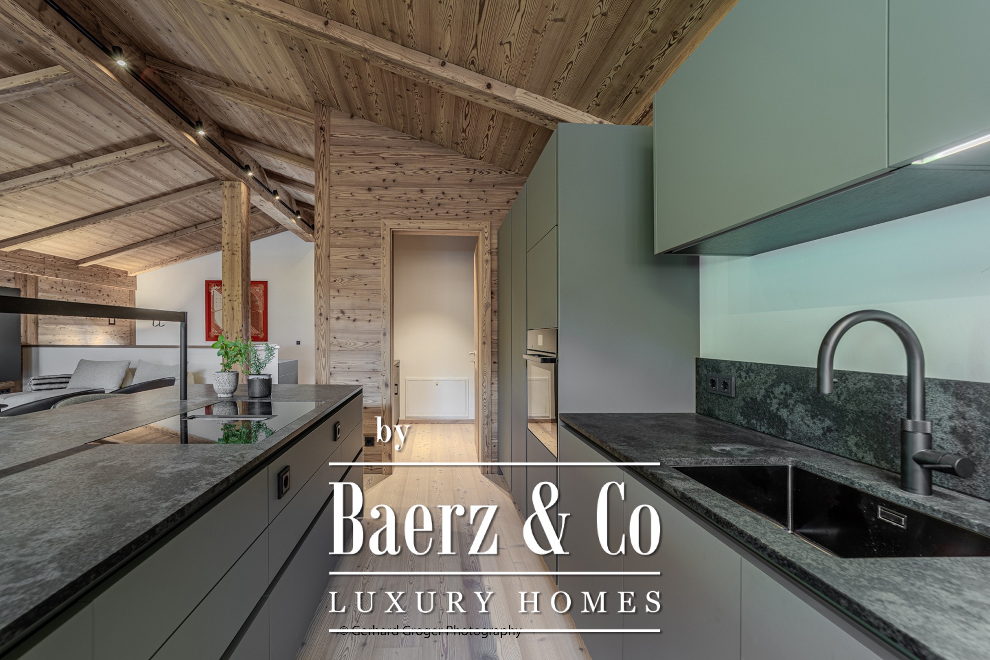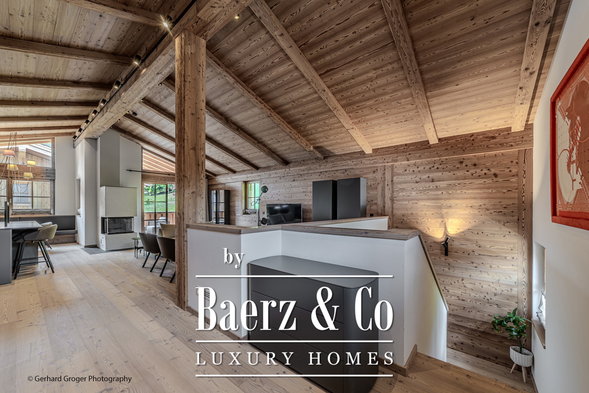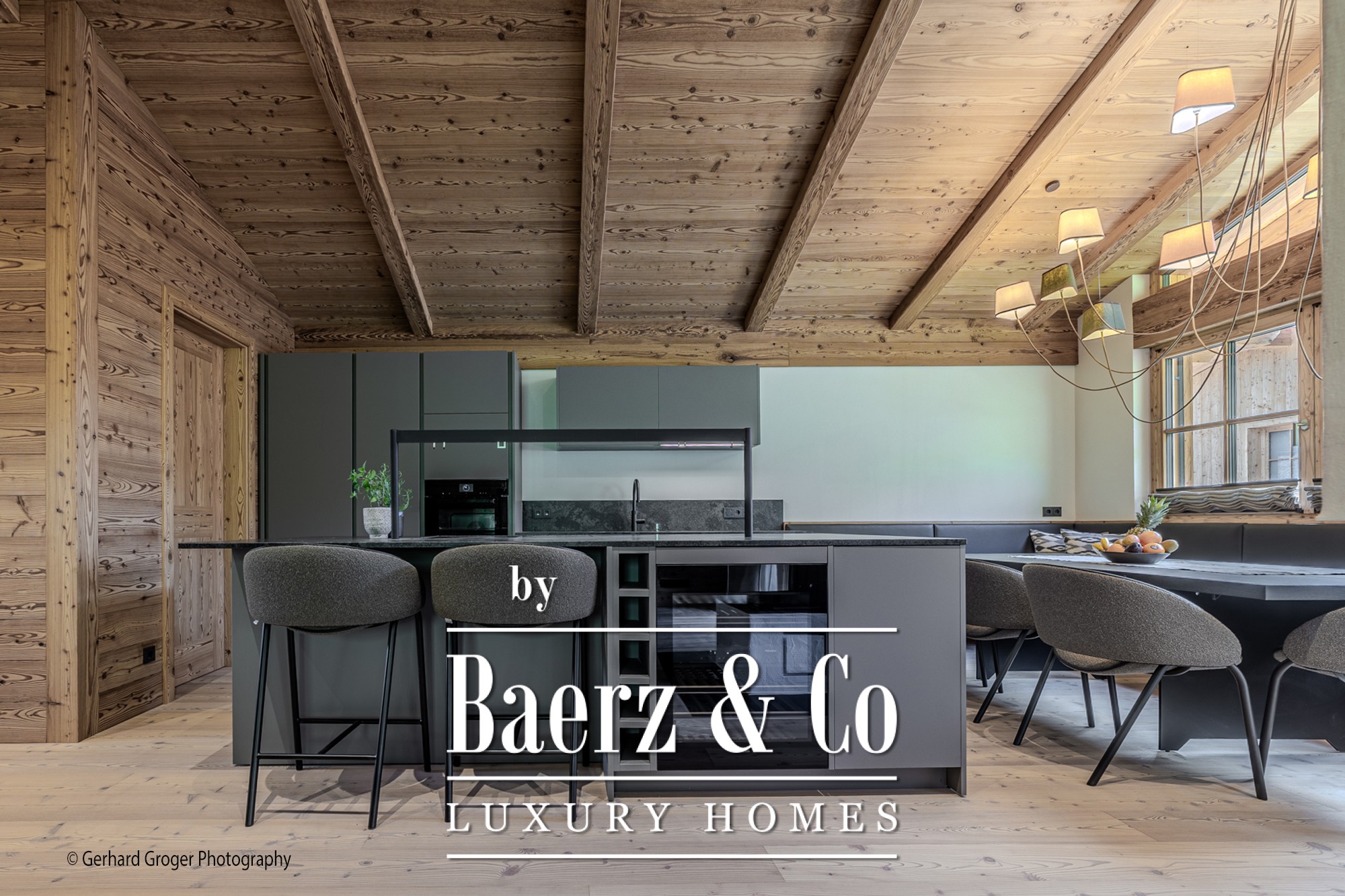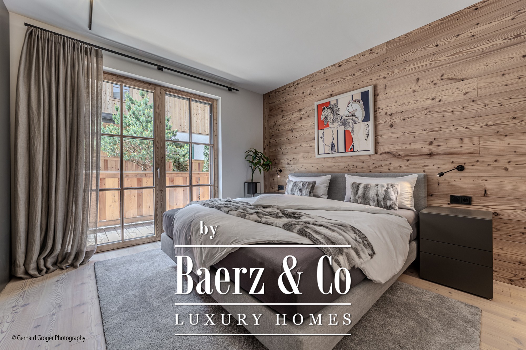 Interiors balance fine larch wood floors with ceramic tiles, underfloor heating, and a high-quality fitted kitchen. Thoughtful amenities, such as a lift, controlled ventilation, a BUS system, underground parking, and ample storage, elevate daily living. The property is a short walk from the heart of Kirchberg and the KitzSki area, blending proximity to vibrant village life with the tranquillity of a mountain setting.