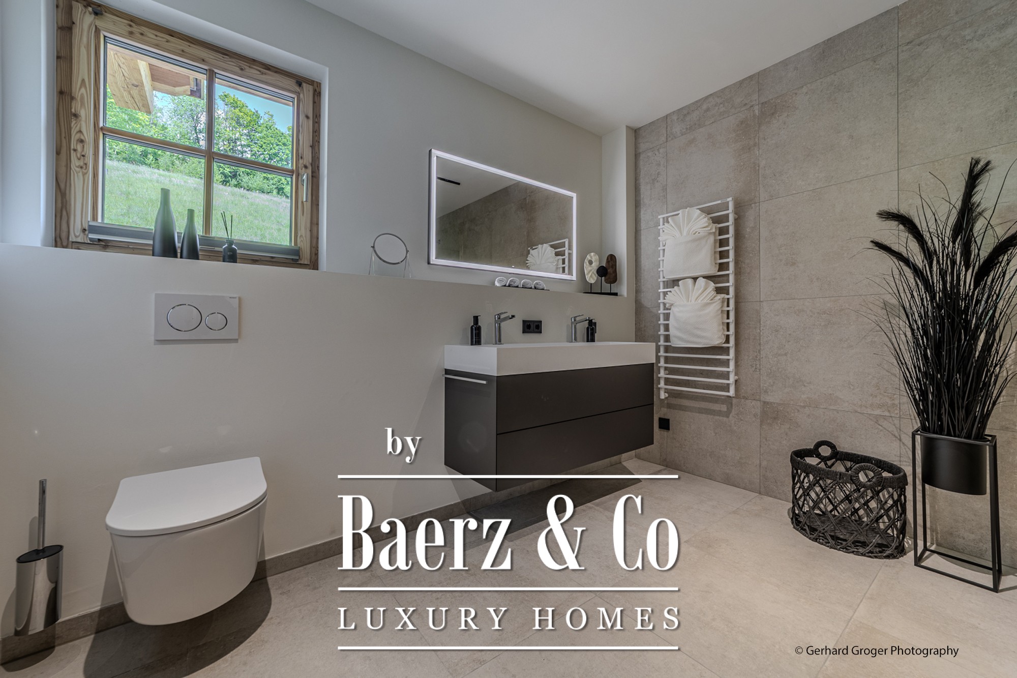 On the basement level, residents will find a secluded bedroom with en-suite bath and an elegant wellness retreat, including a sauna. Two additional bedrooms with private baths are arranged on the ground floor, ensuring comfort for both family and guests. The upper floor offers a light-filled living and dining area, enhanced by an open fireplace and exposed roof trusses, leading out to expansive terraces that frame the alpine panorama.