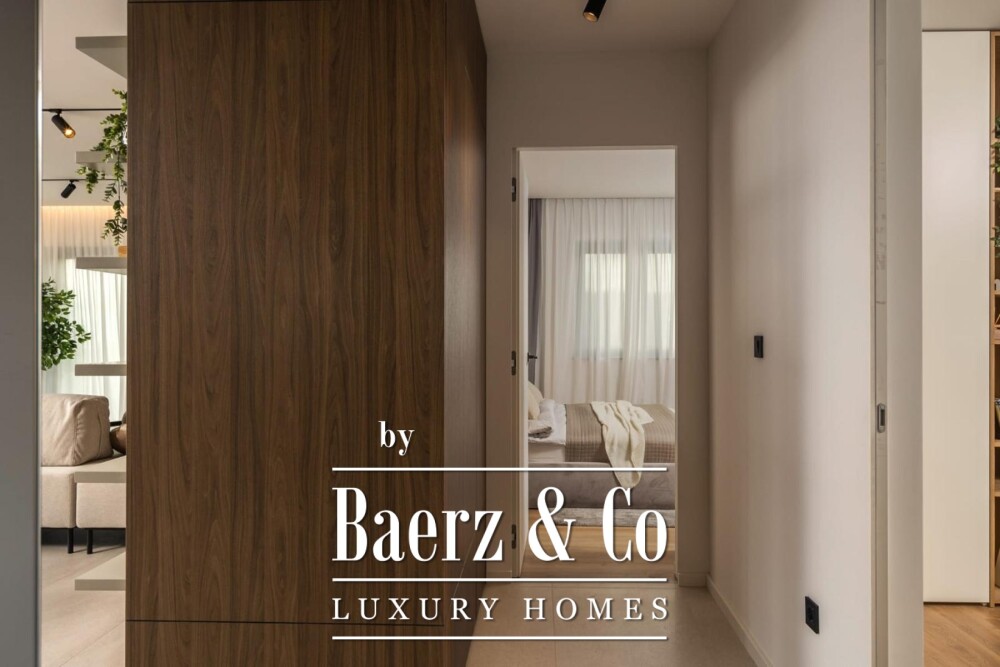 Luxury designer furnishings enhance every room, while the apartment’s smart system ensures comfort through fan-coil heating and cooling, complemented by alarm and video surveillance for peace of mind. A private garden with an outdoor shower embodies intelligent use of space. The apartment includes a 12.5m² garage, 6m² basement storage, and an additional outdoor parking space.