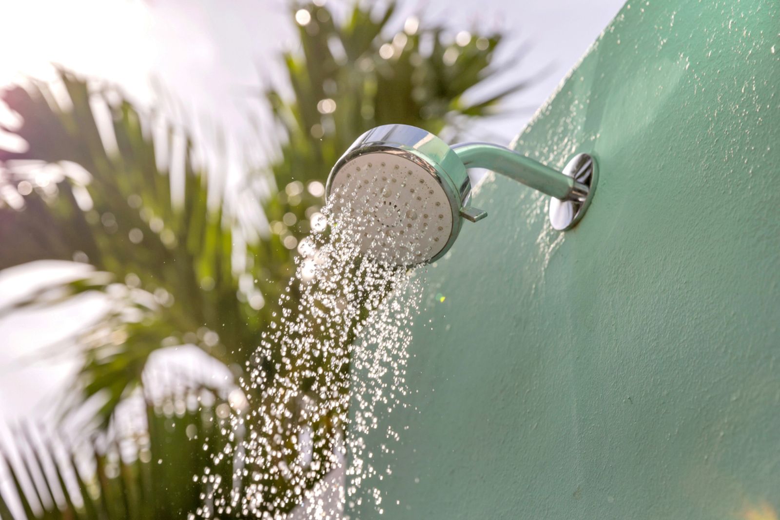 The property includes a private driveway with parking for two cars, a double rinse tank for dive gear, a shaded terrace at the back of the house, and separate storage space.