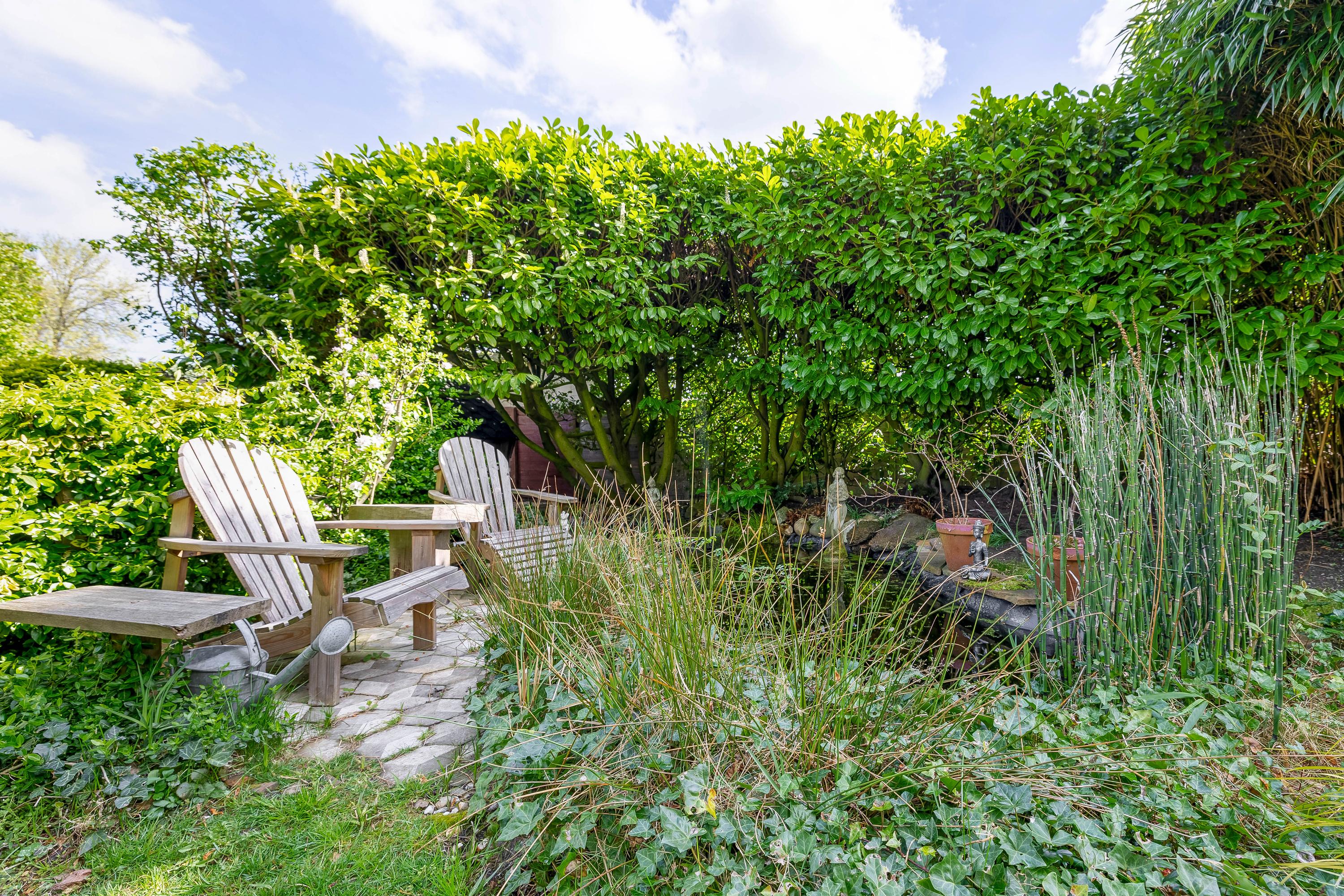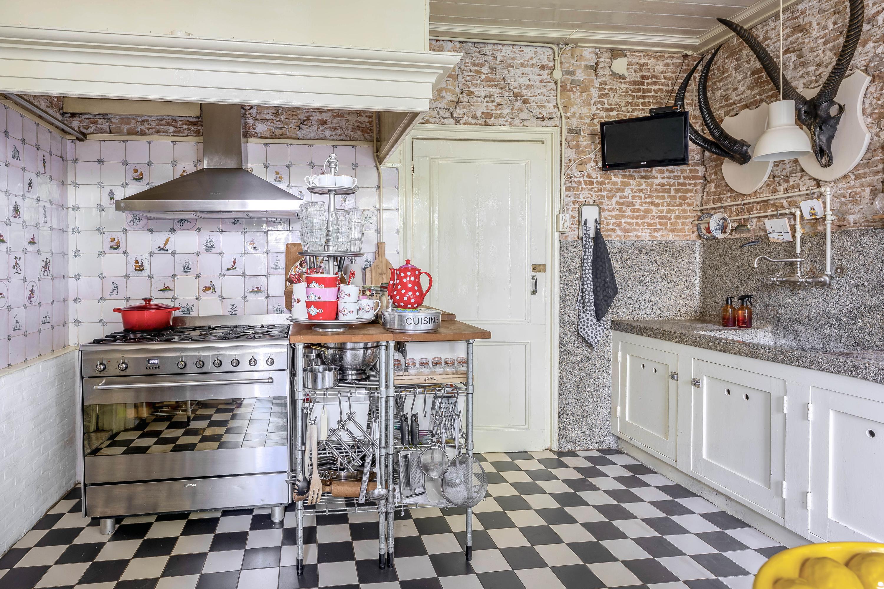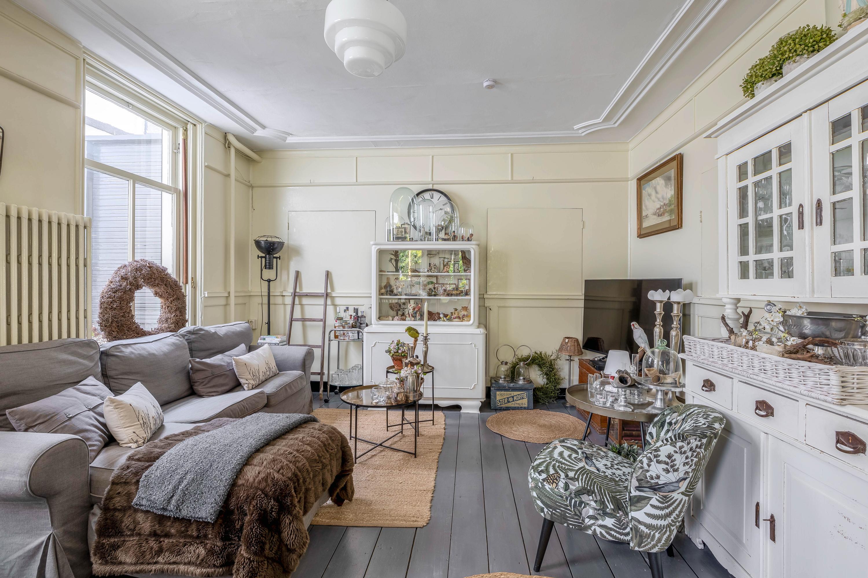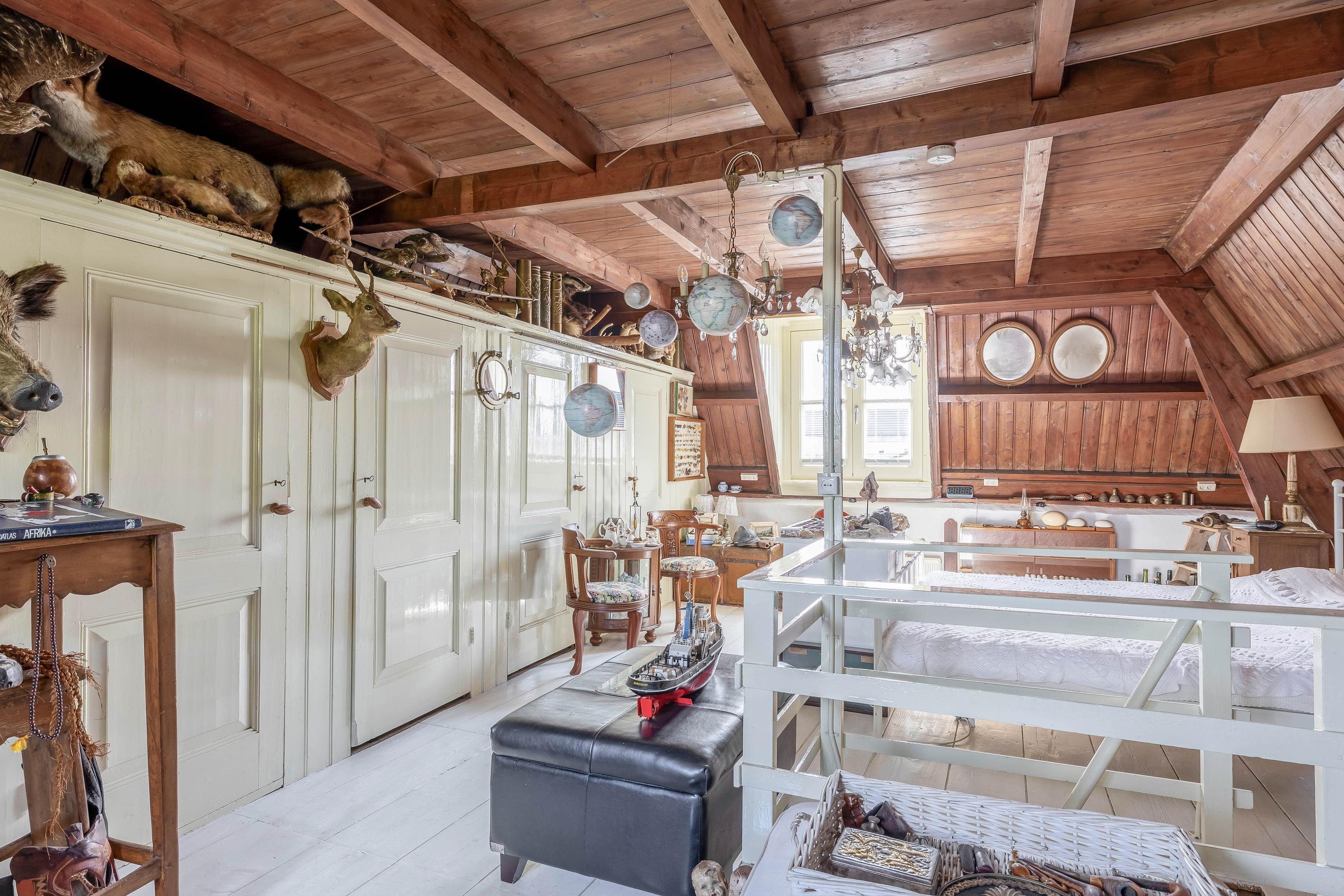 At dike level, you’ll find the charming living room with fireplace and ceiling mural, a dining room connected to the stunning conservatory via sliding doors, a bedroom, and a bathroom with an antique bathtub.