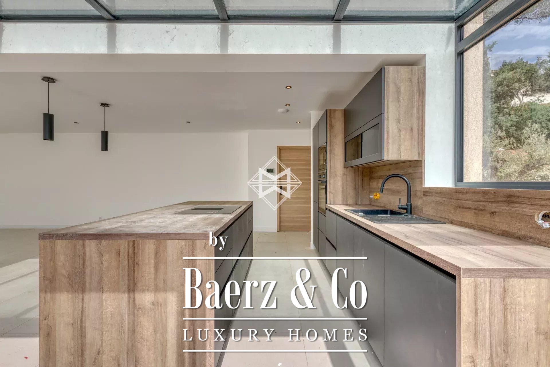 Below, a separate 45 m² apartment offers a living room with open-plan kitchen, an en suite bedroom, and direct garden access. Set on 1,015 m² of landscaped grounds, the villa faces south-east and offers a heated swimming pool, rooftop terrace, carport for two vehicles, and discreet security features including air conditioning, alarm, and surveillance cameras.