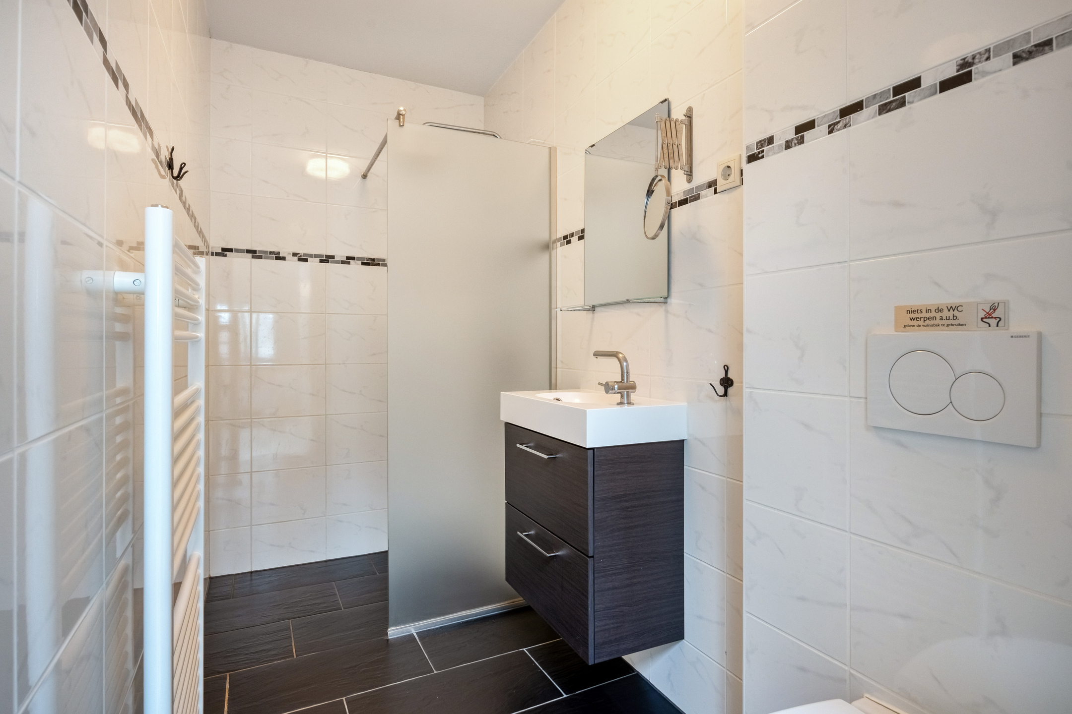 Landing with built-in cupboards, stairs to the 2nd floor, and access to roof terrace. Walk-in closet with passage to bathroom with shower, toilet, and sink. Bedroom with built-in wardrobe.