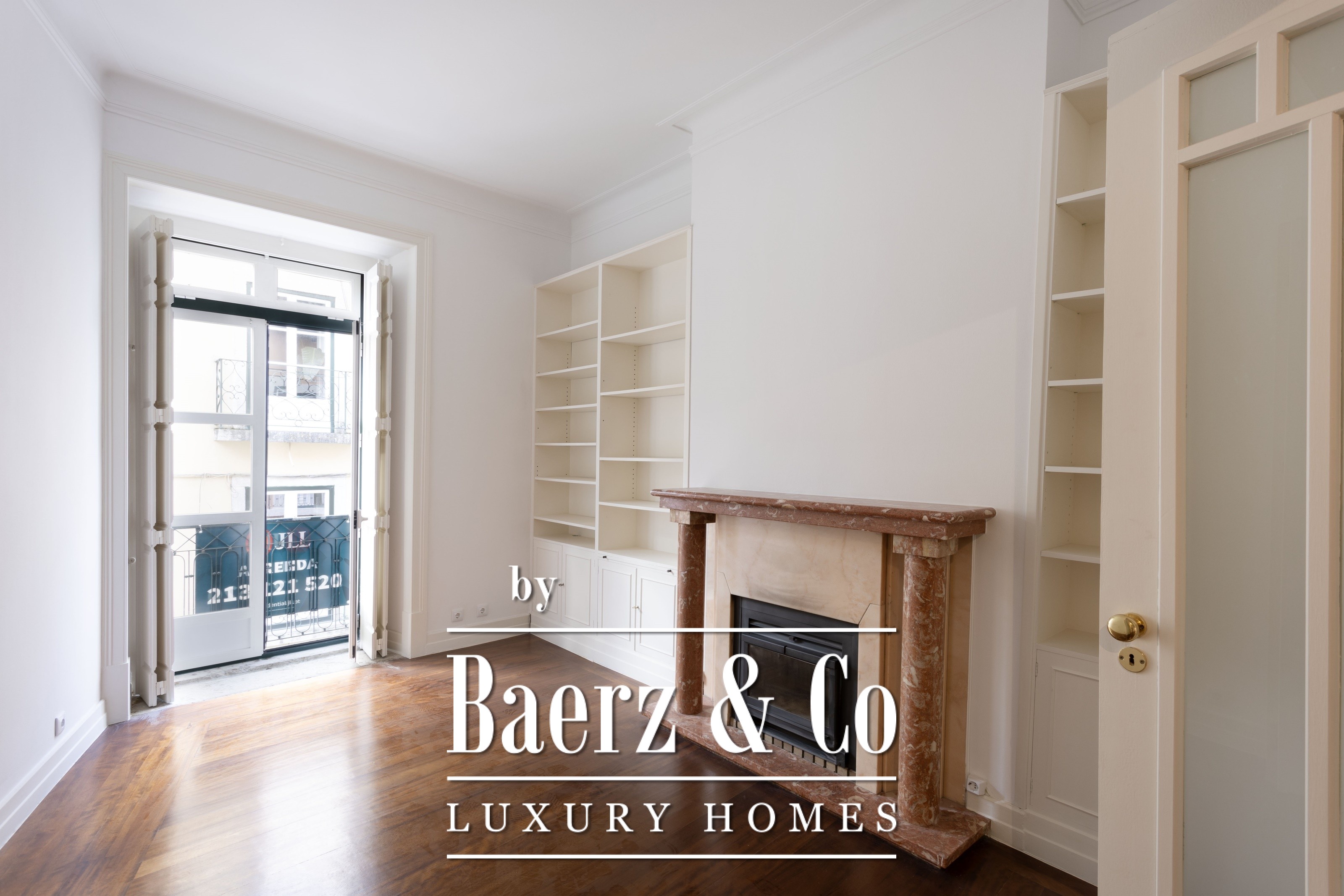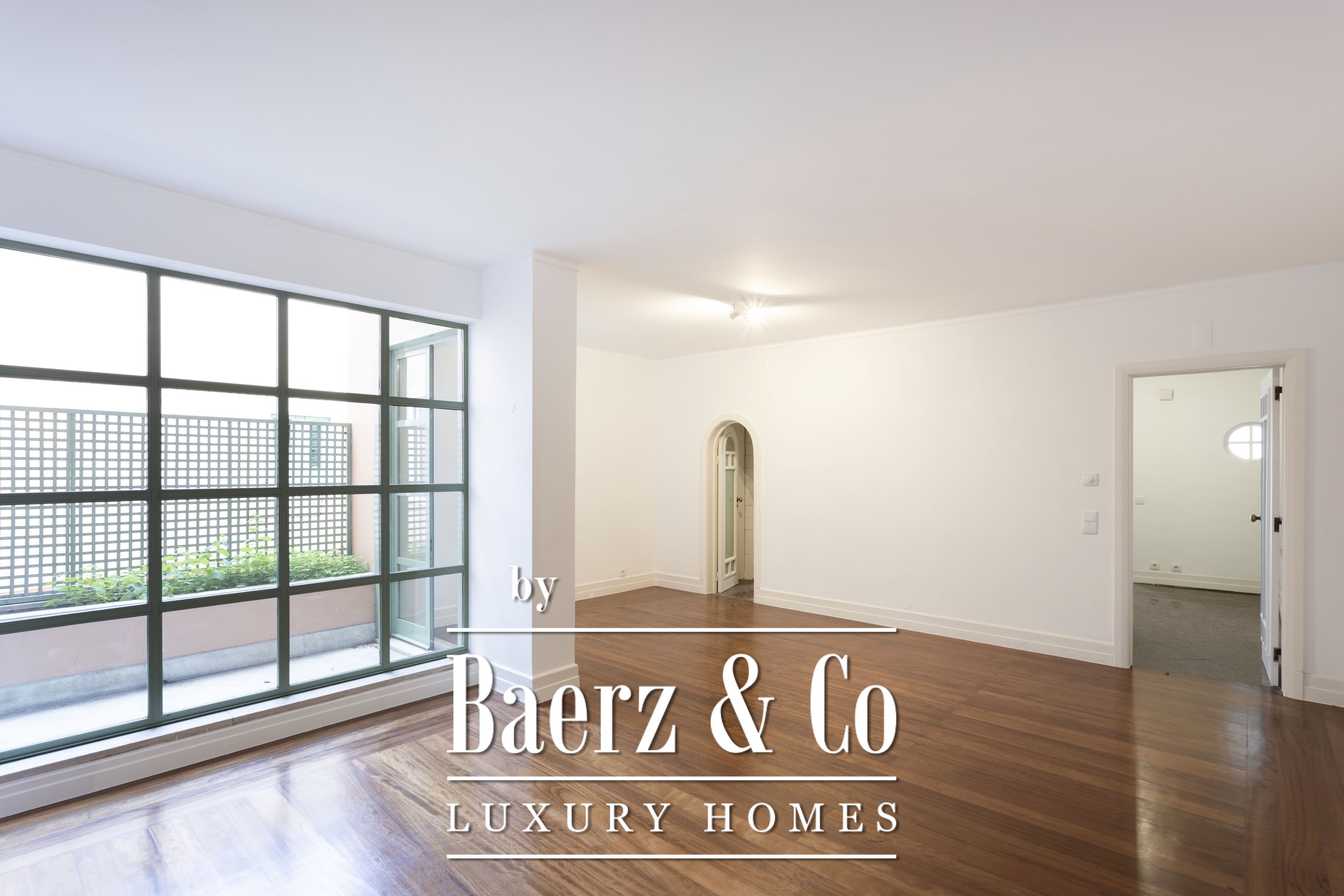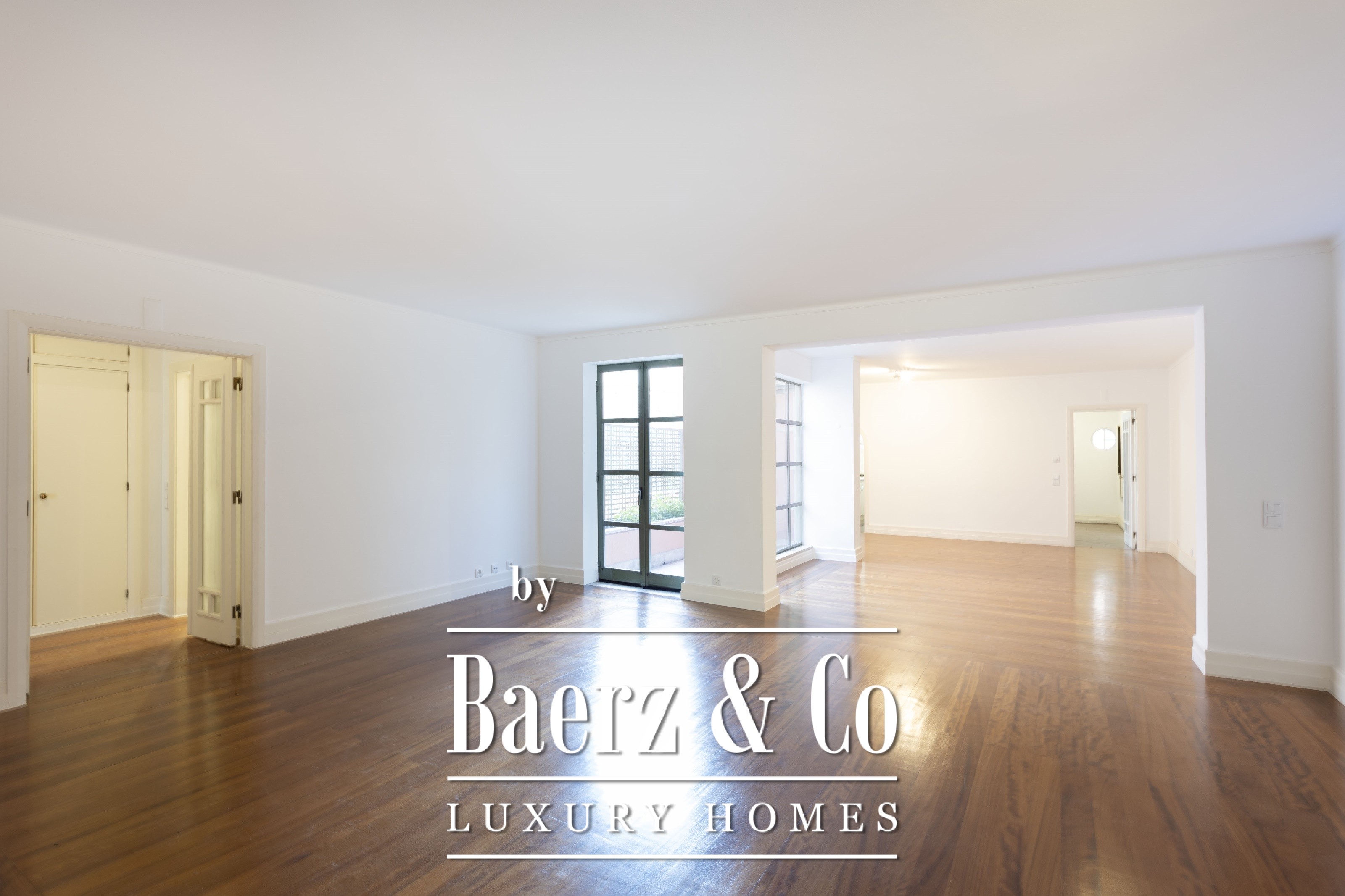 This duplex apartment Príncipe Real Lisbon occupies a tranquil position in one of the city’s most prestigious neighborhoods, where classic charm meets modern function. The 200 m² residence spans two levels, offering three bedrooms and a flexible layout that balances generous living spaces with private outdoor terraces. The main living and dining area features abundant natural light and direct access to a secluded patio, ideal for quiet mornings or intimate gatherings. A second room, adaptable as an office or lounge, centers around a fireplace and opens to a balcony window. The separate kitchen includes a pantry and dedicated laundry, while the master suite offers an en-suite bathroom and its own balcony window.