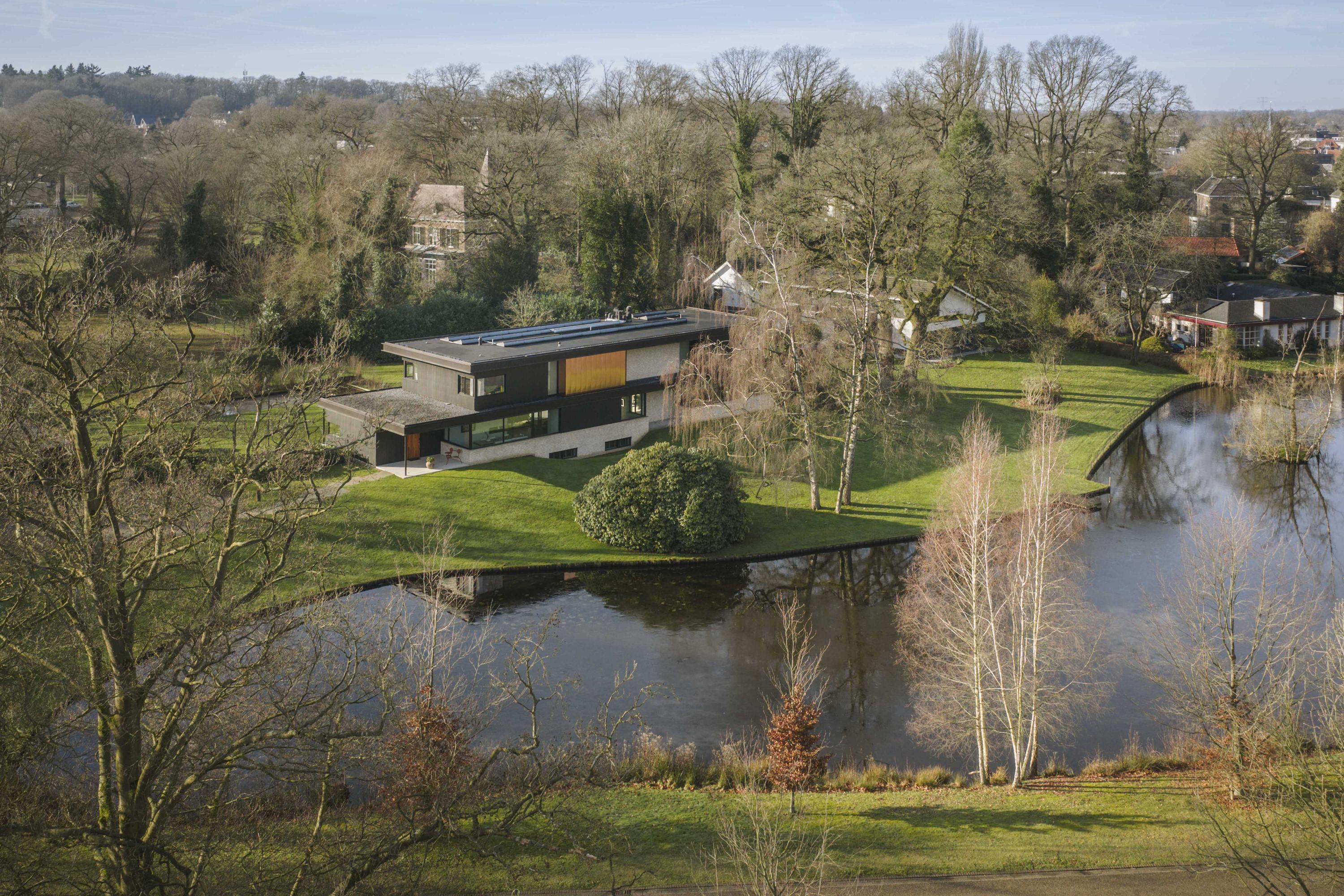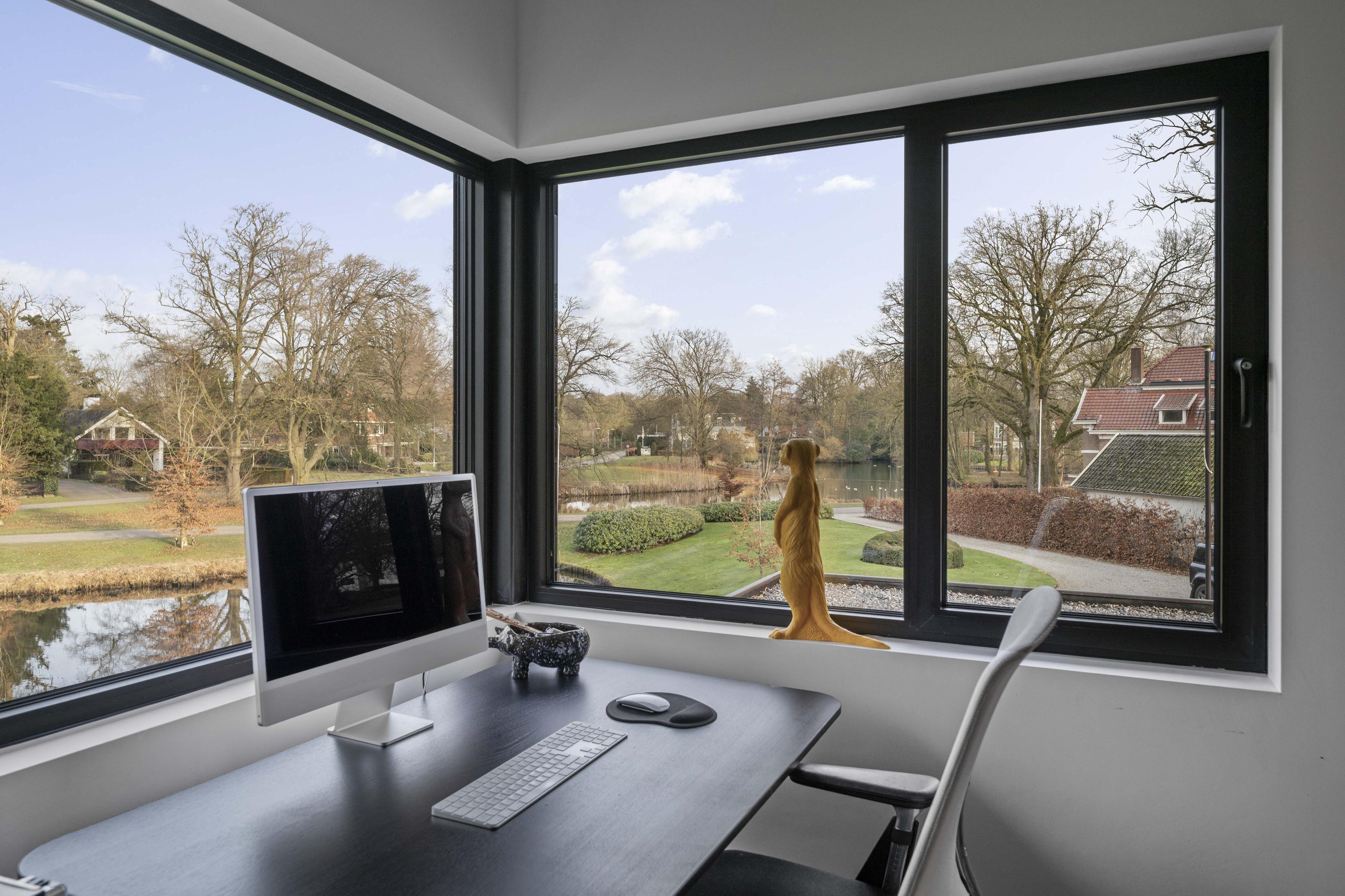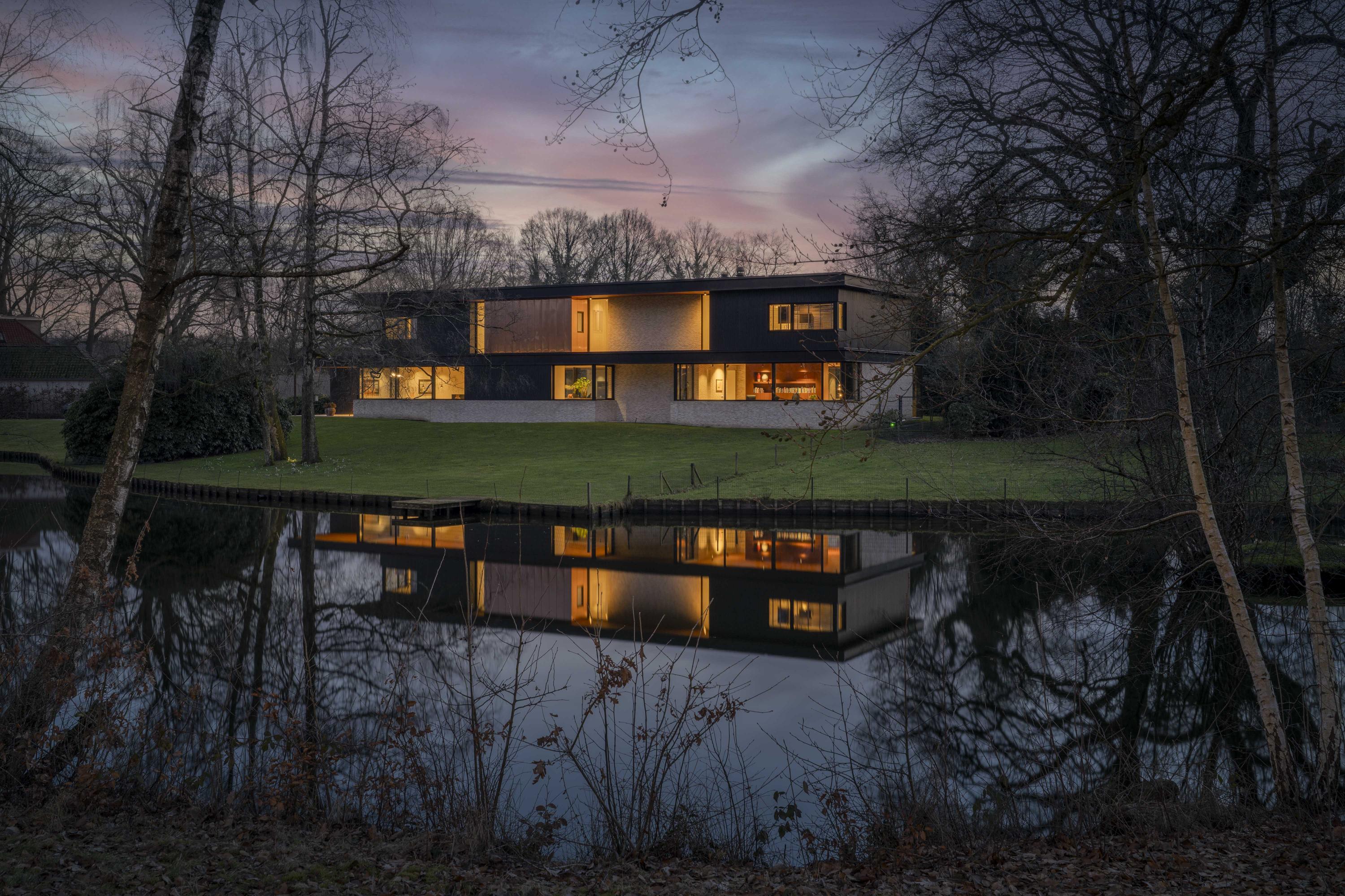 This striking architect-designed villa was built in 2019 in the heart of the picturesque Berkeloord residential area. Villa Vijverzicht is carefully positioned on a generous plot of 6,635 m² and forms a natural part of the park-like surroundings. At the front, the house overlooks the ponds of Berkeloord, and at the rear, the deer park of Lochem. Here you can live in peace and space, with maximum privacy and a permanent unobstructed view.