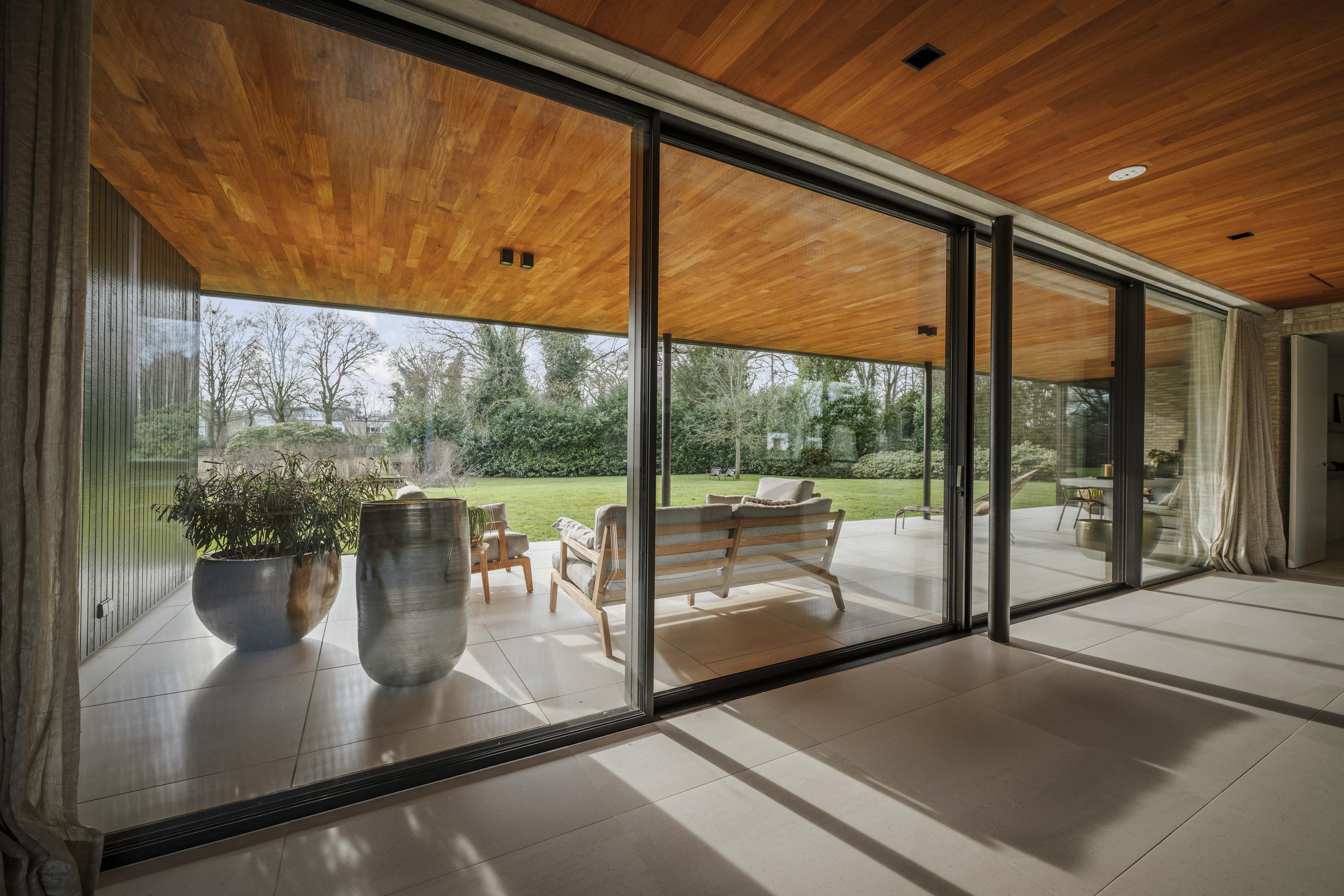The kitchen (88 m²) forms the heart of the house. From this room, the view is impressive at both the front and rear. Floor-to-ceiling windows and sliding doors connect the kitchen directly to the covered terrace, which is furnished with a sitting and dining area and an outdoor fireplace by Metalfire. The terrace is the family's favourite spot; in winter it is a sunny place due to the low light incidence and in summer it is a pleasant lounge area in the shade and shelter. Thanks to the canopy and the outdoor fireplace, this is a place where you can comfortably spend most of the year.
