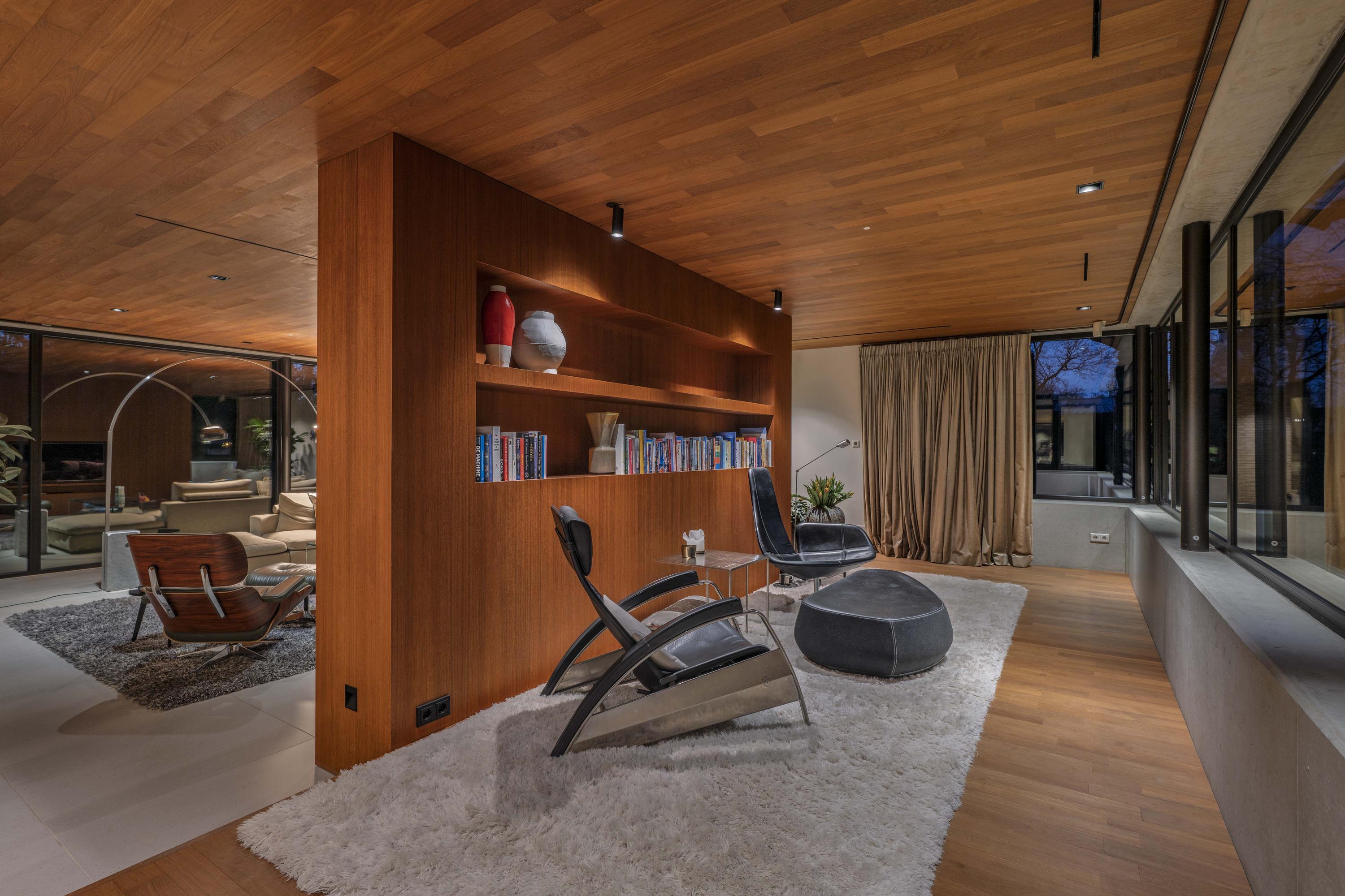 The living room (74 m²) is spacious and divided into two seating areas by a room divider with an integrated television and bookcase. At the rear, floor-to-ceiling windows offer views of the garden, while at the front, the ponds come into view, with sufficient privacy thanks to the half-height parapet. A wide Metalfire fireplace and a raised teak floor area at the front give the room extra character. The sophisticated lighting plan ensures that art and architectural lines are shown to their best advantage.
