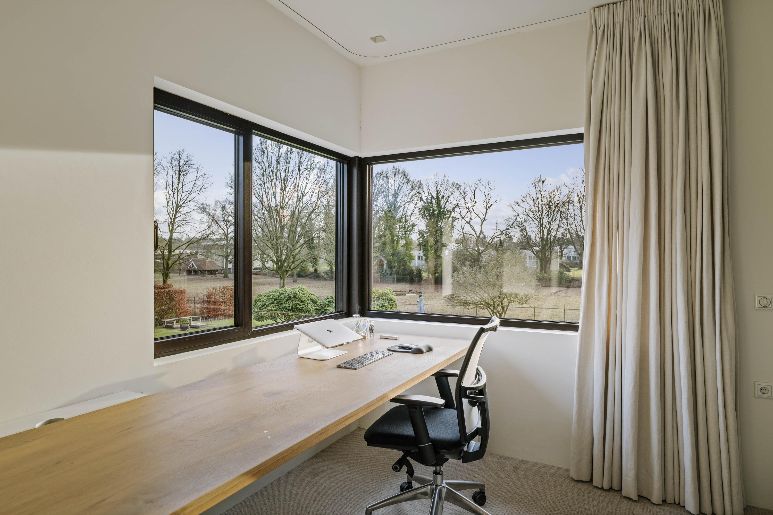 The first floor has four spacious bedrooms and two bathrooms. The master bedroom, measuring approximately 45 m², has windows on both sides and is equipped with spacious built-in (wardrobe) cupboards. The en-suite bathroom has a freestanding bathtub, a spacious walk-in shower, double sink, dressing table and toilet. The other bedrooms are also generously sized and all enjoy views of the ponds or deer park. One bedroom has its own shower and sink. There is also a second bathroom with a bath, walk-in shower and double washbasin, as well as a separate toilet on the landing.