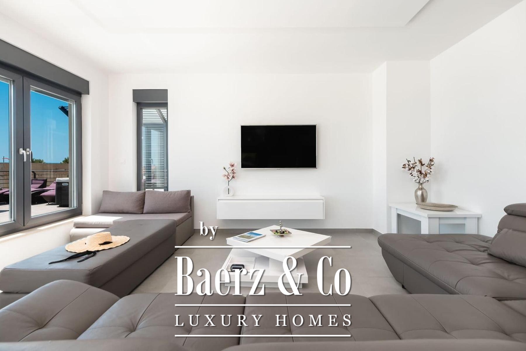 Villa Makarska occupies an elevated position, delivering panoramic views across the sea and the historic town below. This villa in Makarska stretches across 450 m² of living space, integrated into a 448 m² plot that articulates a clear connection between interior and exterior living. The south-facing orientation ensures constant natural light in every principal room, enriching daily life with views that shift from dawn to evening.
