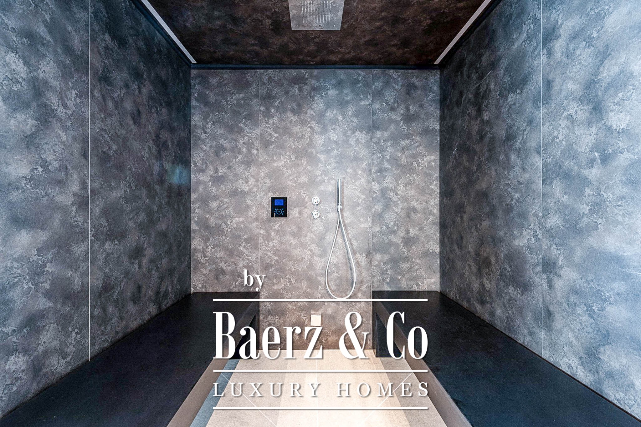 The design reveals an openness to light and space. Encompassing 794 m² on a 1,500 m² plot, the interiors are arranged across several levels and accessed by a lift. Expansive living areas extend seamlessly onto the terrace and garden, with large windows dissolving the boundary between inside and out. An infinity pool draws the eye toward the horizon, merging architecture and landscape.
