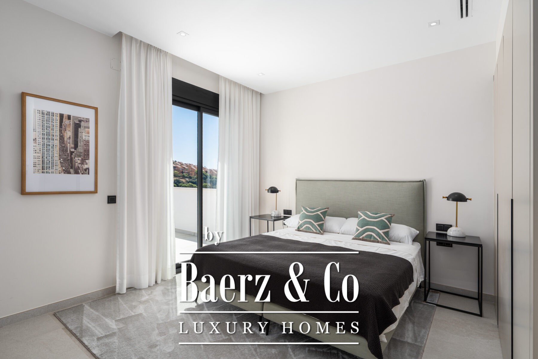 The residence’s architecture balances contemporary clarity with warmth, employing ceramic stone and wood finishes to create a poised atmosphere. Miele appliances, solar panels, electric blinds, and an advanced irrigation system speak to its sustainable detailing. Terraces open from all bedrooms and main spaces, leading to a covered swimming pool, outdoor barbecue area, and sauna, while panoramic golf course and Mediterranean Sea views act as a constant aesthetic backdrop.