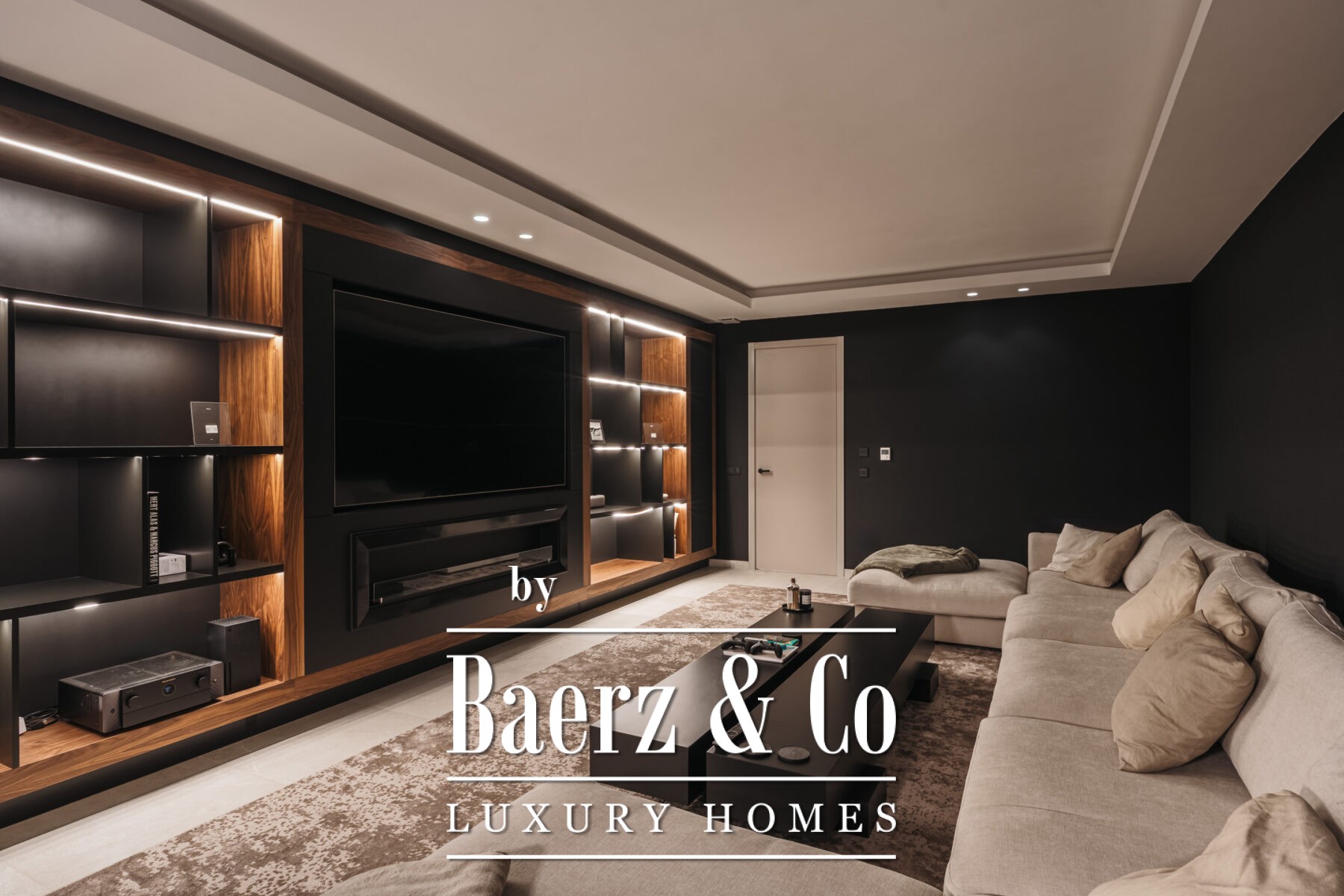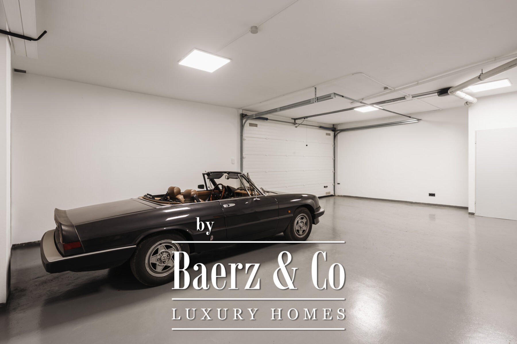 The ground floor includes a vast basement area accommodating a three-car garage, storeroom, and additional parking, enhancing both security and convenience. A comprehensive alarm system, security shutters, and private gates reflect a rigorous approach to privacy.