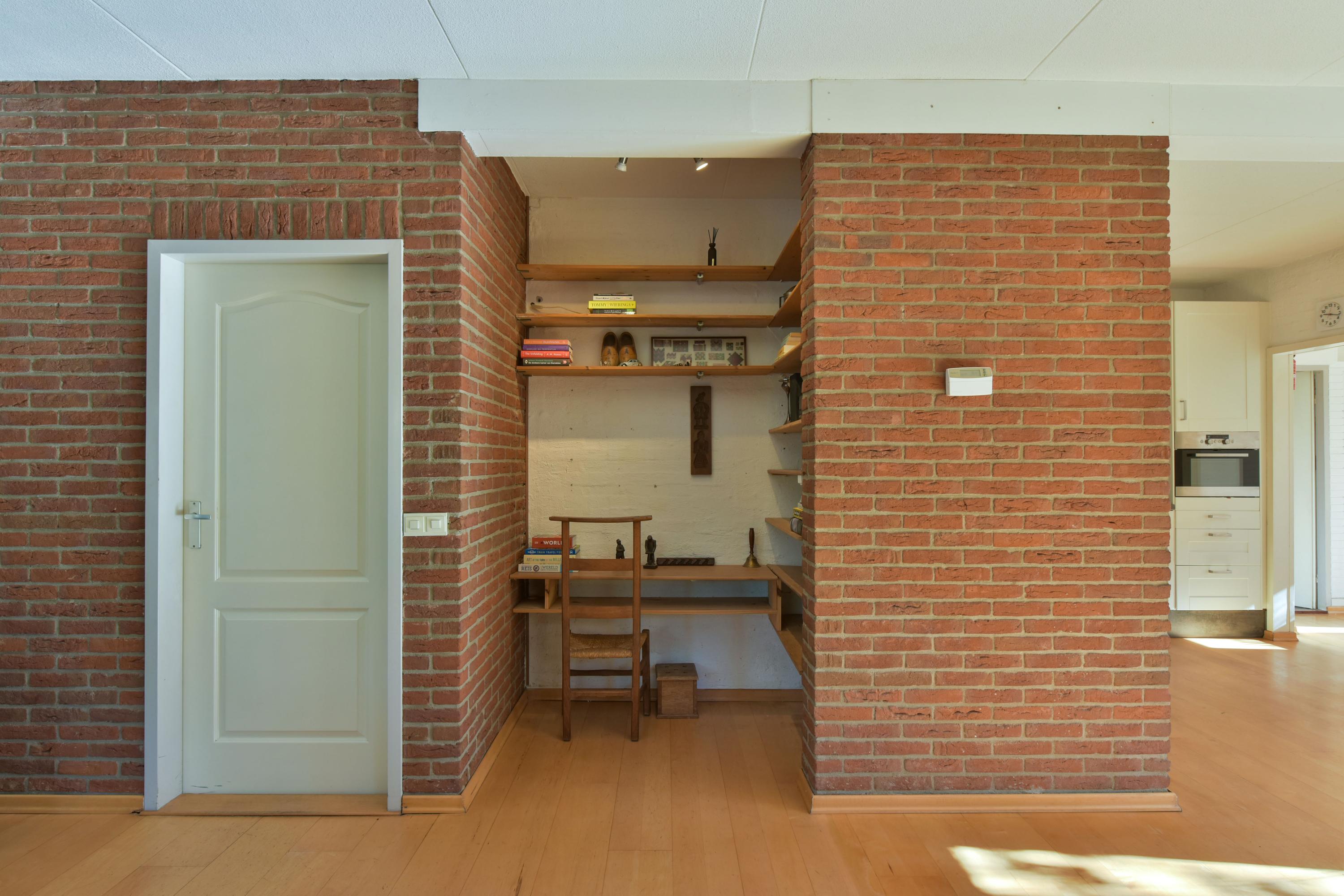 The office on the ground floor is a quiet and comfortable space — ideal for working from home, studying, or hobbies. At the front, the square-shaped living room offers a cozy atmosphere with a wood-burning stove. A recessed nook adds a playful element and is perfect as a reading corner, workspace, or children’s play area. At the rear, a door leads to the garden, seamlessly connecting indoor and outdoor living on sunny days.