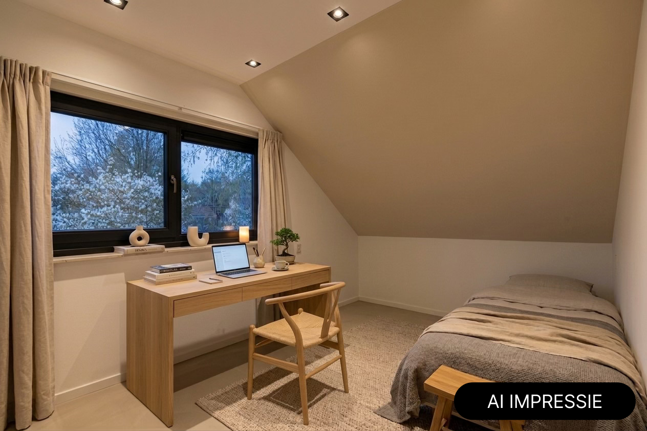 Inside, the home is just as appealing. The ground floor offers everything you need for comfortable and versatile living: a pleasant home office, a cozy breakfast area where the day begins peacefully, a practical utility room, and direct access to both the garage and the garden. On the first floor, you’ll find no fewer than four bedrooms and two bathrooms — perfect for families or guests. And as if that weren’t enough, there is an additional bedroom above the garage. Ideal as a teenager’s room, guest room, or hobby space. Sustainability has also been considered: with 18 solar panels (12 at the rear and 6 at the front), the home is well prepared for the future.