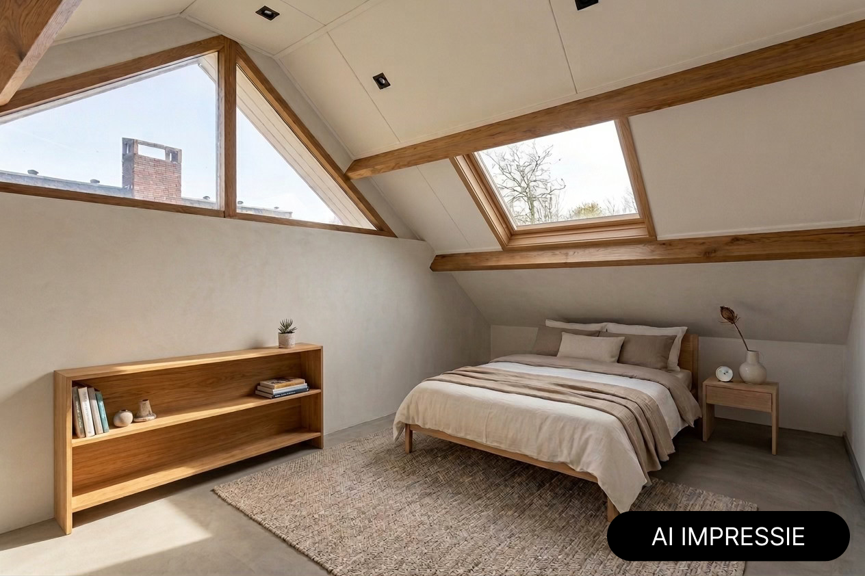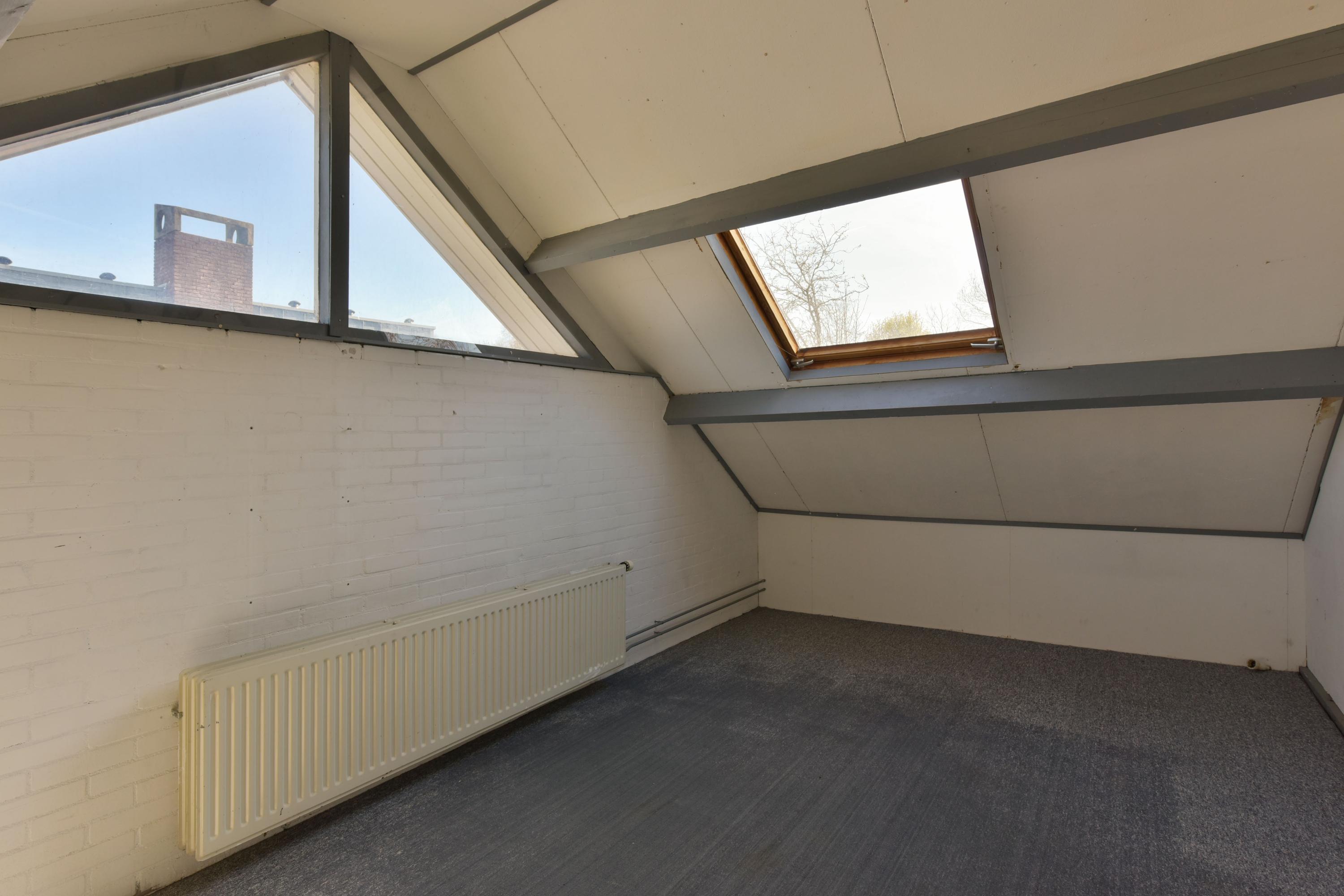The garage is accessible from both inside and outside and features an electric roller door, a pedestrian door to the garden, and side windows for extra daylight. From the utility room, a staircase leads to the space above the garage. Here you’ll find a landing and an additional bedroom with both a large side window and a skylight — a bright and versatile room with multiple uses.