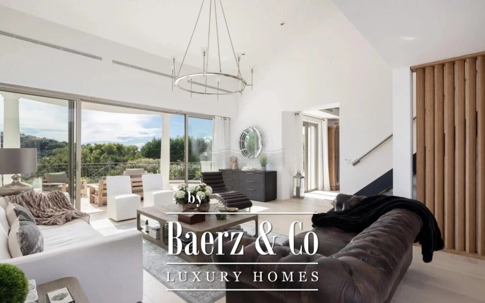 A series of interconnected living spaces flows with gentle clarity: a grand living room merges seamlessly with the dining area, setting a quiet rhythm for daily life and entertaining. Six en suite bedrooms include a complete master suite, each balancing privacy with comfort. The luxury villa for sale in Mougins also features a dedicated cinema room and a fitness area, enabling a balanced lifestyle without leaving home.
