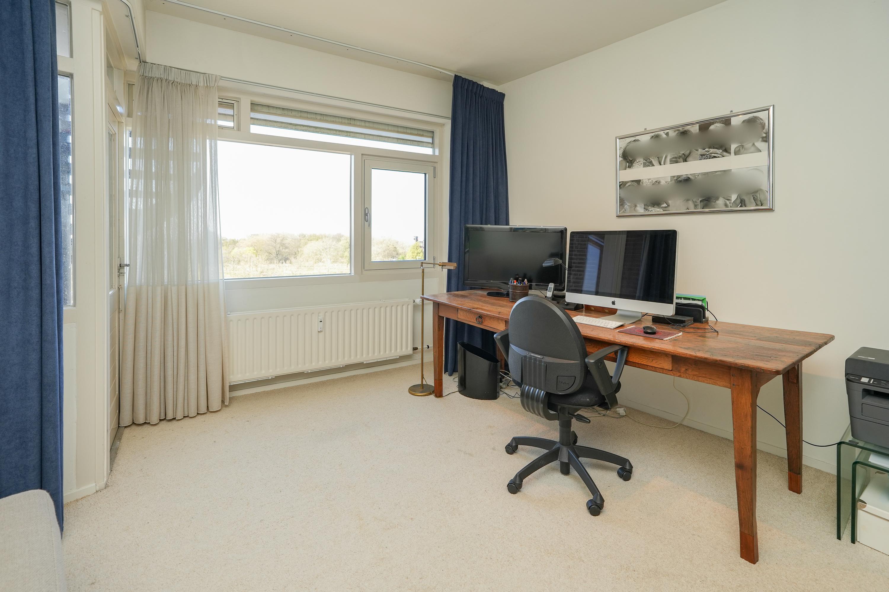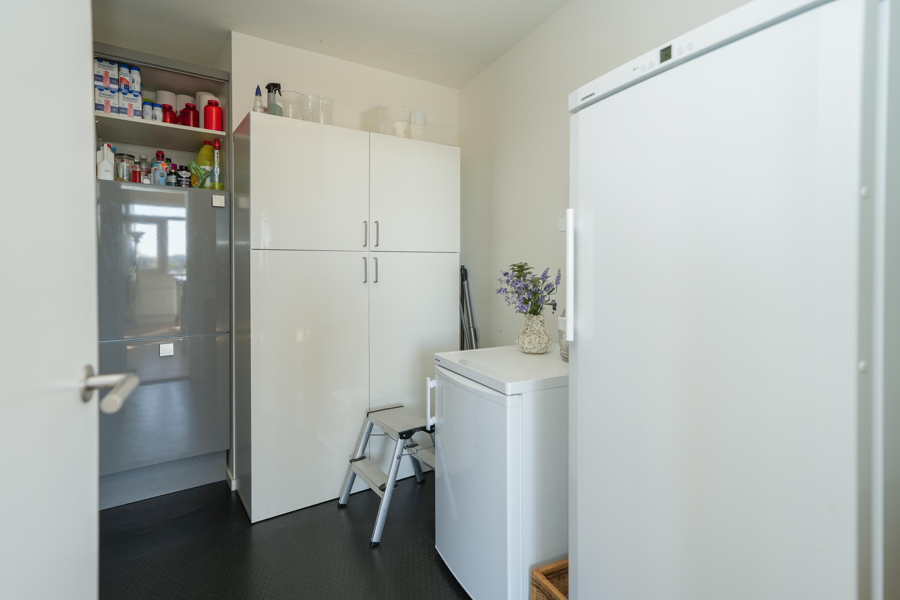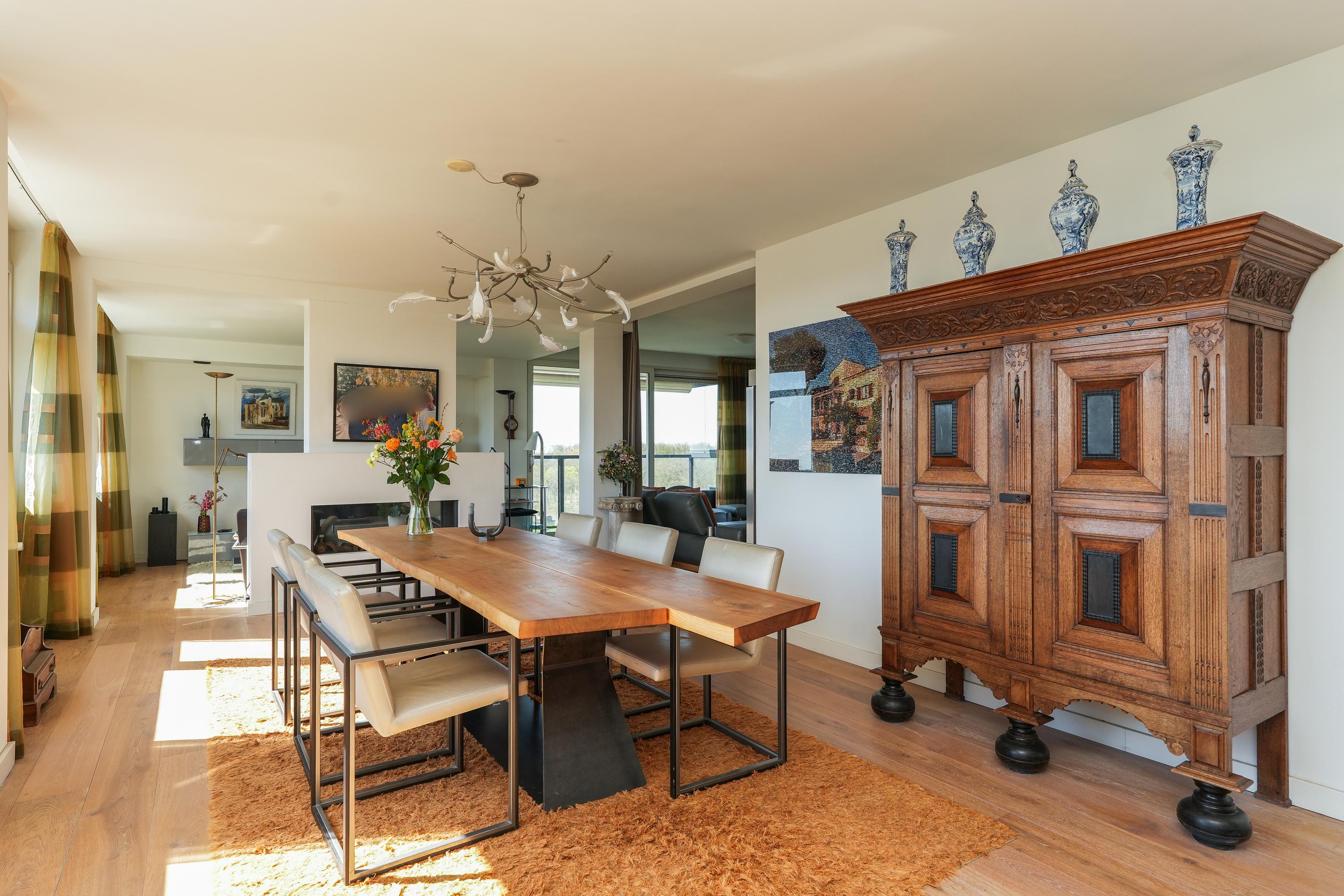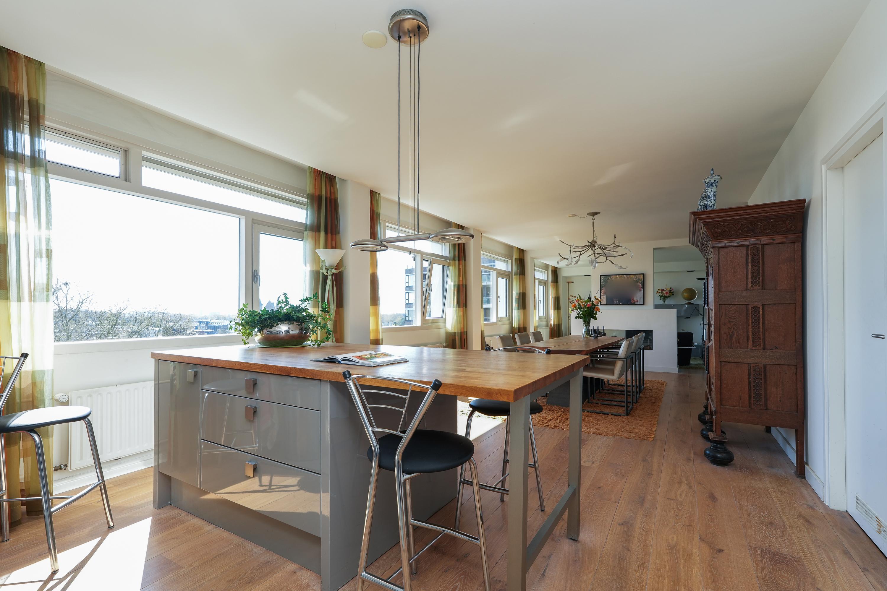 The kitchen is equipped with various built-in appliances and provides access to the first, south-facing balcony. Adjacent to the kitchen is an internal utility room offering additional storage and workspace. From the living room and the balcony there are beautiful views over the city of Nijmegen and Radboud University. A gas fireplace separates the dining area from the television/lounge area on the south-west side. The west-facing balcony offers lovely views towards the River Waal and the iconic Waal Bridge.