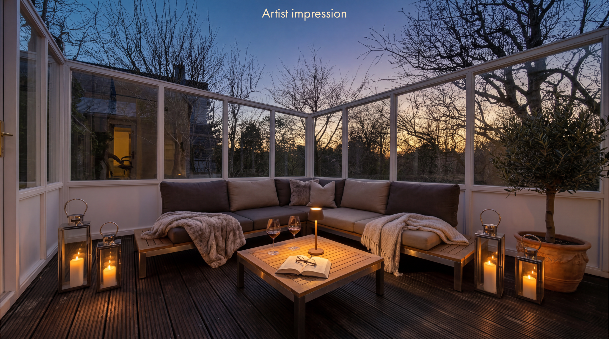 The en-suite dining room can be conveniently closed off from the living room with sliding doors. On the sunny, glass-enclosed terrace, you can enjoy the first rays of sunshine early in the season.