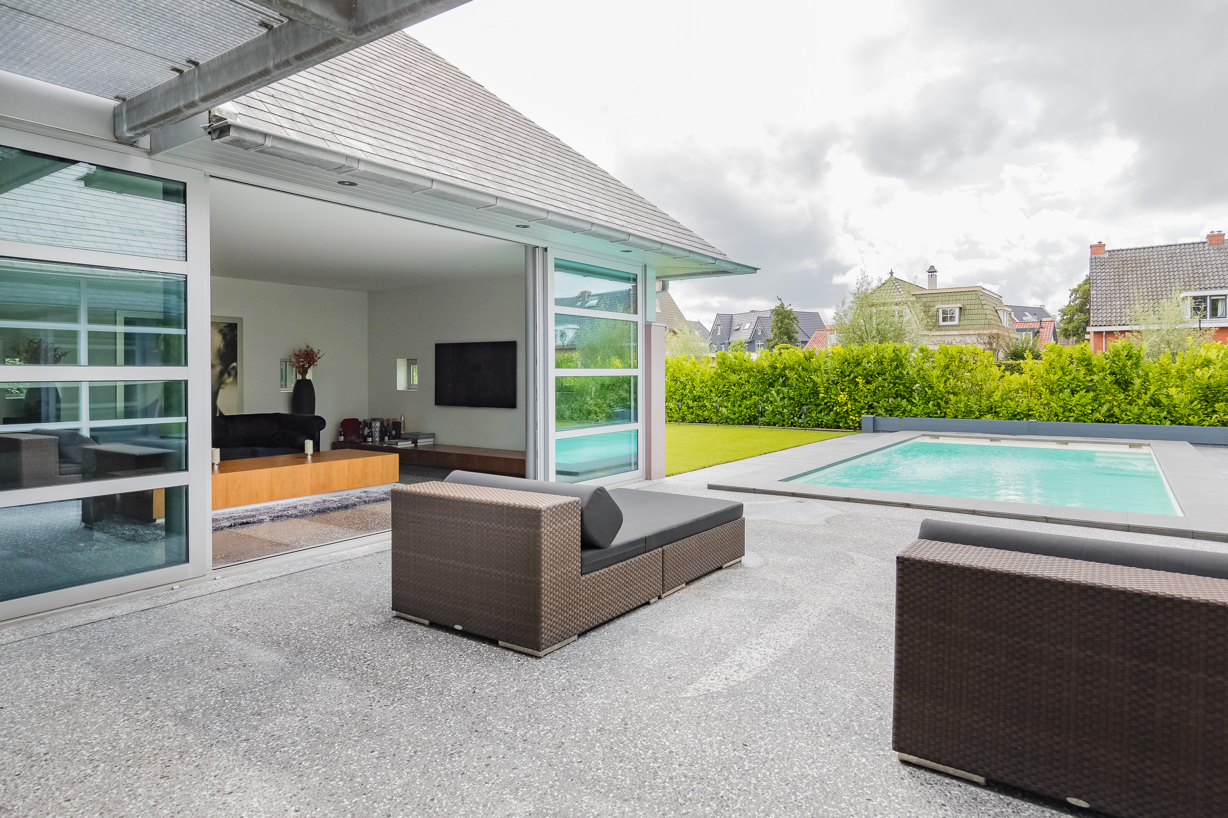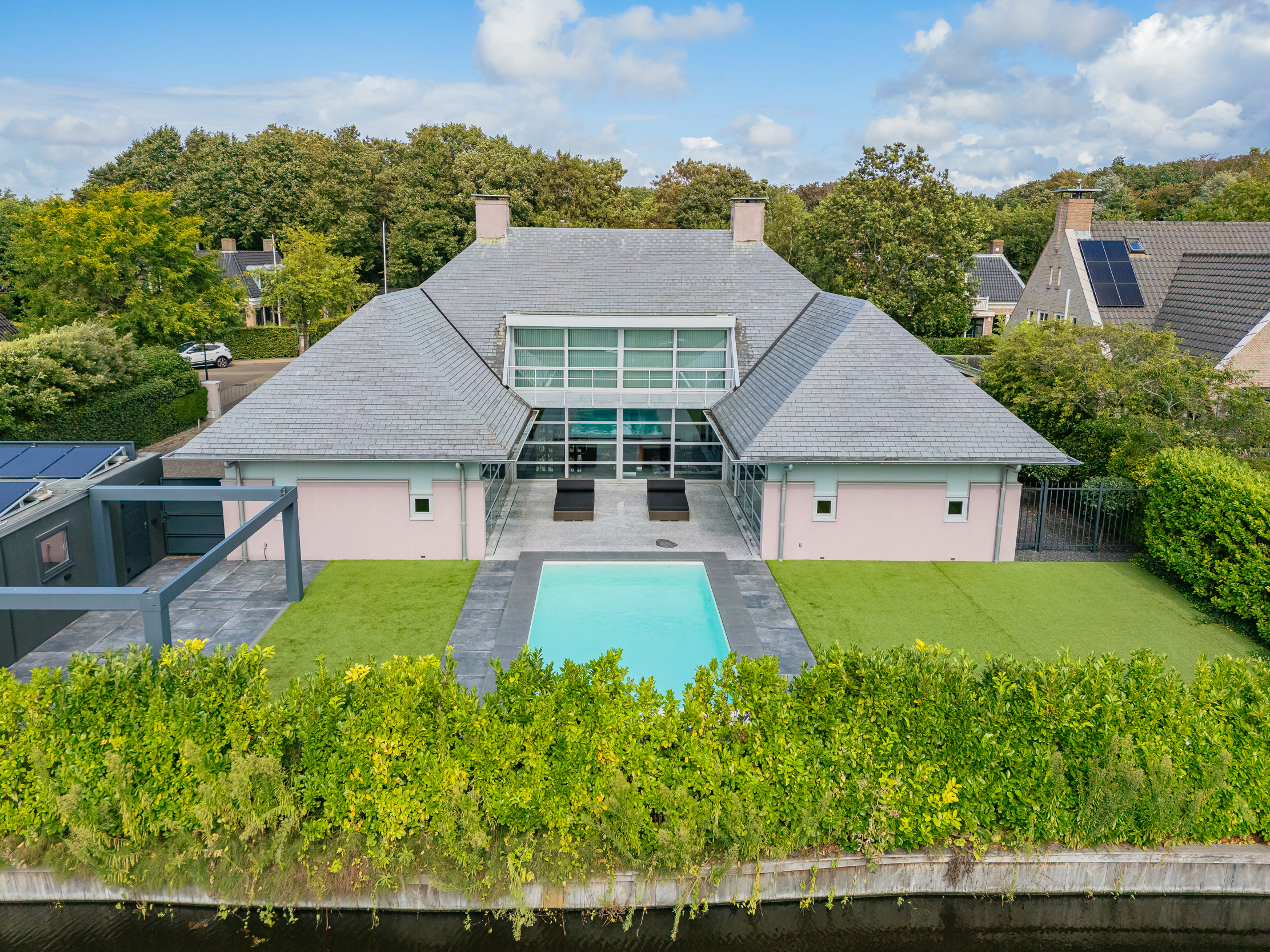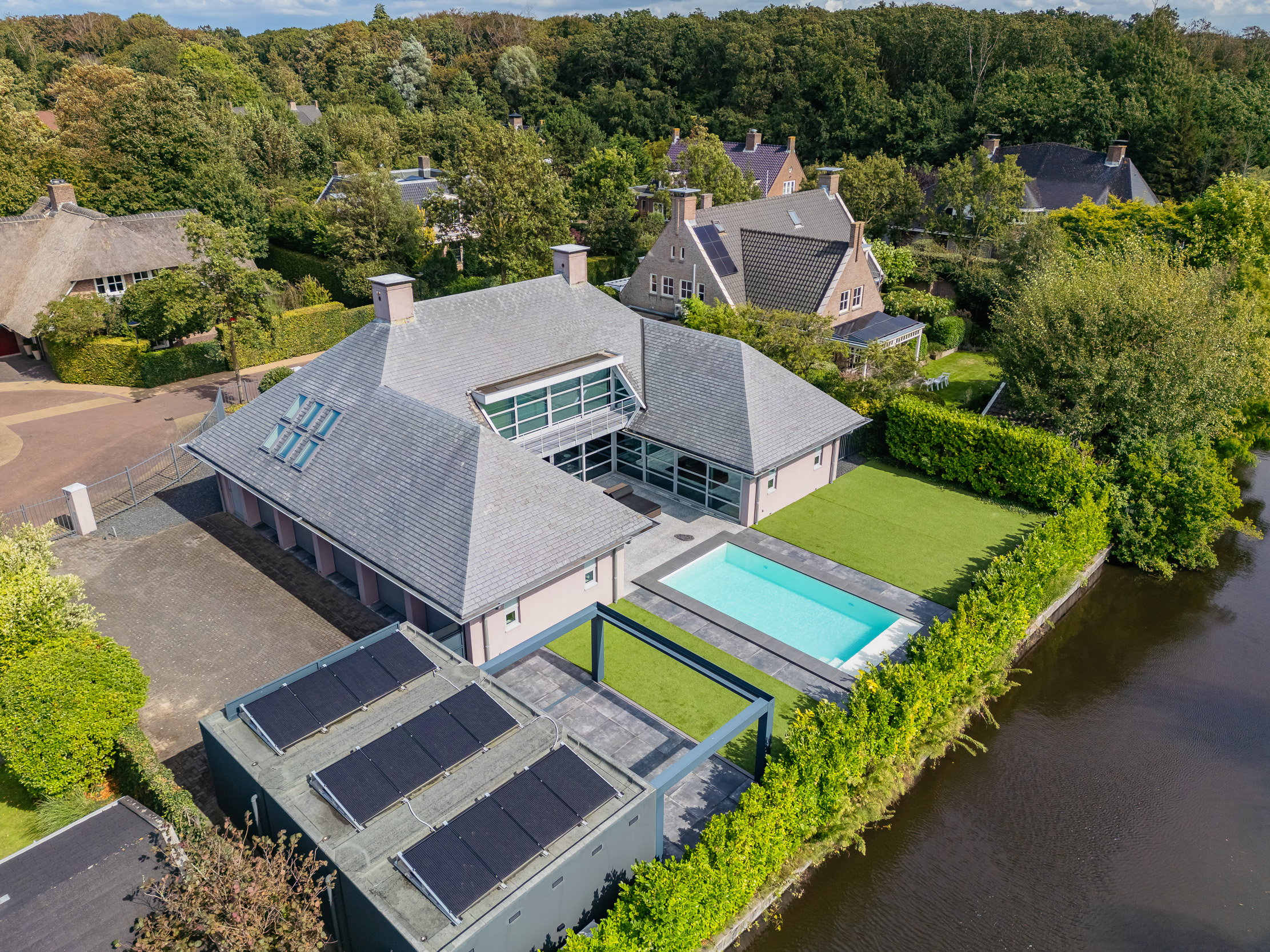 Luxury modern villa with heated pool, indoor garage for 5 cars and a detached garage for 2 (electric) cars , located on one of the most beautiful locations of Noordwijk. Keywords of this particularly designed villa are; privacy, customization and symmetry.