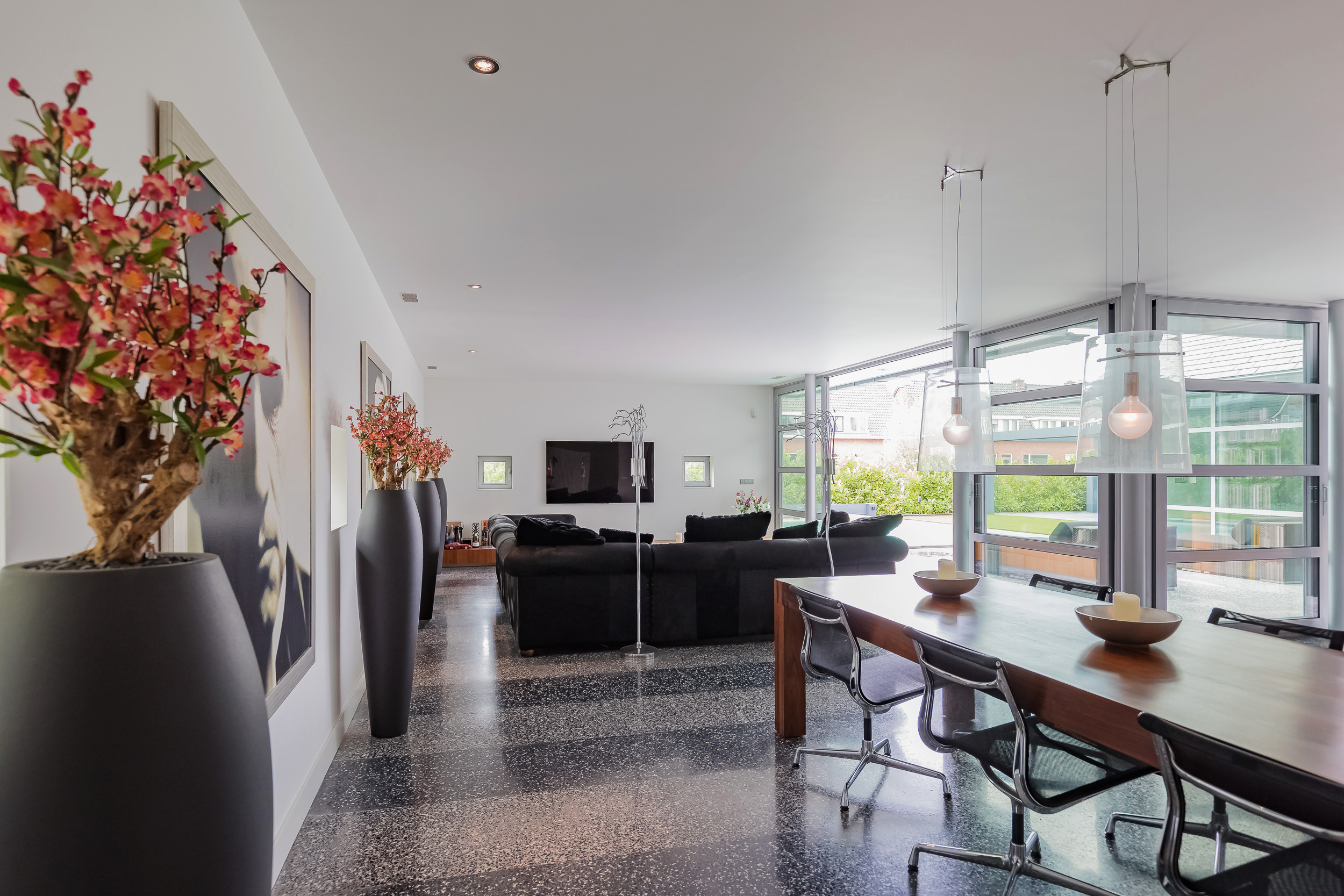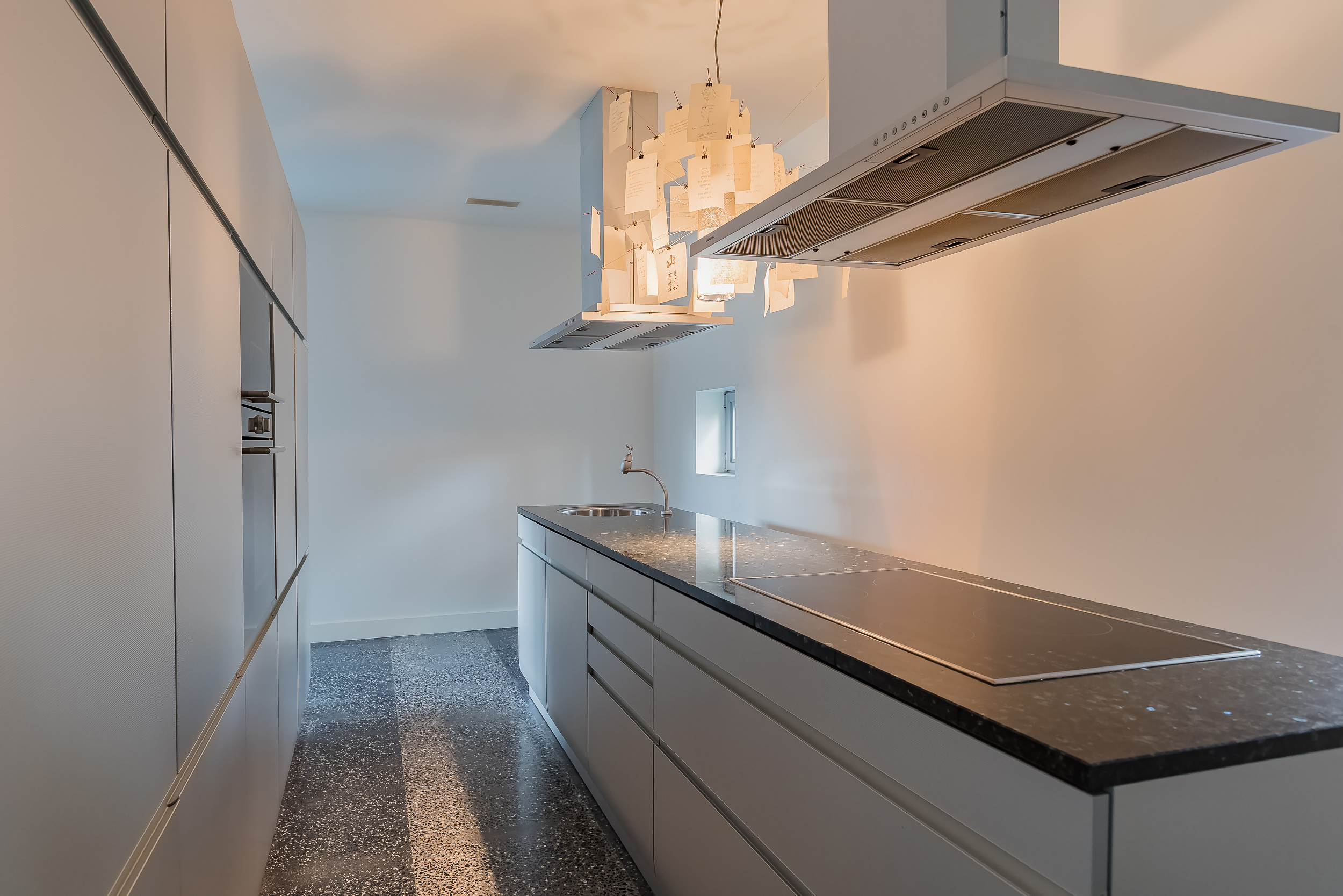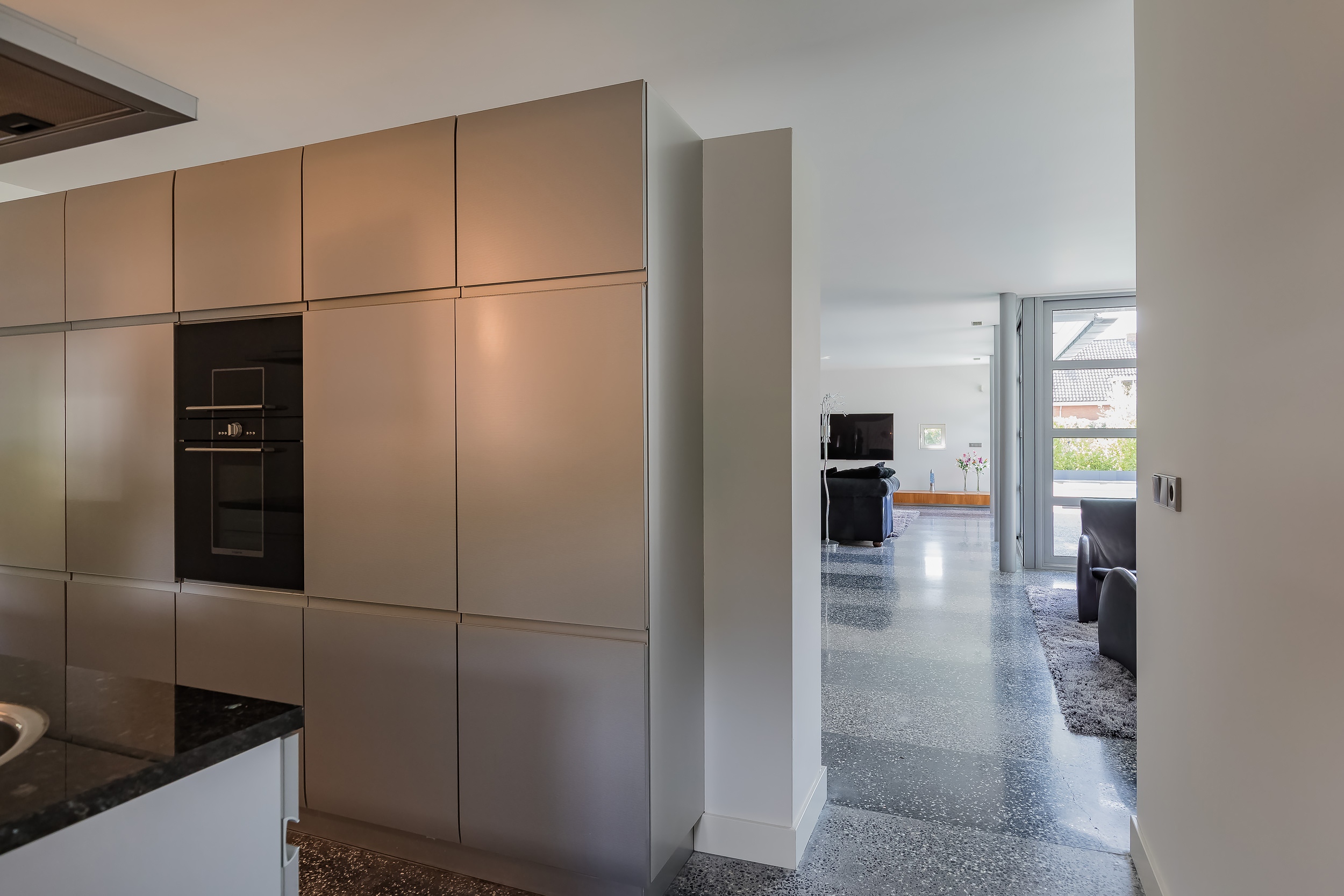 The entire ground floor has a terrazzo floor with underfloor heating. To enhance the indoor/outdoor experience, large sliding doors give access to the garden and the terrazzo floor has been extended to the outside.