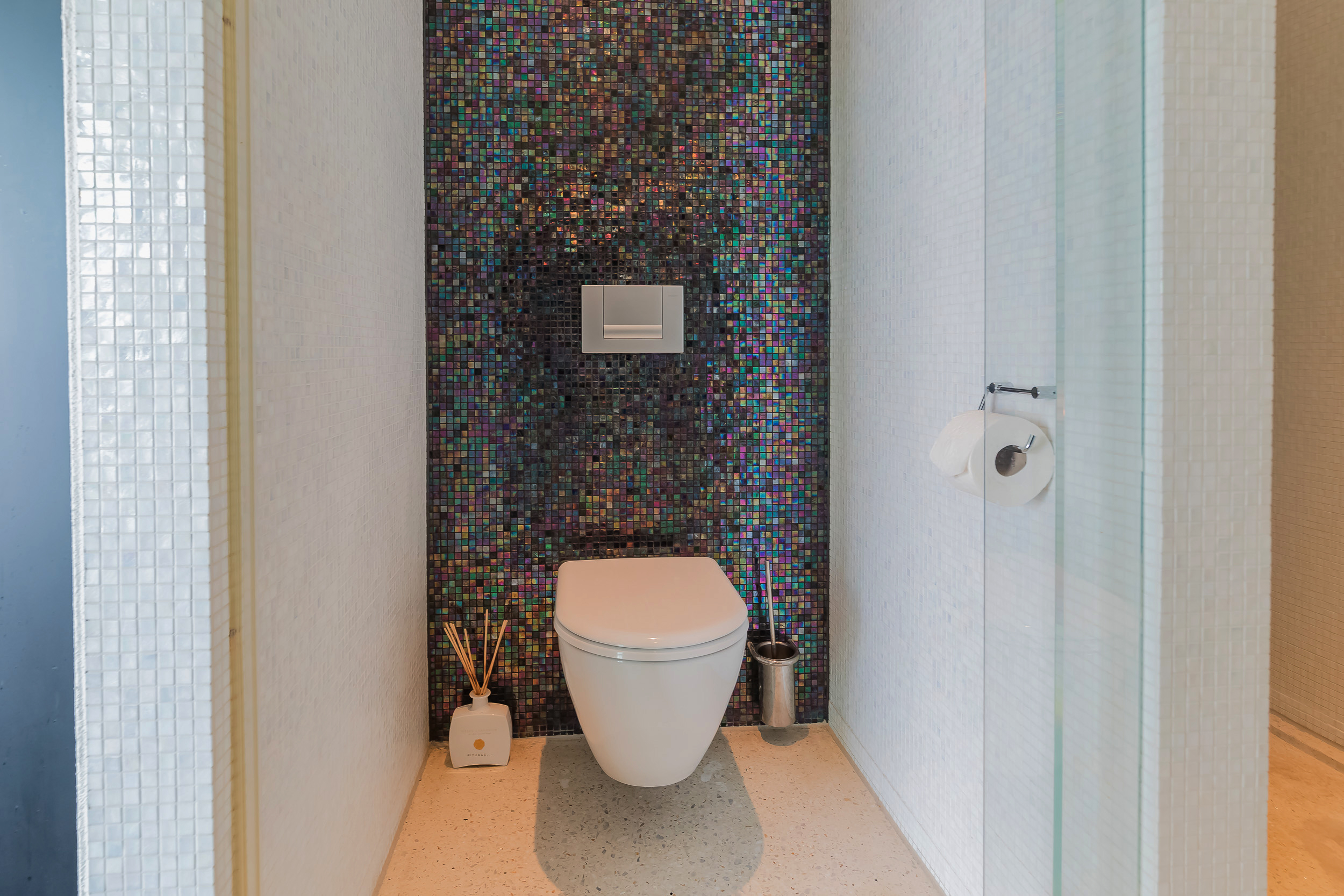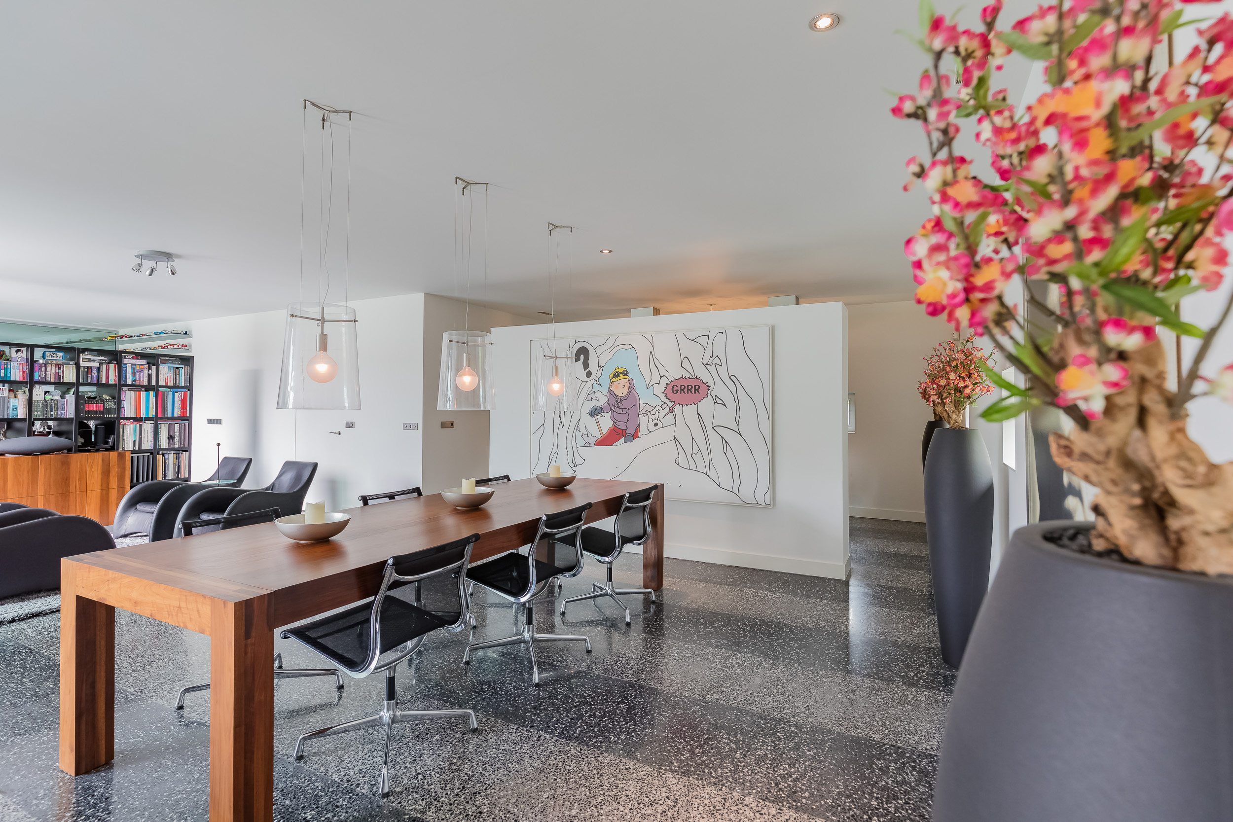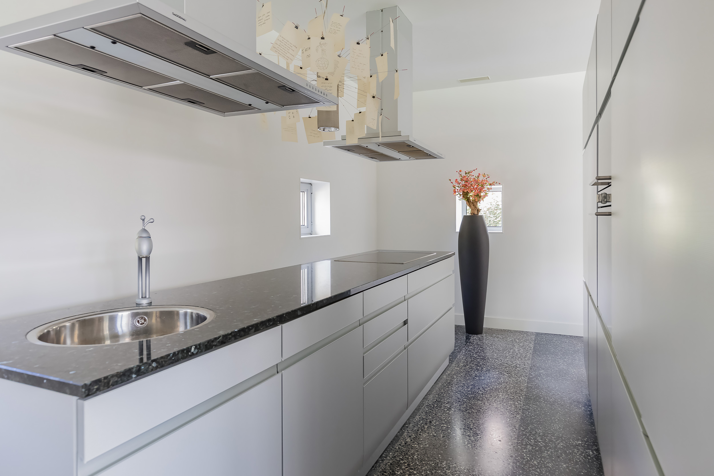 The entire ground floor has a terrazzo floor with underfloor heating. To enhance the indoor/outdoor experience, large sliding doors give access to the garden and the terrazzo floor has been extended to the outside.