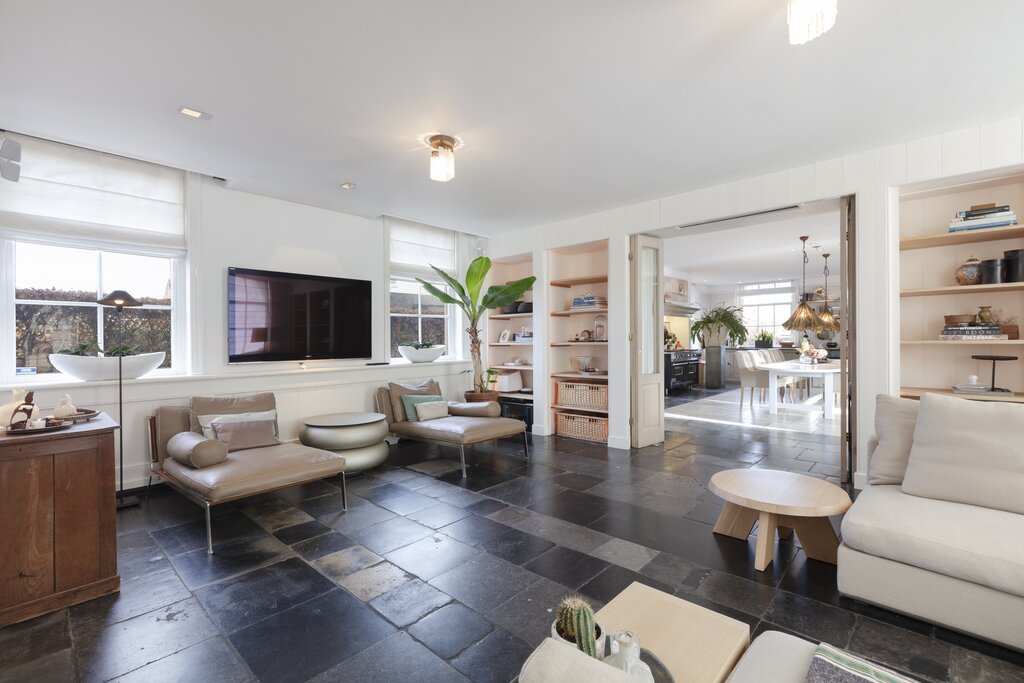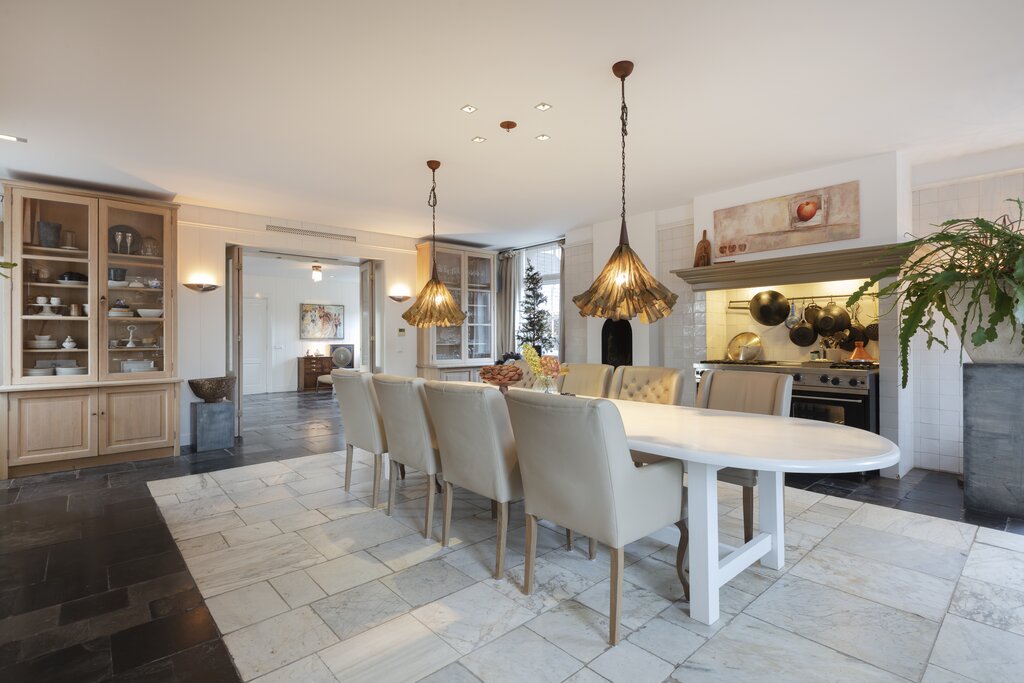 Layout: Ground floor: Stately entrance, spacious hall with marble floor, two 'rooms' on either side of the hall, are now his & her's offices, TV room/ small living room with fireplace, en-suite connected to the intermediate room (access to the wine cellar) and toilet, very generous - cozy - kitchen with the highest quality equipment. You can even fit the biggest dining table in this part of the house. A lovely 2nd living room on the garden side, is directly connected to the kitchen by double doors. Spacious back hall and 2nd toilet. Second stair case to the 1st floor.