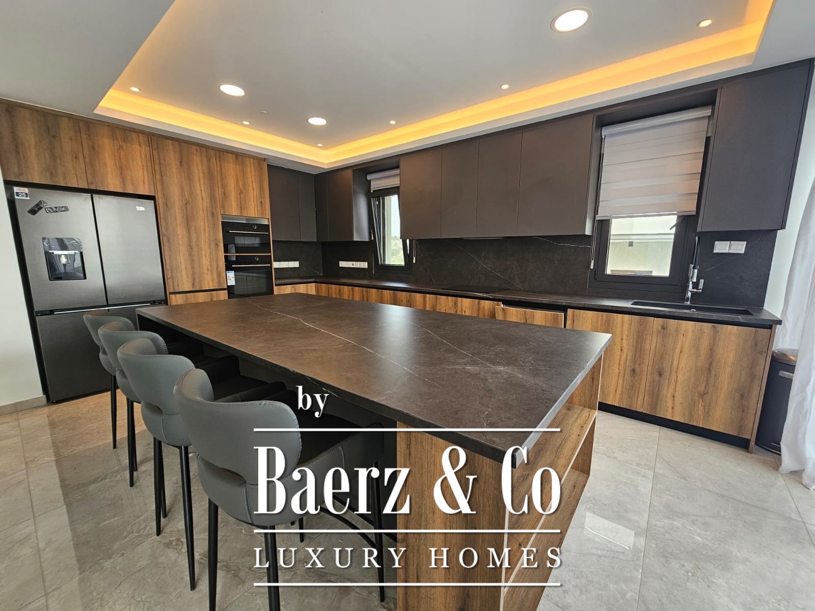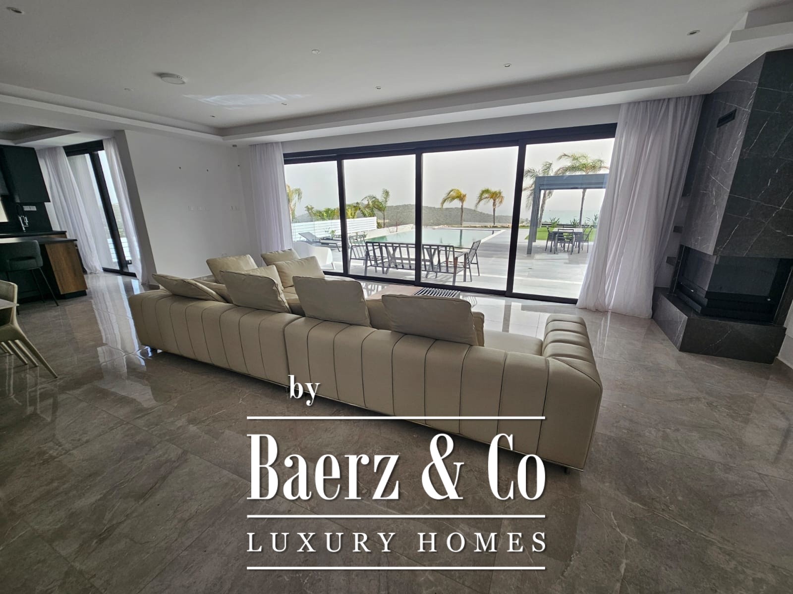 Outdoors, the landscaped garden frames a private swimming pool and BBQ area, complemented by a poolside shower and toilet. Eight parking spaces, ample storage, a security door, and a dedicated service room complete the offering. This villa defines high-end living for those drawn to the unique panorama and tranquility of Parekklisia.