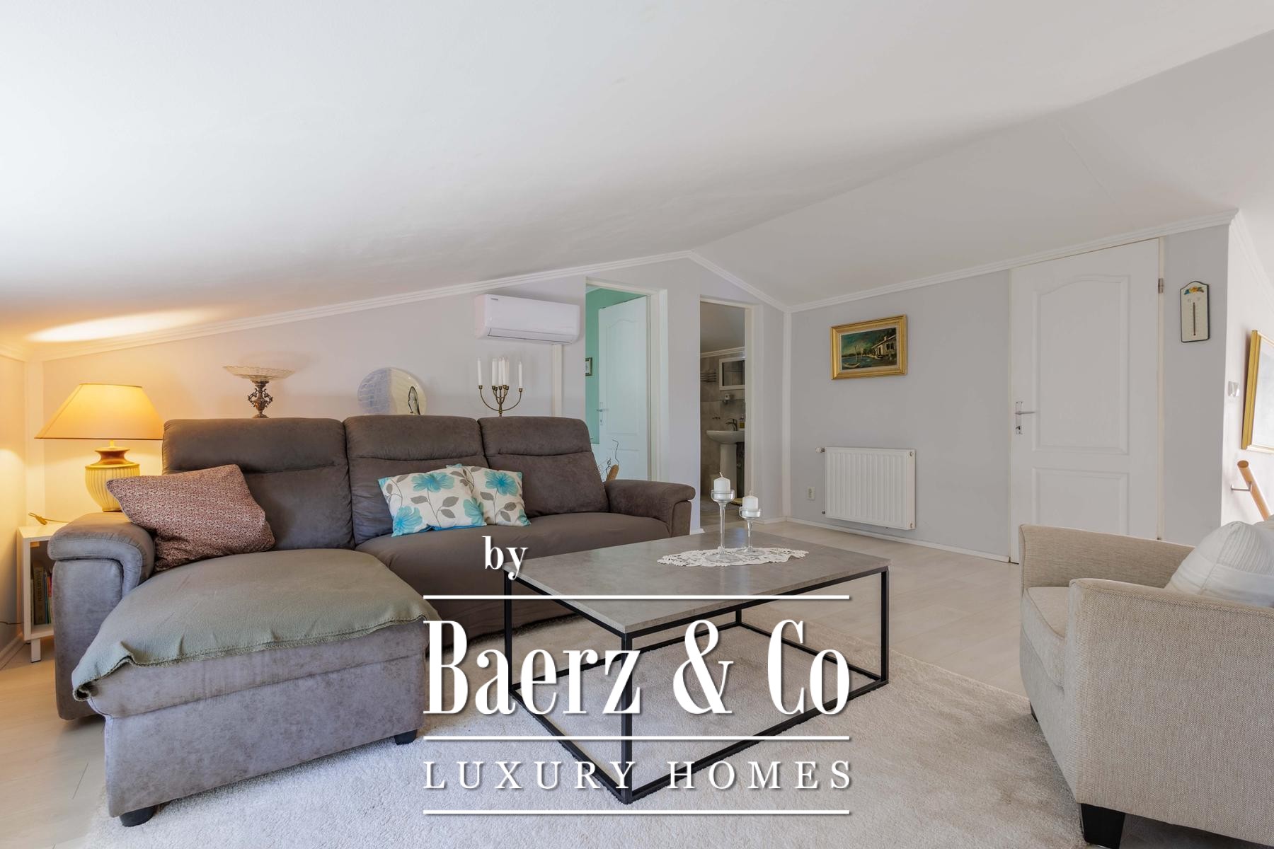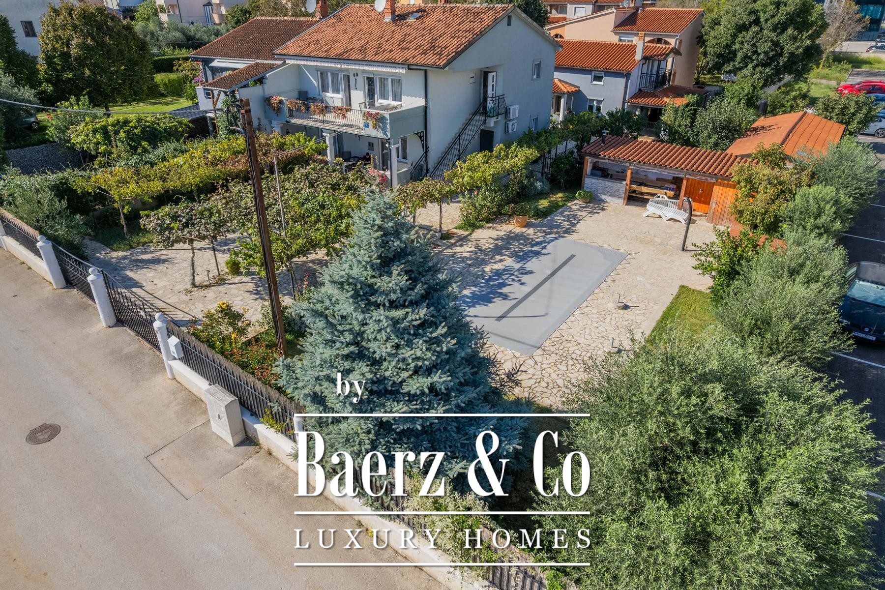 The grounds offer outdoor dining, an expansive sundeck, lush gardens and ample parking, all enclosed by a living wall that assures peace and seclusion. For those who desire, the first house with dual apartments may be acquired independently. This townhouse for sale in Pula shapes effortless gatherings and quiet retreat within a cultivated setting.