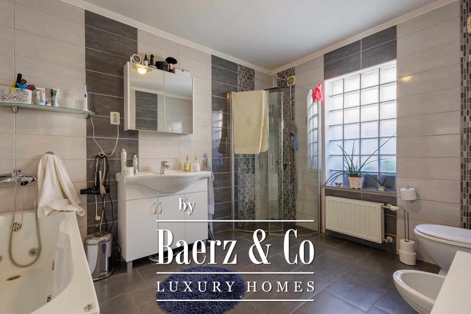Adjacent, the first residence is composed of two identical apartments. Each measures 96 m² and provides an entrance hall, kitchen with dining and living spaces, two bedrooms, utility room, bathroom and a 30 m² private terrace. Modernity is evidenced by the 2021-façade and windows, central pellet heating, and air conditioning.