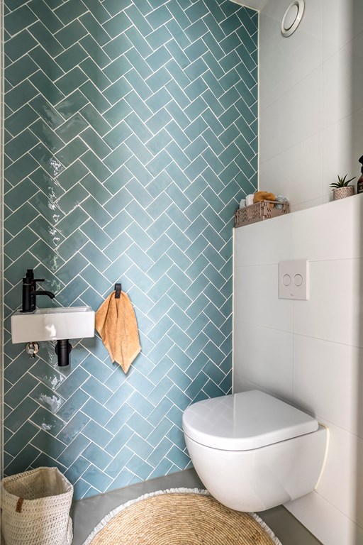 The second bathroom matches the style of the first: fully tiled, modern, and practically arranged. It features a large walk-in shower, a wall-hung toilet, and an elegant vanity unit with storage.