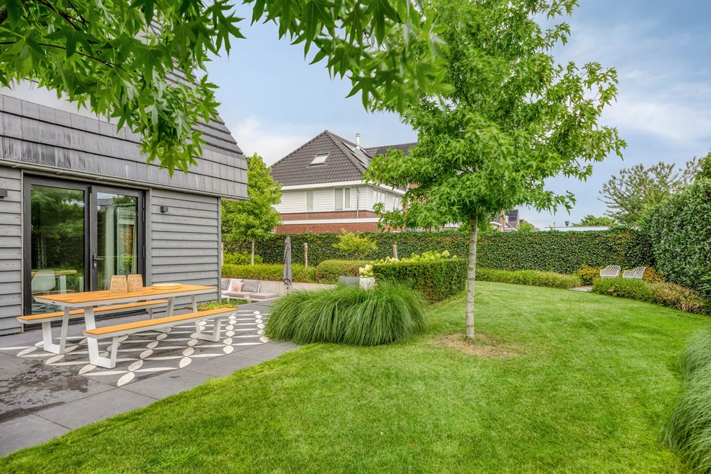 Around the house lies a beautifully landscaped L-shaped garden that offers maximum privacy and peace. From the living and dining rooms you step straight outside to several terraces where you can enjoy the sun. A cozy sunken lounge and the clever layout ensure you’ll always find the perfect place to relax at any time of day. The garden is carefully maintained and truly extends the living pleasure this home provides.