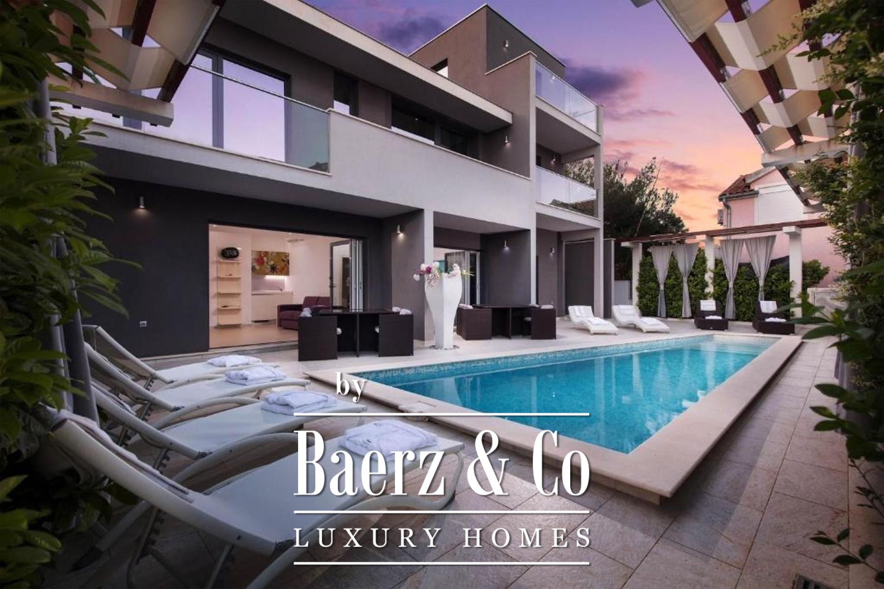 The upper level presents a luminous living space with a kitchen and dining area, two bedrooms, and two bathrooms, with each main room connecting to balconies oriented towards sea and pool views. Flexibility is integral, as the first floor can be separated into independent apartments to suit a range of lifestyles or hospitality needs. Refined finishes and premium furnishings underscore every detail, while thoughtful amenities include a tavern with barbecue, an inviting space for dining and gathering, and a sunlit yard. Three parking spaces complete the picture of relaxation and opportunity in Croatia’s coastal landscape.
