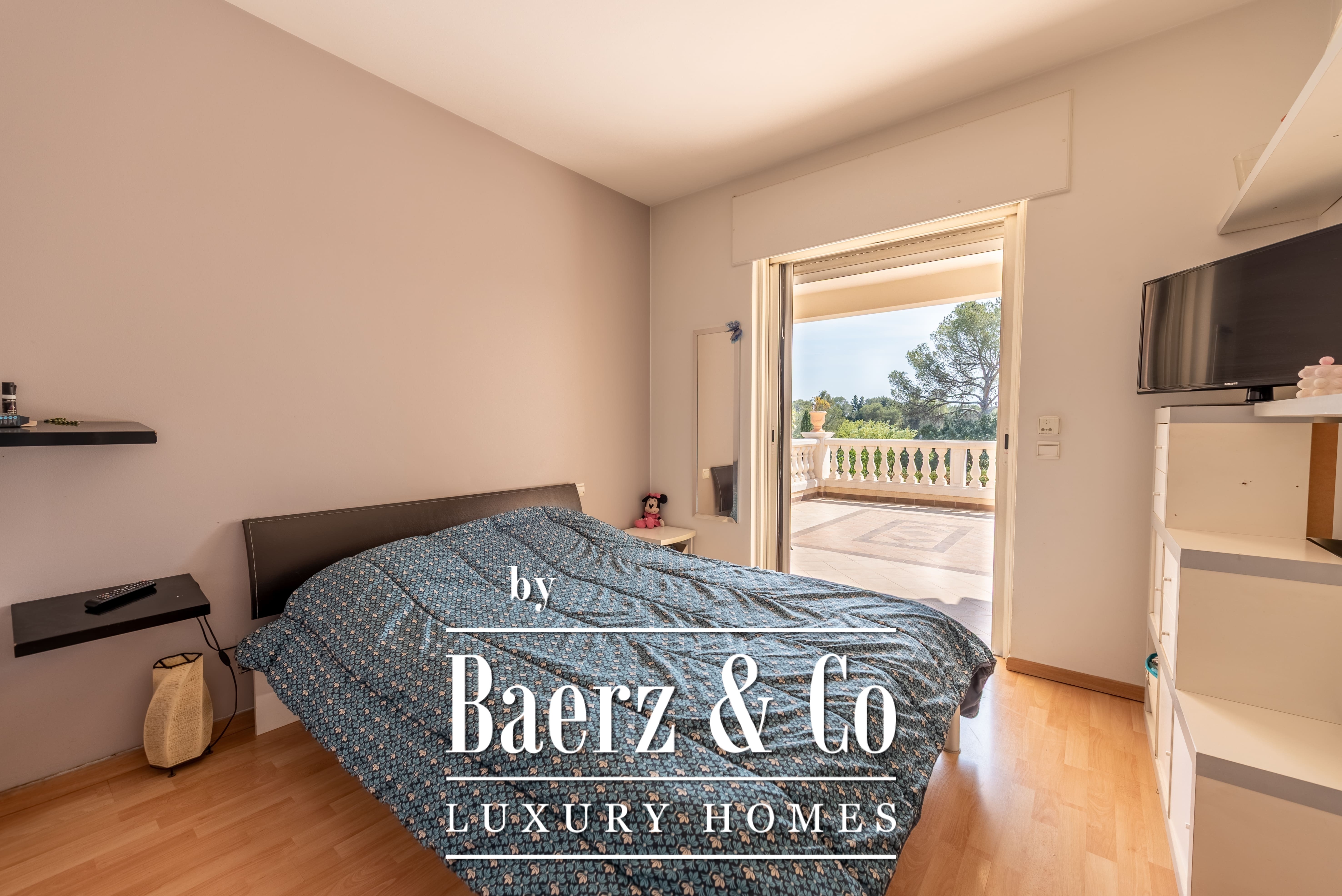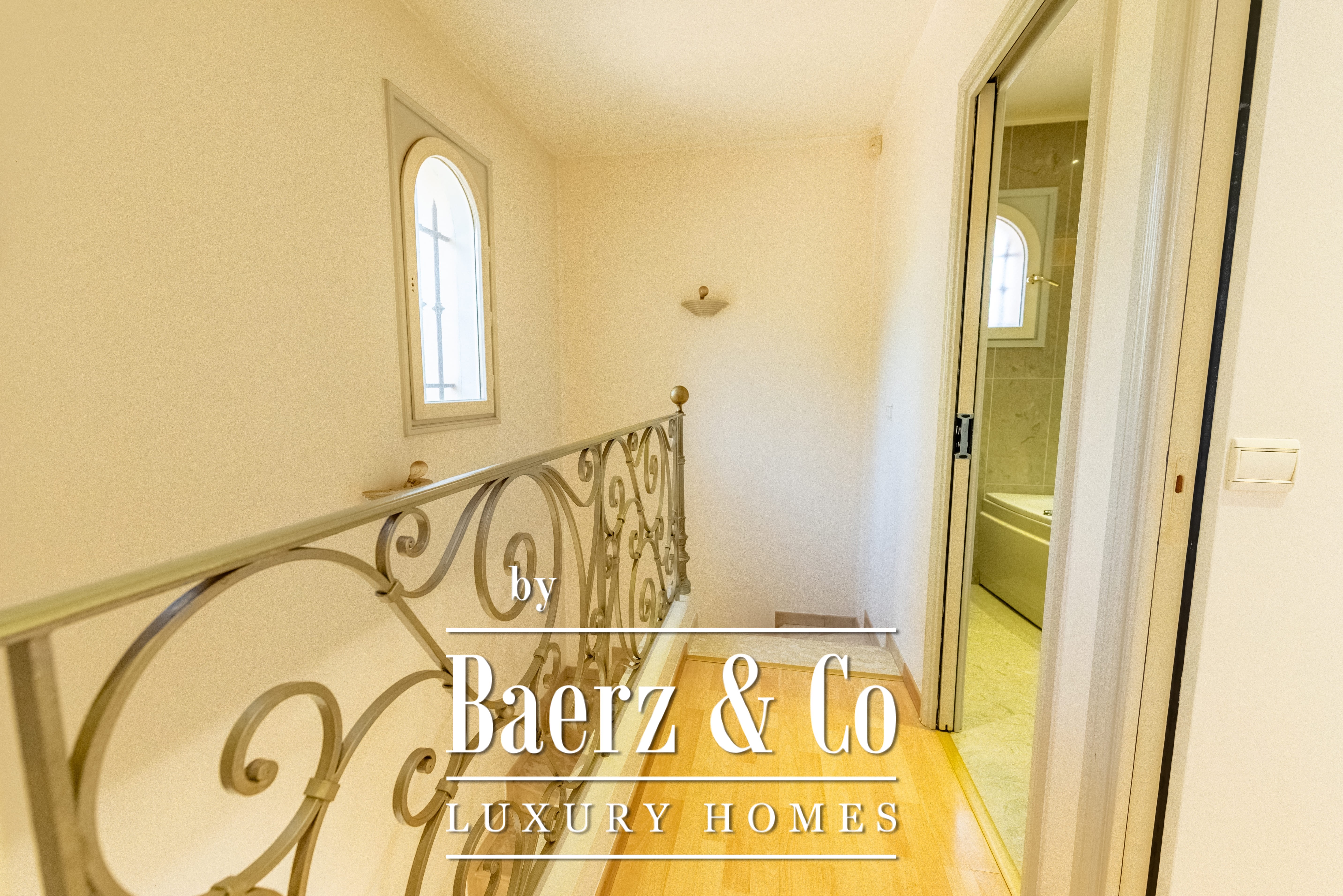 The 1,511 m² landscaped plot surrounds the home with mature gardens, multiple terraces, and an infinity pool. On the lower level, find a games room, double garage, and utility spaces. Features such as aluminum frames, central electric shutters, alarm, video surveillance, and electric gate enhance peace of mind.