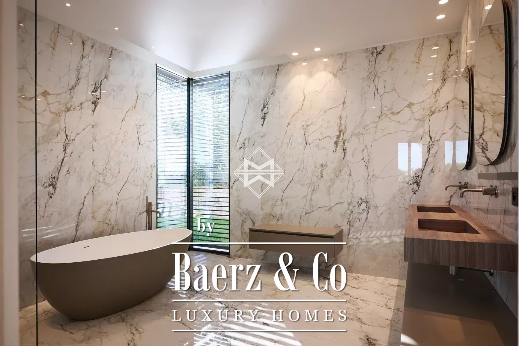 The landscaped plot of 1,401 m² unfolds with quiet precision, centered around a heated swimming pool and a fully equipped poolhouse. Subtle landscaping and flat lawns encourage seamless outdoor gatherings and moments of quiet reflection. Precision is evident throughout the property, from advanced home automation, air conditioning, and surveillance systems to a wine cellar, gym, laundry room, cinema room, and hammam. Garages accommodate up to eight cars, underscoring both convenience and discretion.