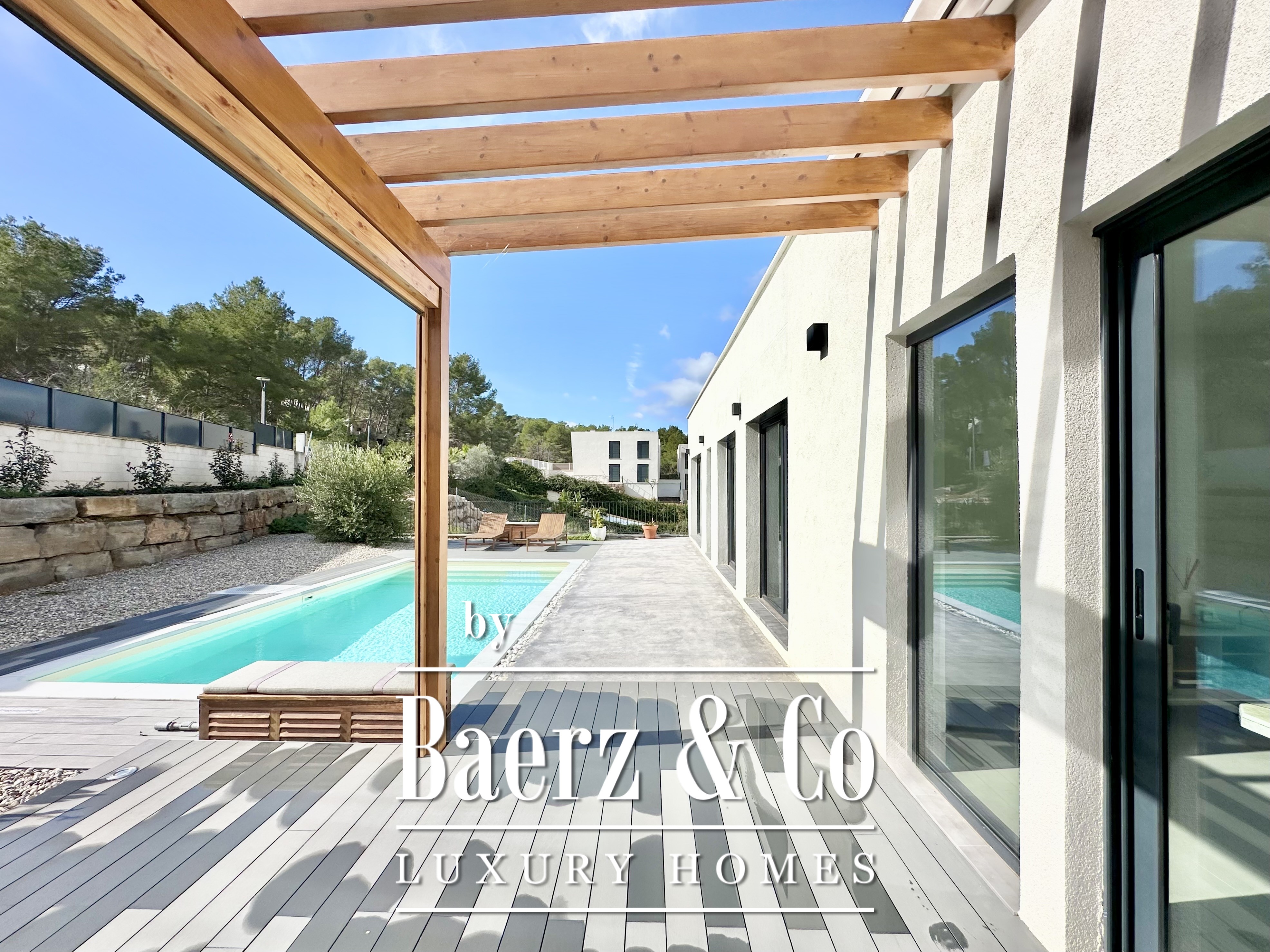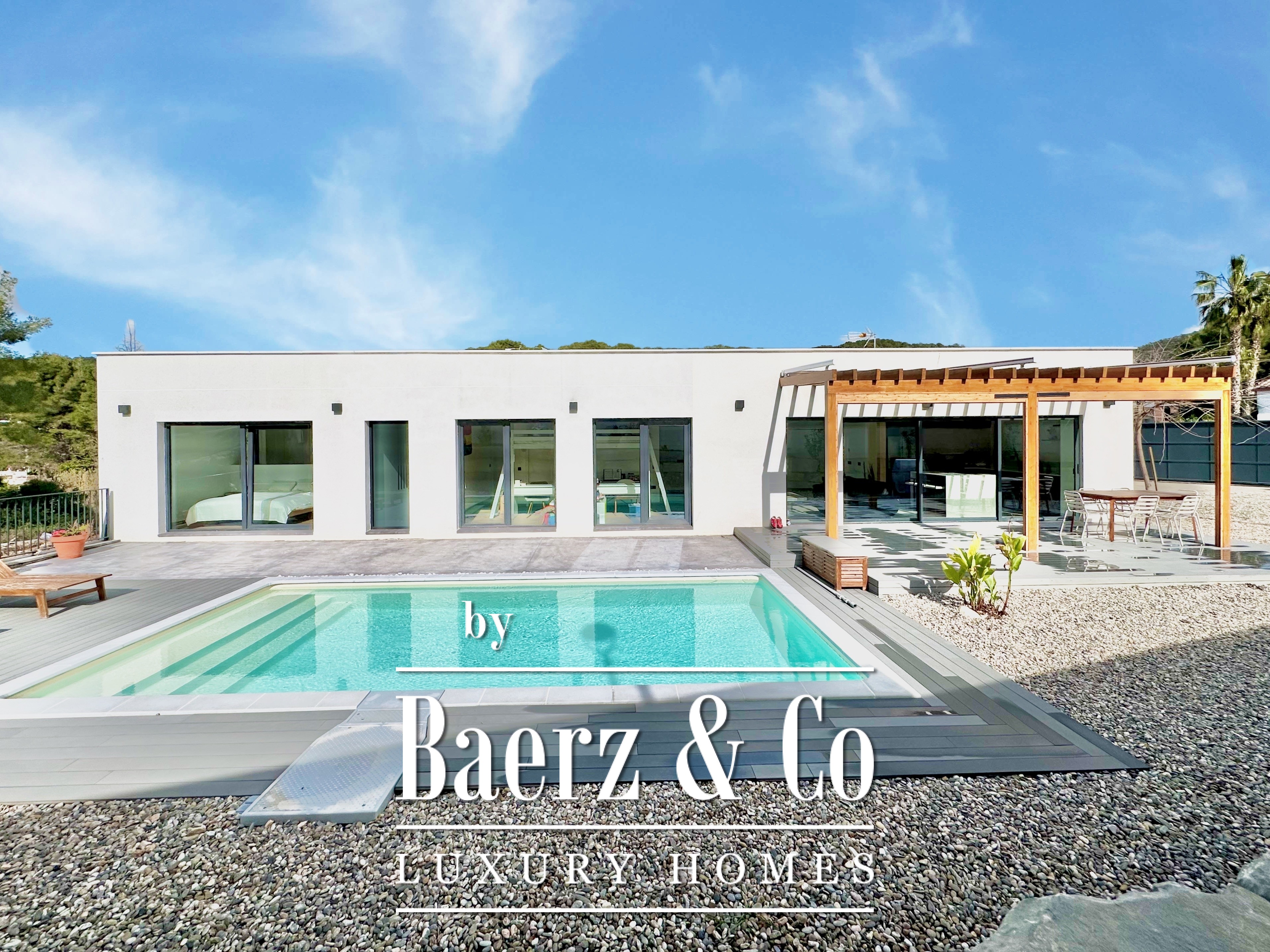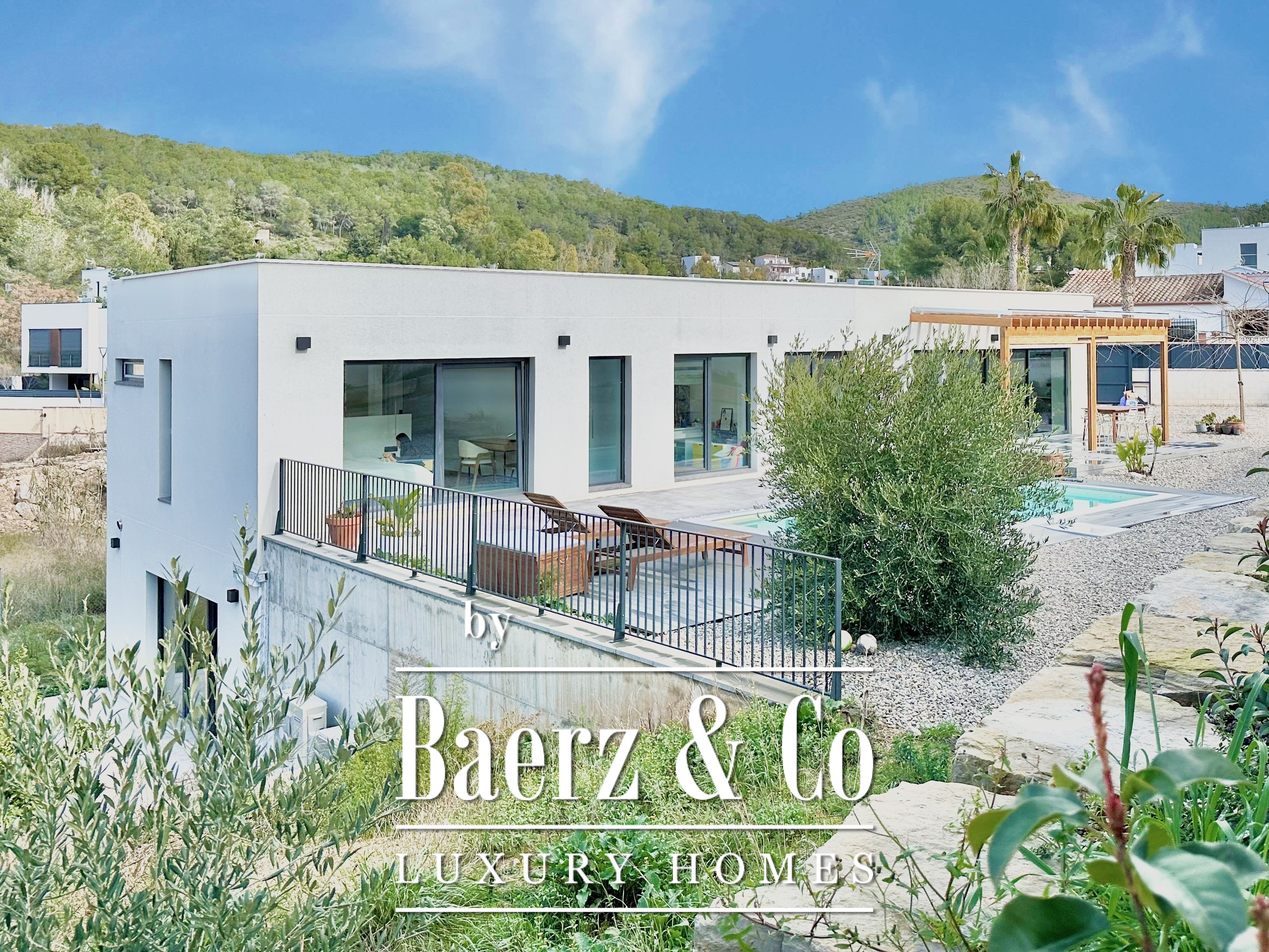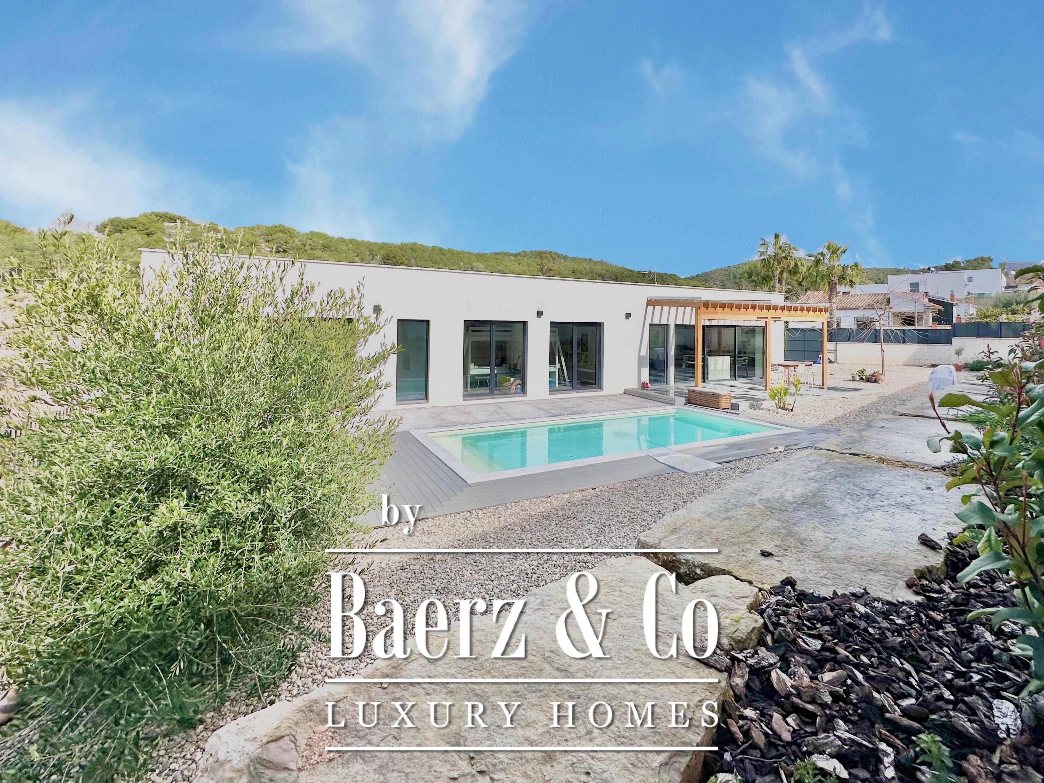 This modern villa Sitges is a newly completed, energy-efficient home designed with sustainability and contemporary minimalism at its core. Located in the tranquil Mas Alba area of Sitges, the property occupies an 860 m² double plot and offers 296 m² of living space, complemented by a 32 m² private pool and mountain views.