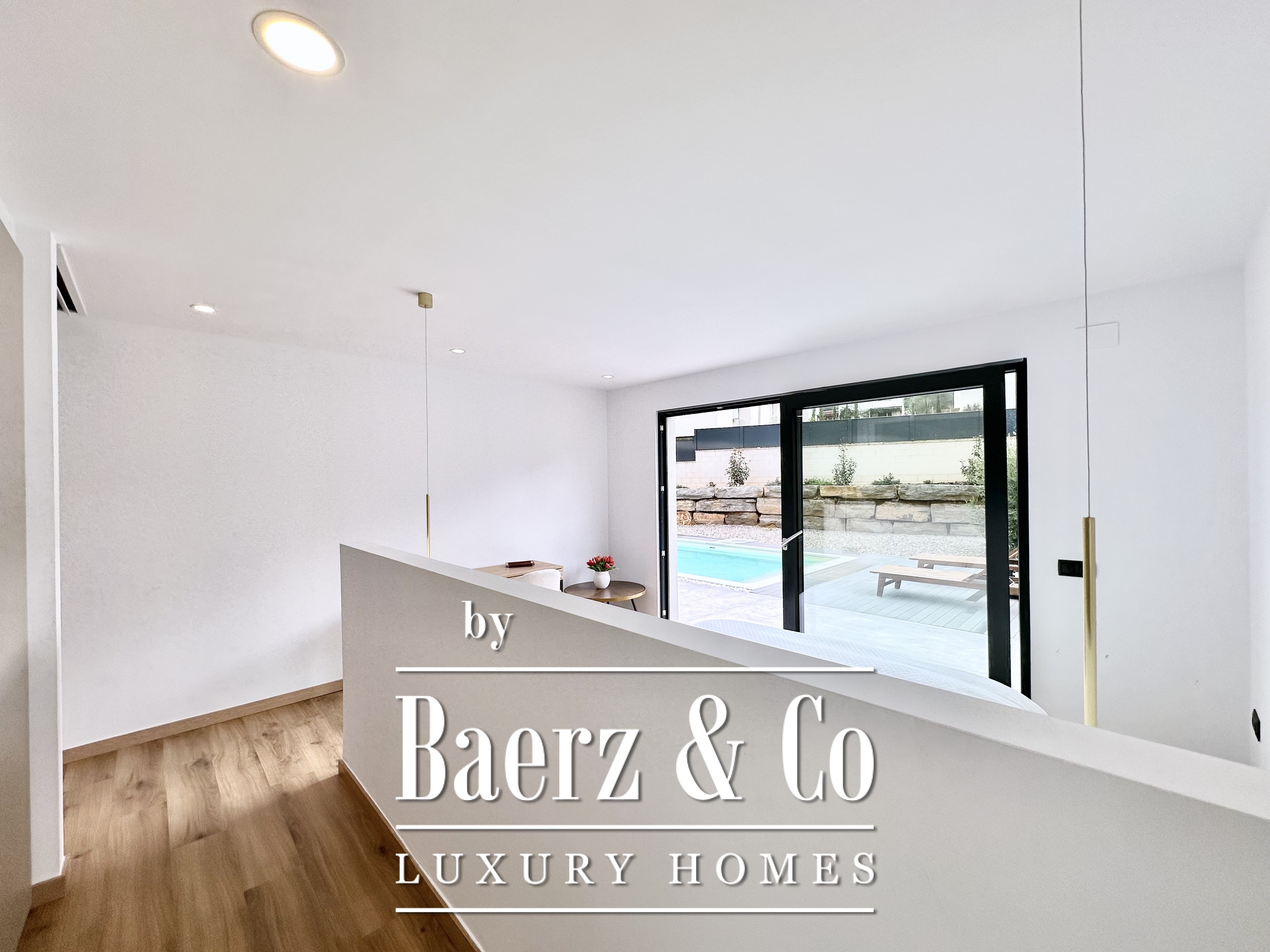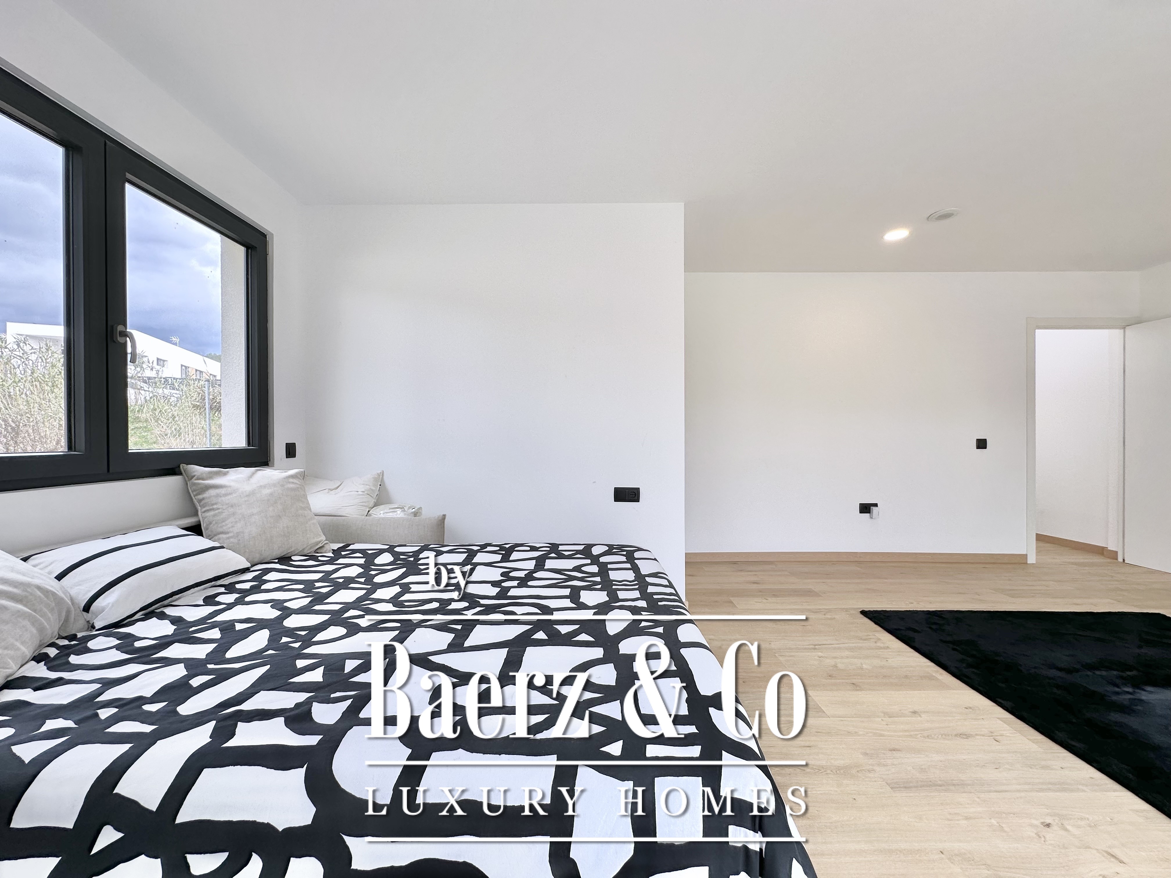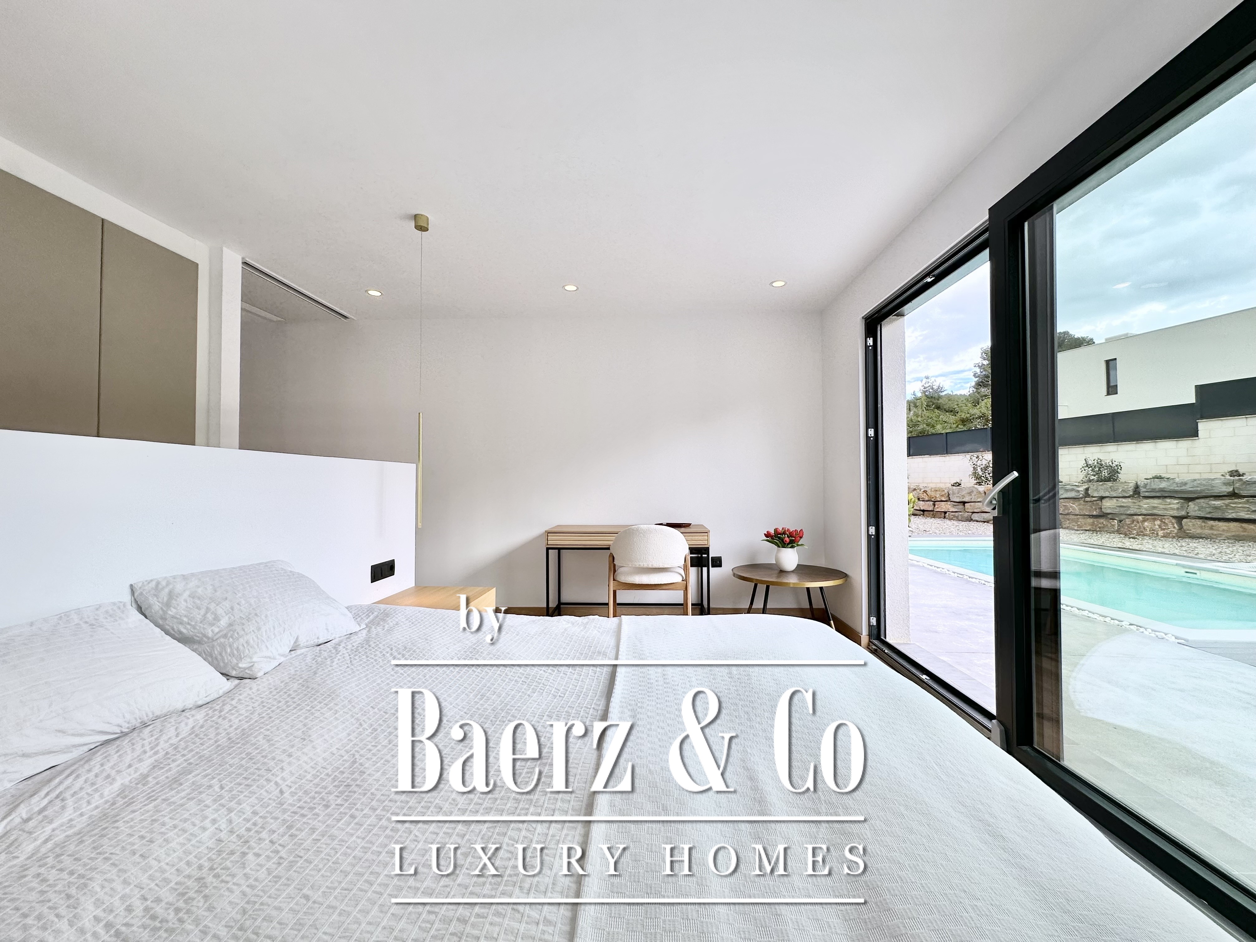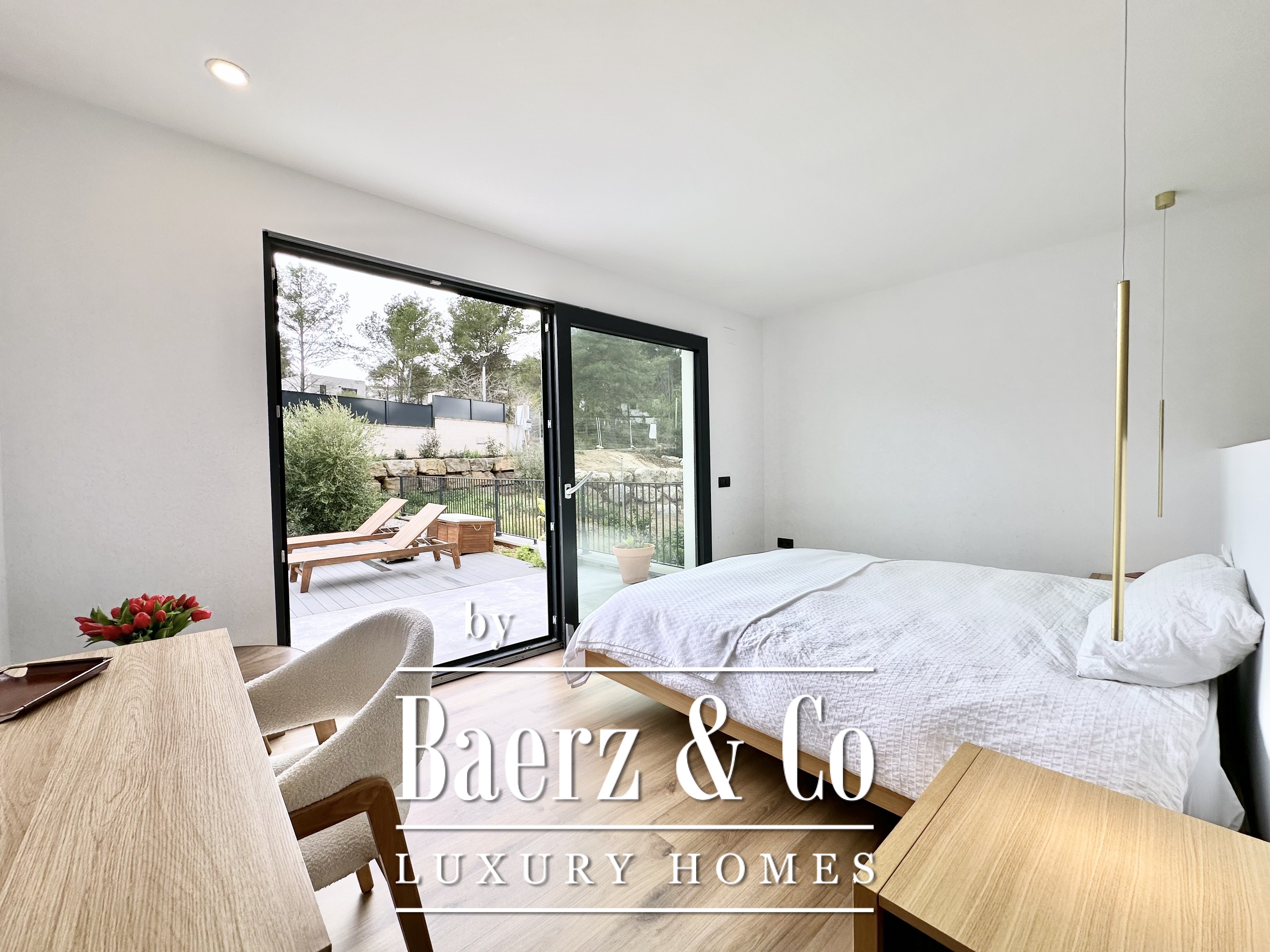 The layout is intentionally open and luminous. Floor-to-ceiling sliding glass doors in the spacious living and dining area connect seamlessly to the garden and pool, creating flow and bringing the outdoors into daily life. The modern, fully equipped kitchen is designed for both functionality and aesthetic clarity. Four bedrooms, including two en-suite, offer versatile accommodation. On the main floor, two double bedrooms share a full bath and open directly towards the pool, while the master suite features its own dressing room and private bathroom with garden views. On the lower floor, a guest suite and two large multipurpose rooms adapt to leisure, fitness, or work, alongside parking for two cars.