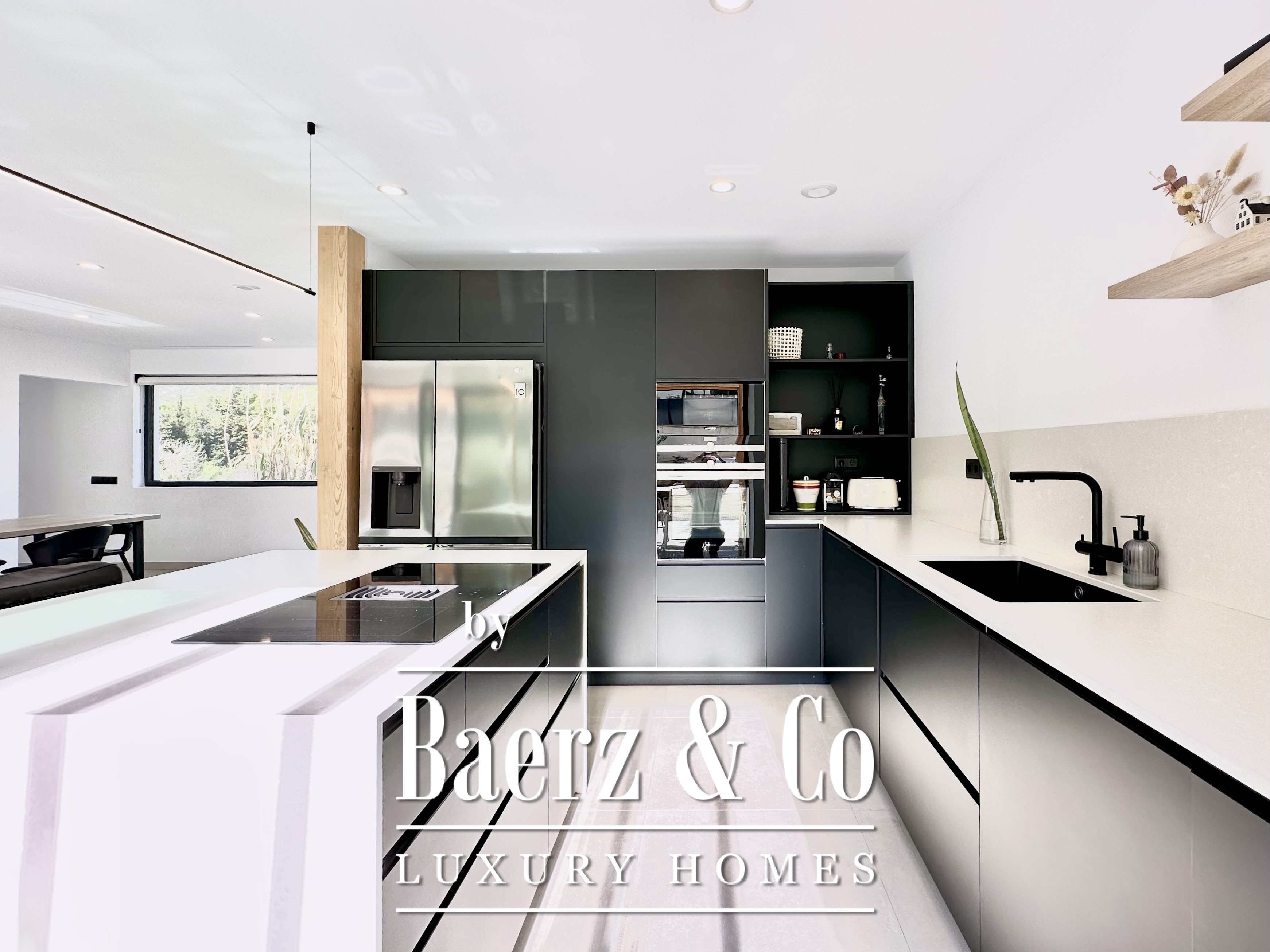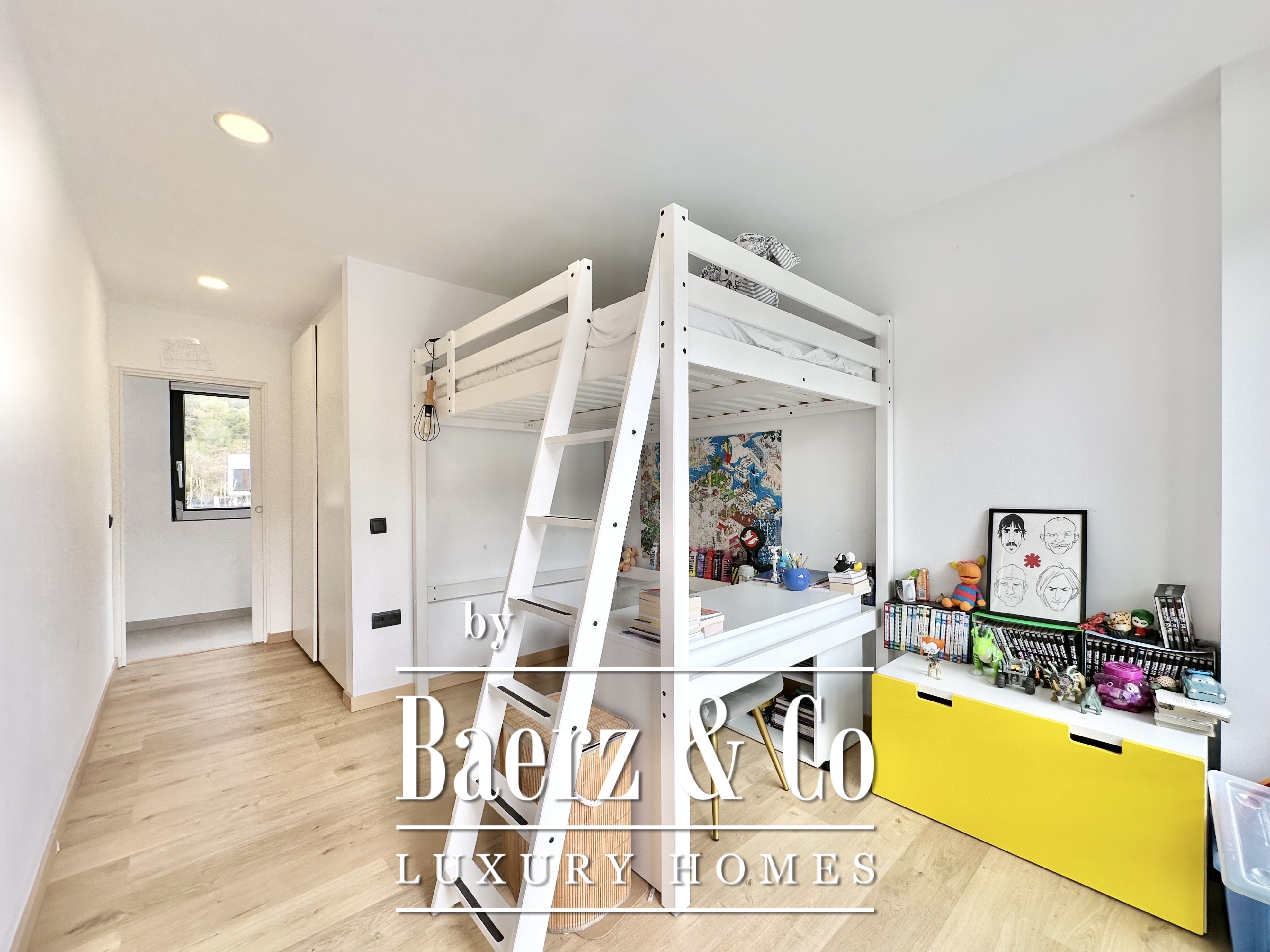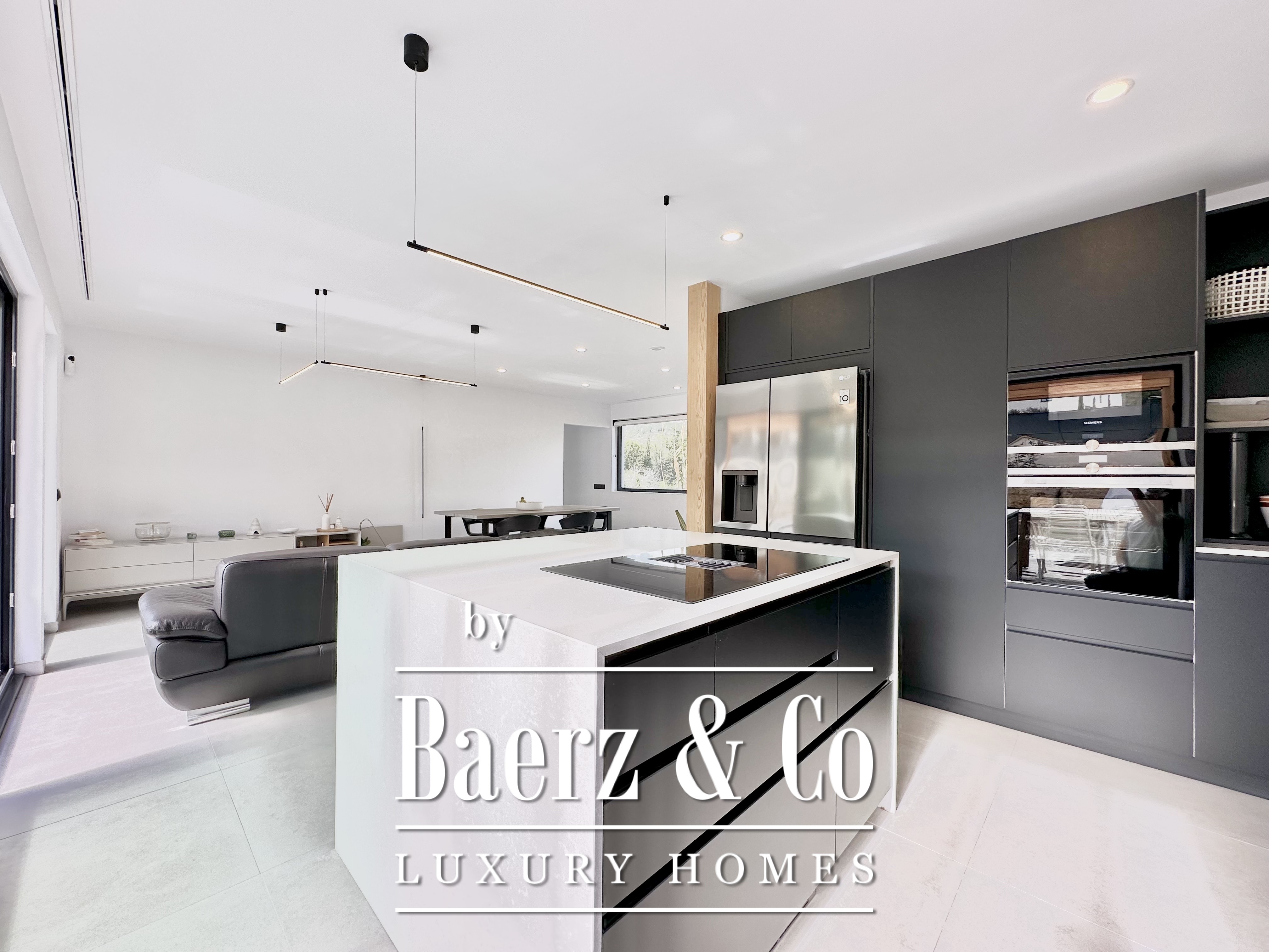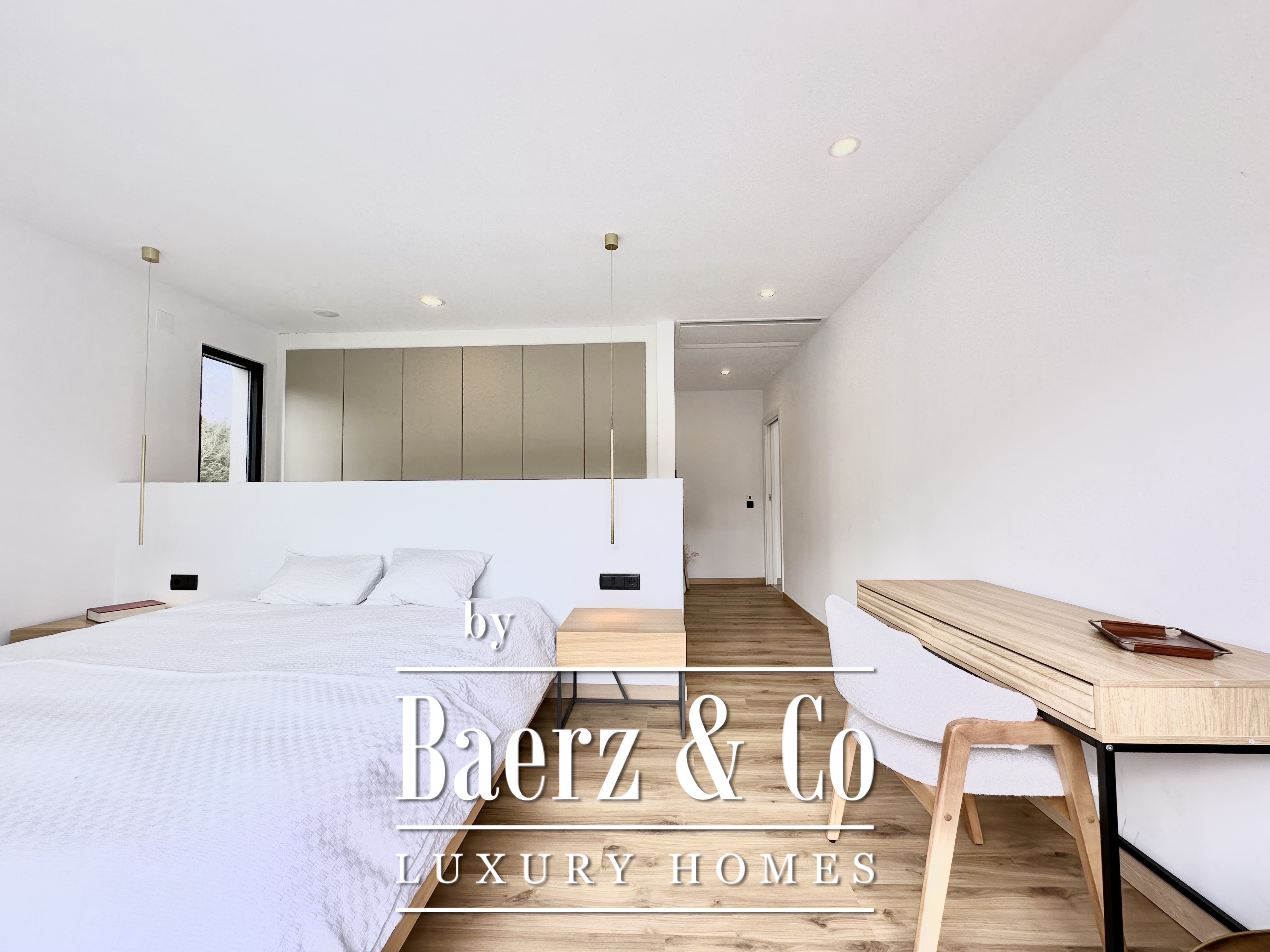 The layout is intentionally open and luminous. Floor-to-ceiling sliding glass doors in the spacious living and dining area connect seamlessly to the garden and pool, creating flow and bringing the outdoors into daily life. The modern, fully equipped kitchen is designed for both functionality and aesthetic clarity. Four bedrooms, including two en-suite, offer versatile accommodation. On the main floor, two double bedrooms share a full bath and open directly towards the pool, while the master suite features its own dressing room and private bathroom with garden views. On the lower floor, a guest suite and two large multipurpose rooms adapt to leisure, fitness, or work, alongside parking for two cars.