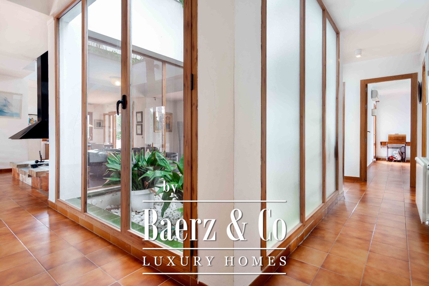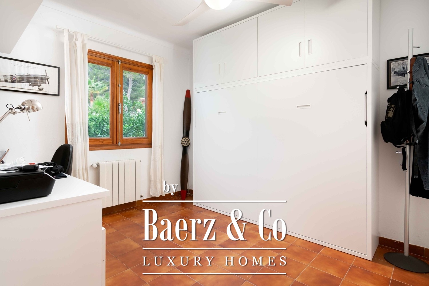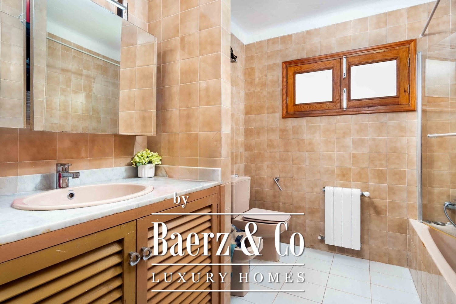 Quality materials—parquet floors, air conditioning, gas central heating—create a quietly refined atmosphere. Outside, a large freshwater pool, summer kitchen with barbecue, and thoughtfully tended gardens set the stage for relaxed Mediterranean living. The villa includes a garage and terraces, all within Santa Ponça, a coastal enclave offering a refined promenade, reliable infrastructure, and swift access to Palma in twenty minutes and the airport in thirty. This property articulates location and potential in one of Mallorca’s most desirable addresses.