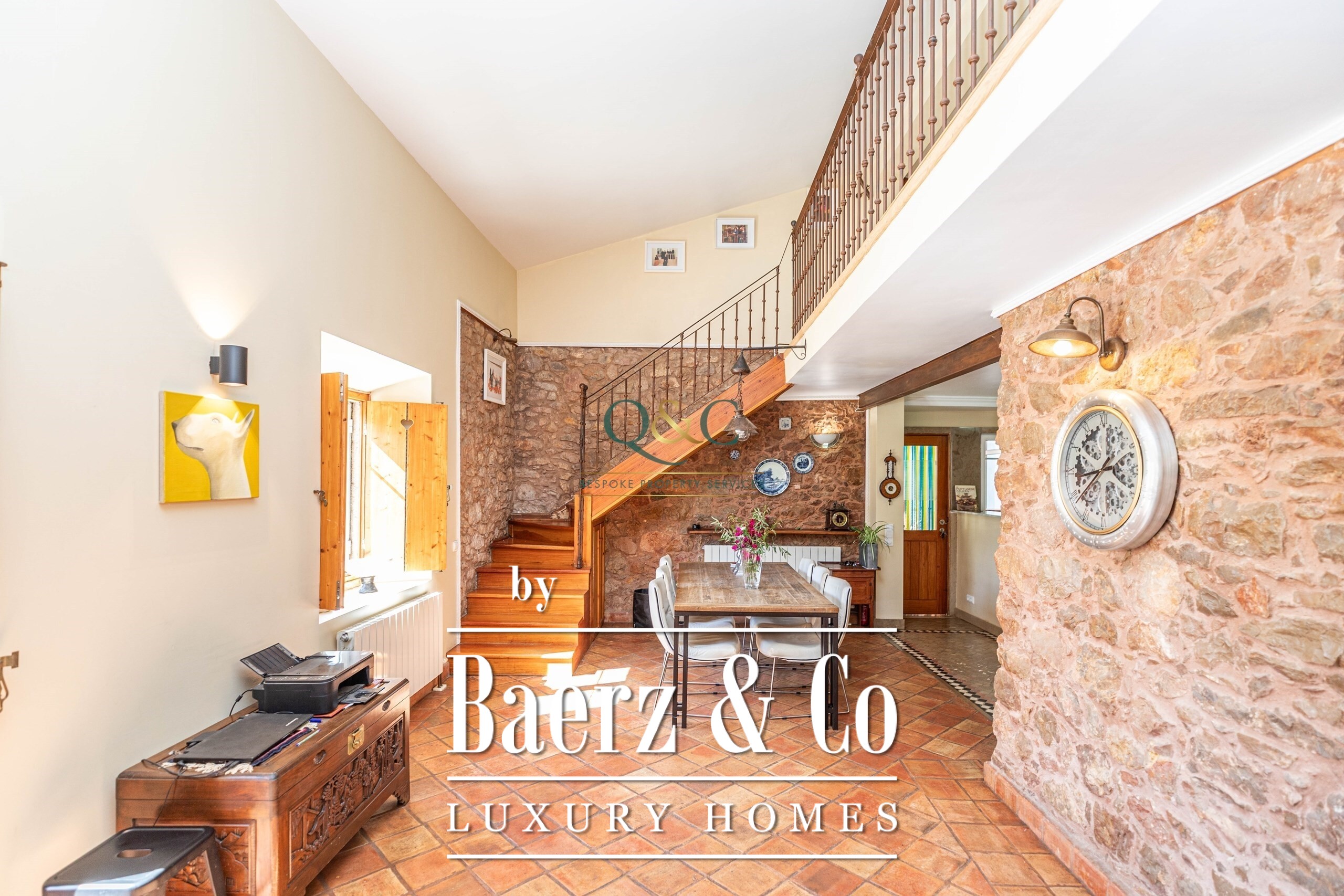 The right wing offers another equipped kitchen, dining room and living room with a cosy fireplace, three additional bedrooms, three bathrooms and plenty of storage space. The high ceilings with natural stone details create an inviting space.