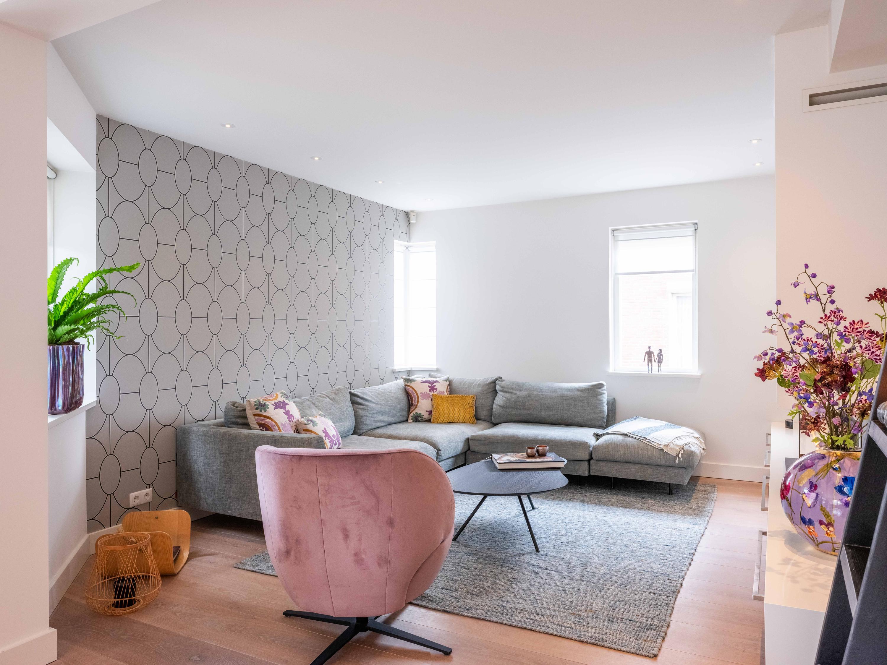 Double doors give access to the spacious L-shaped living room, where you are immediately welcomed by lots of light thanks to the large windows. In the corner is a cosy sitting area with an attractive gas fireplace. The oak laminate flooring in combination with underfloor heating throughout the ground floor creates a warm and comfortable atmosphere.