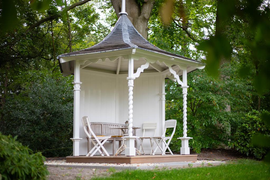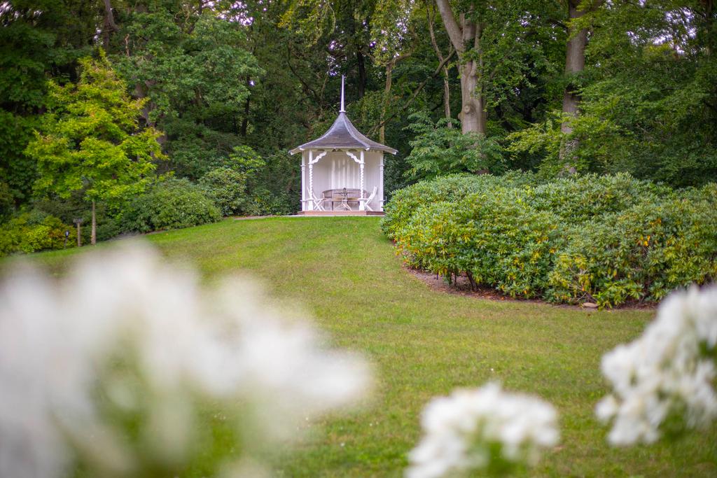 The landscaped estate extends to 5 hectares and borders the private Vegelin woodland, including a large pond. The grounds feature a terrace, a historic tea pavilion dating from circa 1900, a waterside gazebo and a carriage house with plans for conversion into additional guest accommodation or residential space with a separate driveway.